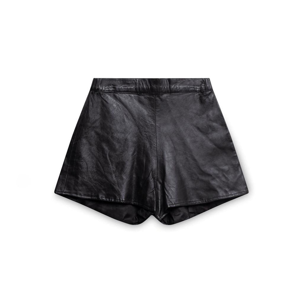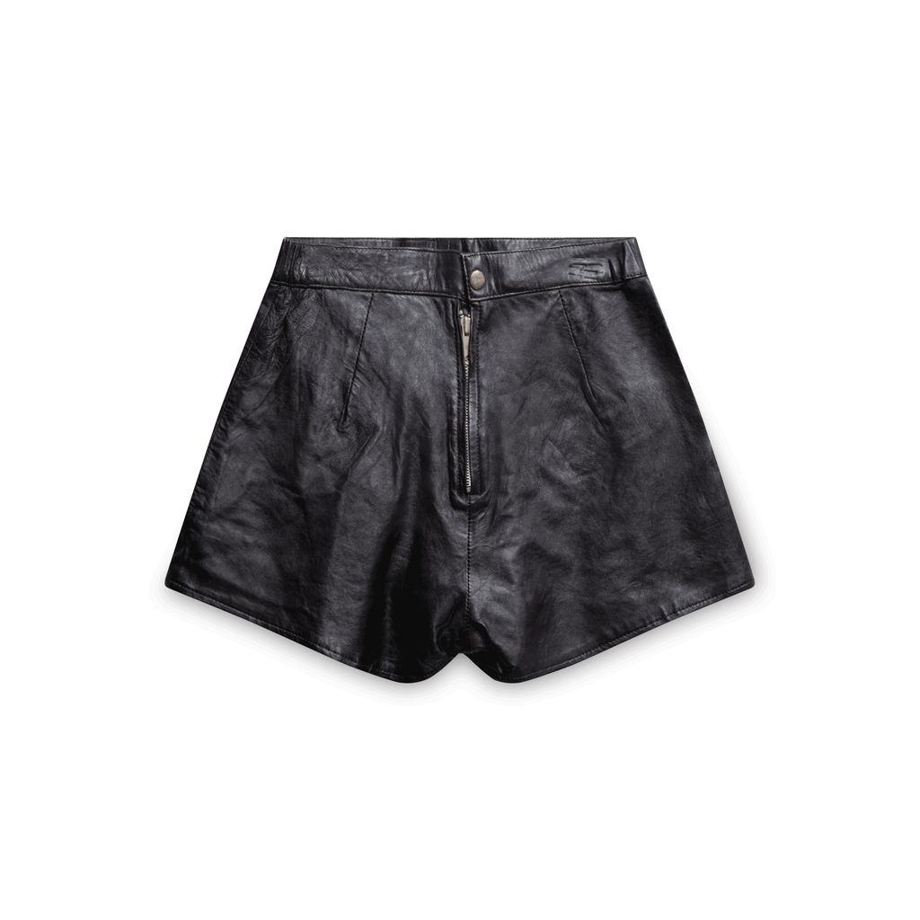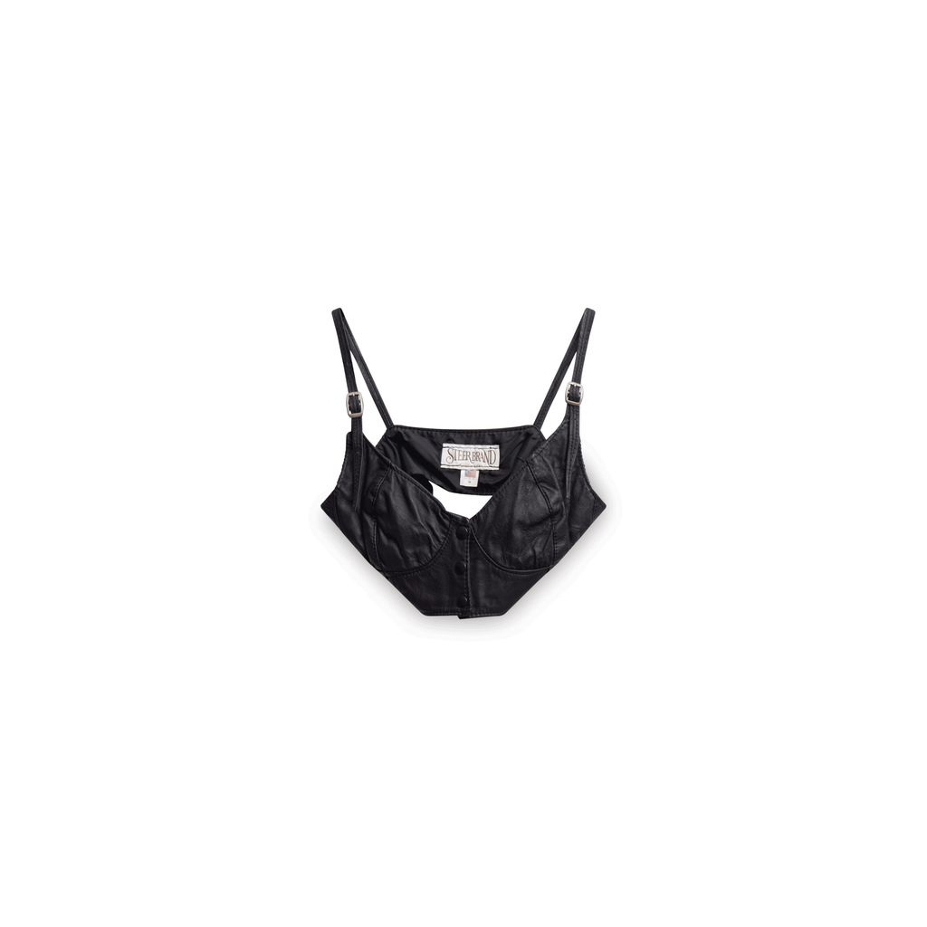 80s Black Leather Snap Front Bra & Shorts Set features top with snap closure, adjustable straps; shorts with zip and snap closure.