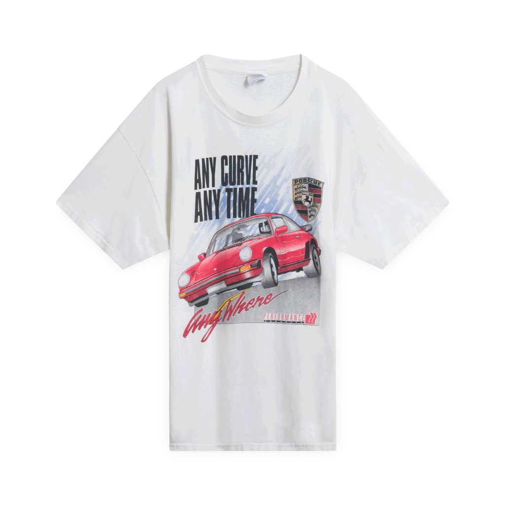 Features "Any Curve Any Time" text and Porsche emblem with car graphic on front