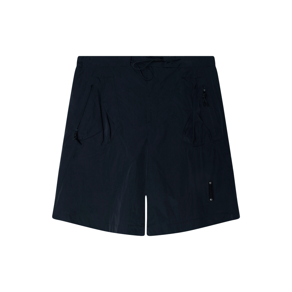 A-COLD-WALL* Black Tech Shorts features elasticated drawstring waist, 2 zip side pockets, 1 back patch pocket, and front zip closure.