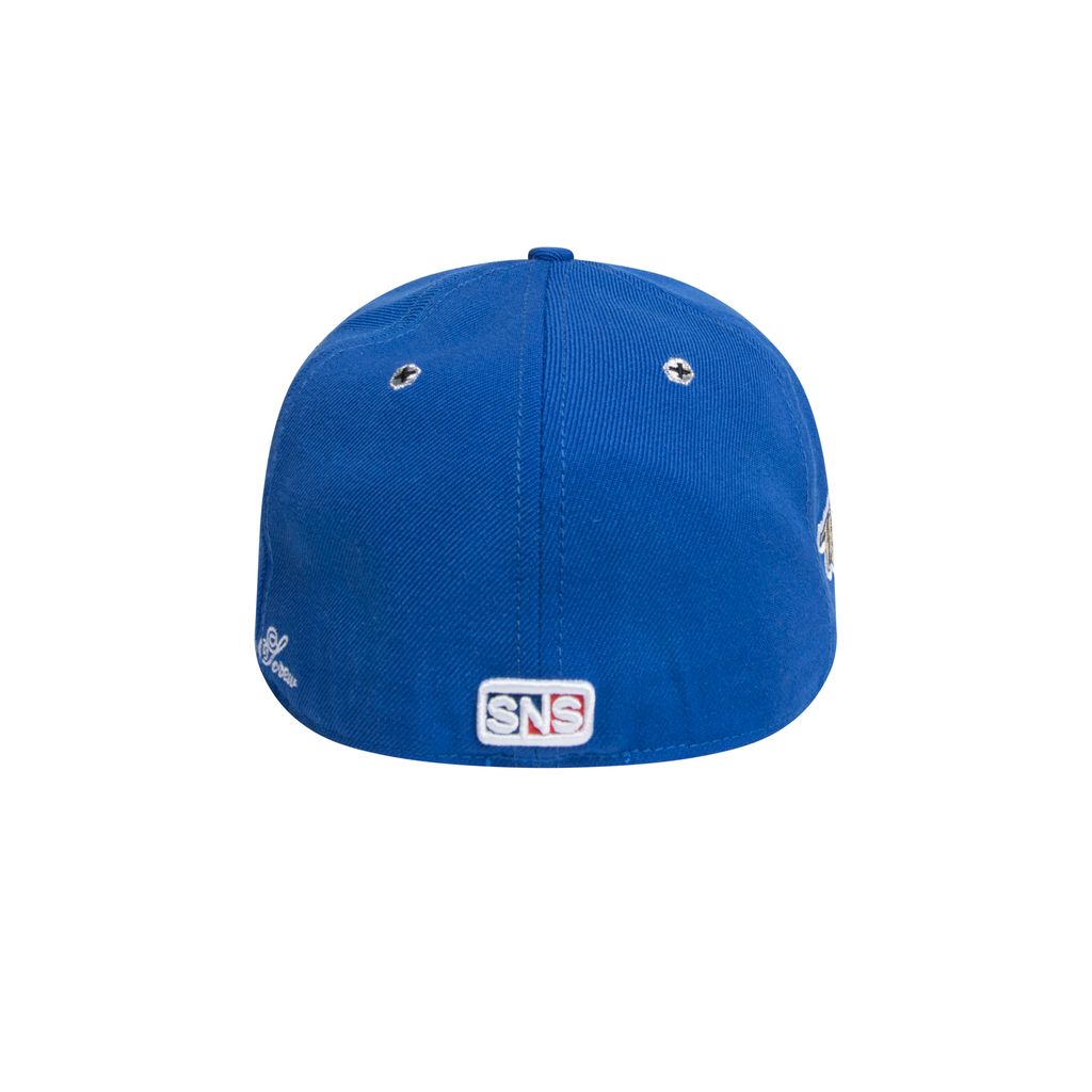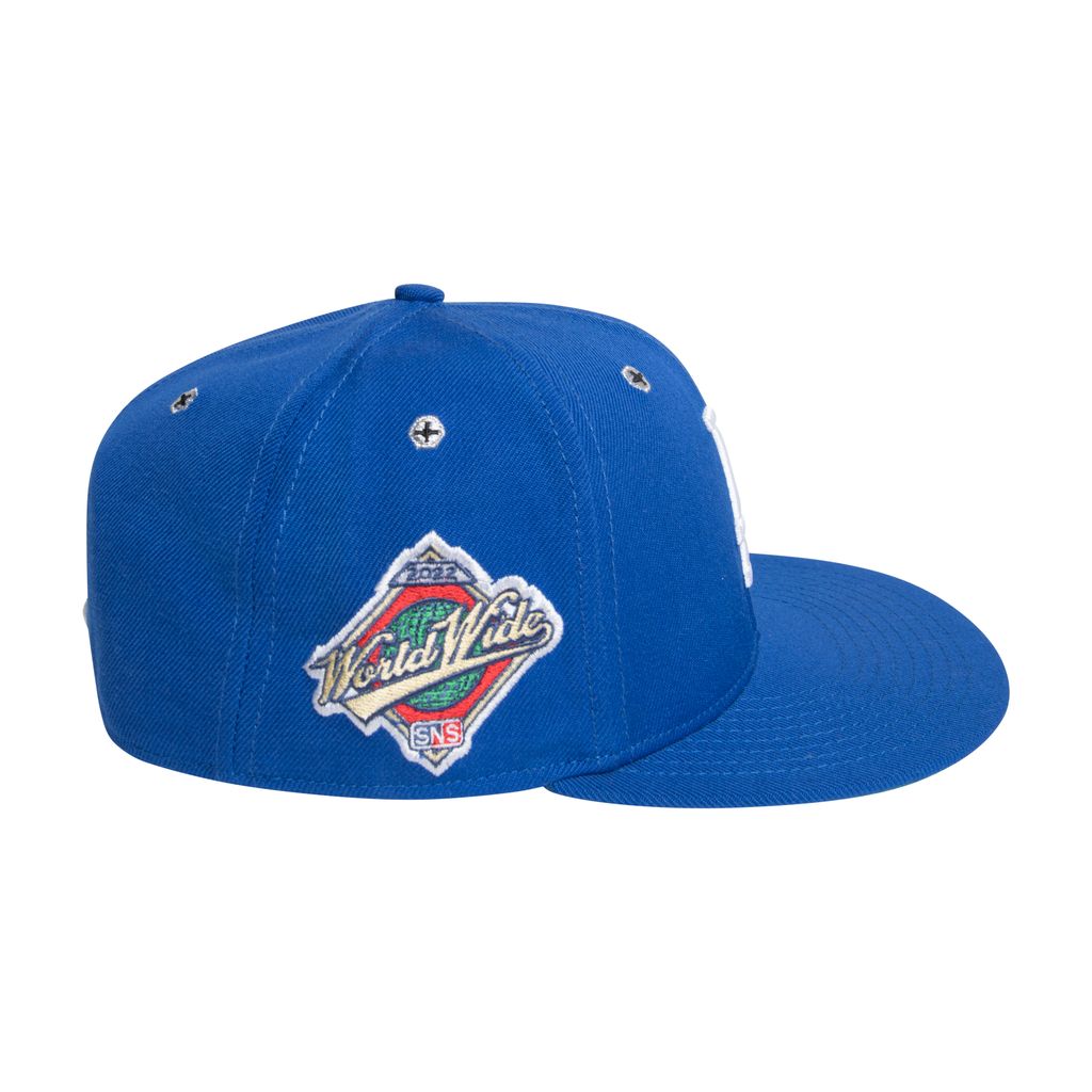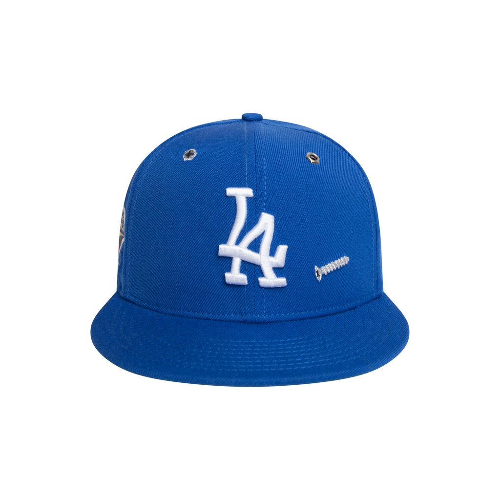 A Loose Screw Fitted - LA hat features white "LA" logo, white "A Loose Screw" Embroidery, green under brim, Pastel Yellow "Worldwide" logo, Red Woven ESENES label on a wool blue cotton blend.