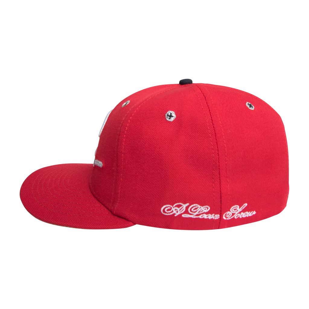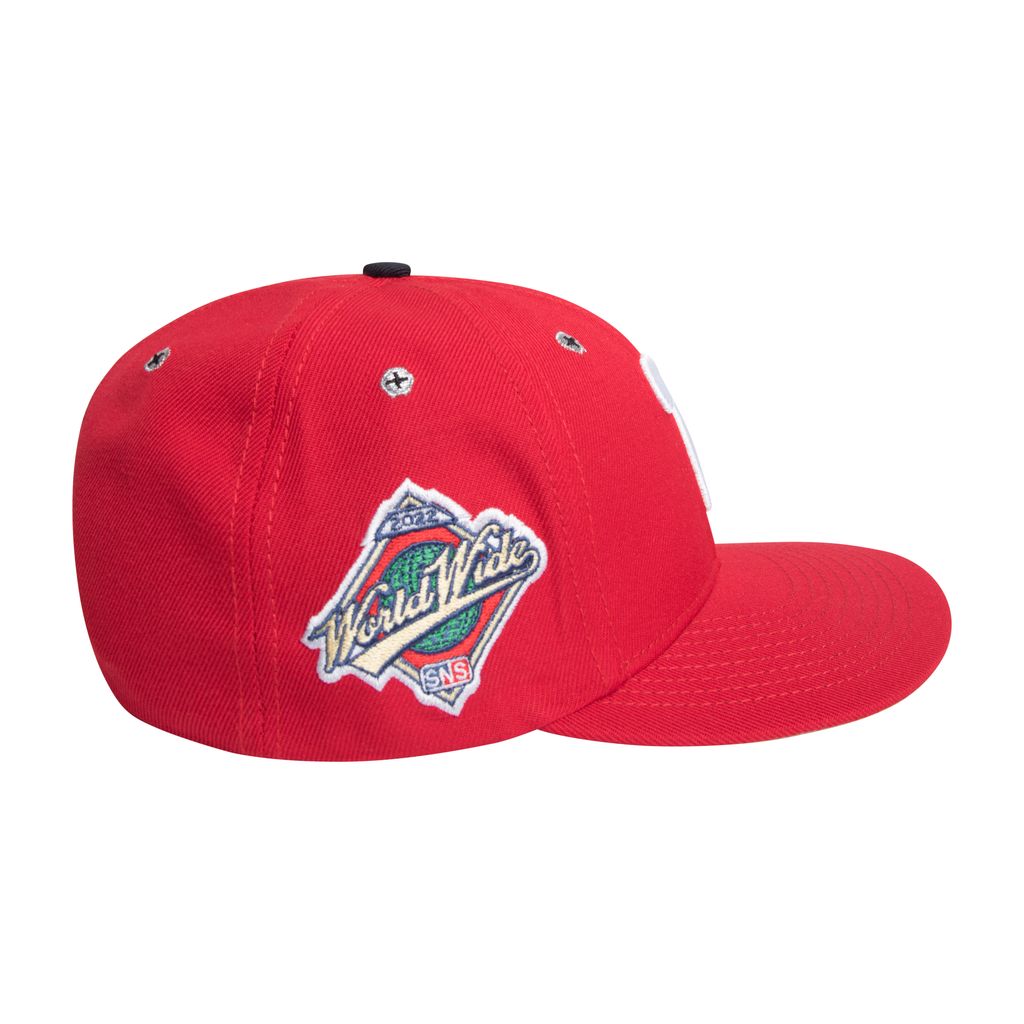 A Loose Screw Snapback - Philly Hat features White "Philly" logo, white "A Loose Screw" Embroidery, grey under brim, Pastel Yellow "Worldwide" logo, Red Woven ESENES label on a red wool/cotton blend.