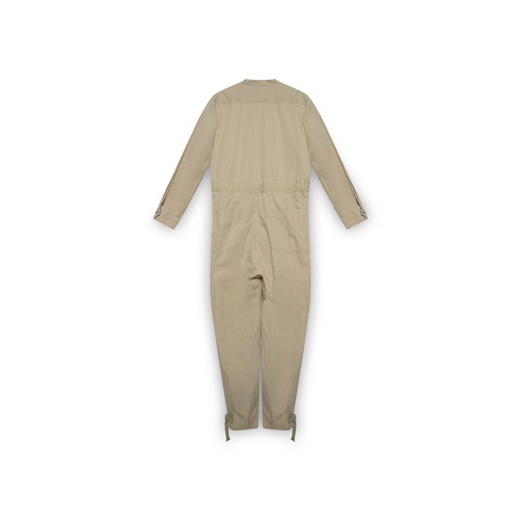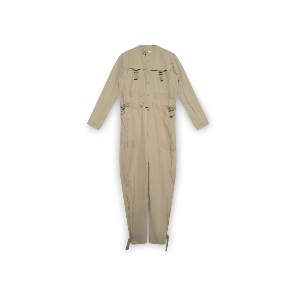 Abraham Anaheim jumpsuit features six pockets, rings details at chest, hems, and waist, mandarin collar, button closure at front from top to waist, and zipper closure from waist down.