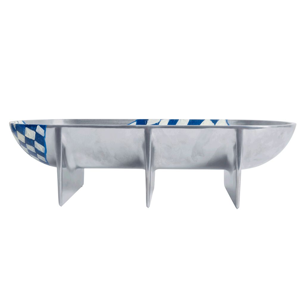This collab bowl specifically features a blue avant-garde checkered pattern hand-painted by Bella herself.
