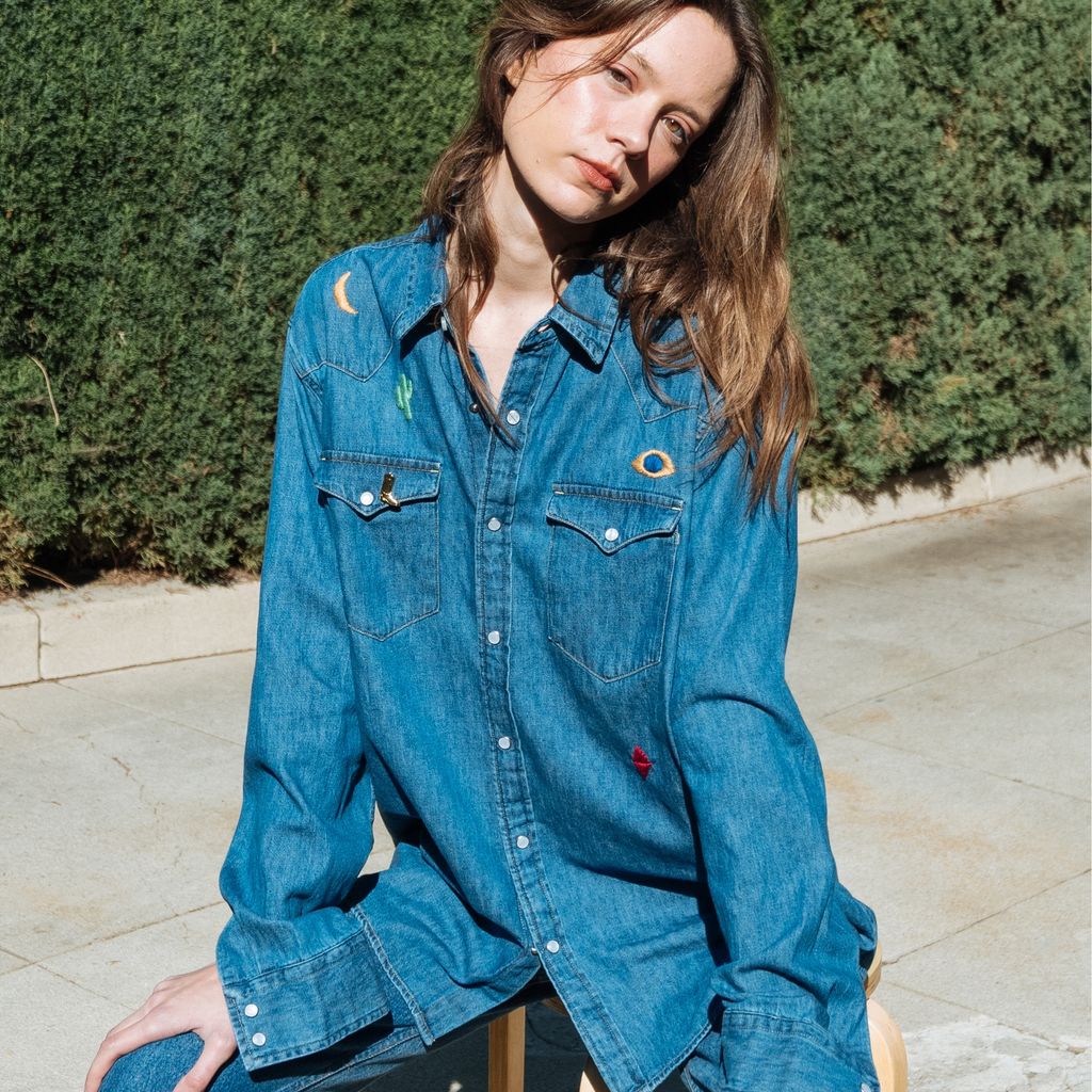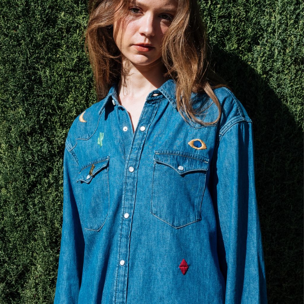 Denim shirt with hand embroidery at the front and the back. Hand embroidered in Aspen, Colorado. 100% cotton.