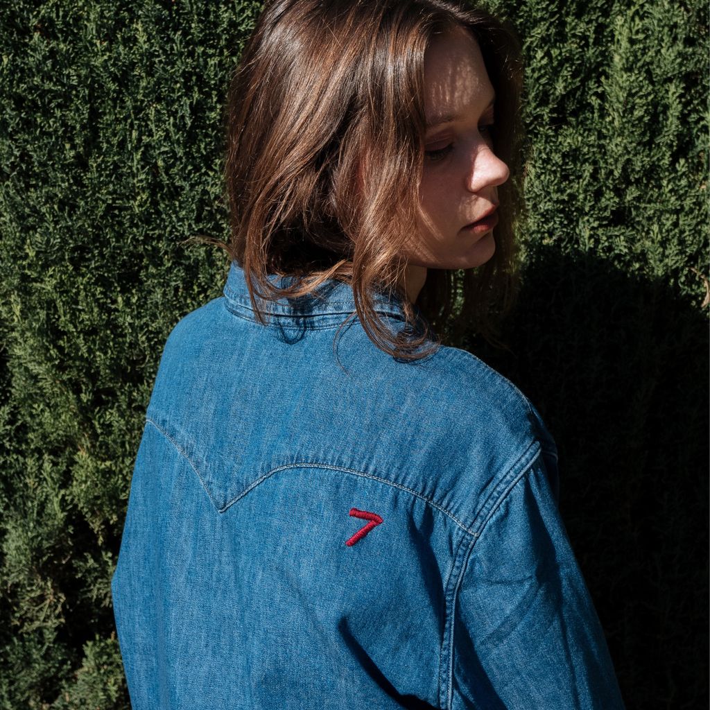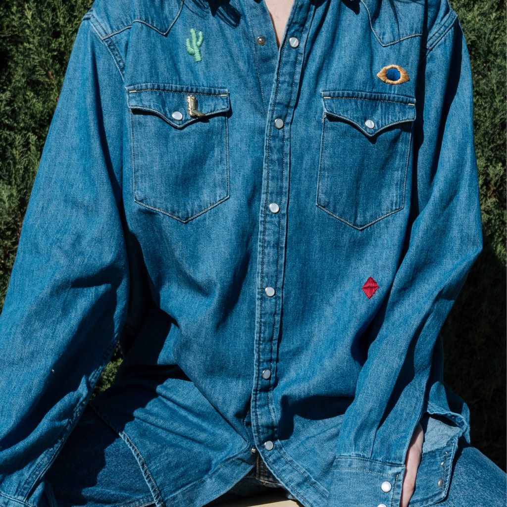 Denim shirt with hand embroidery at the front and the back. Hand embroidered in Aspen, Colorado. 100% cotton.