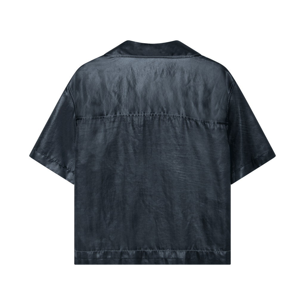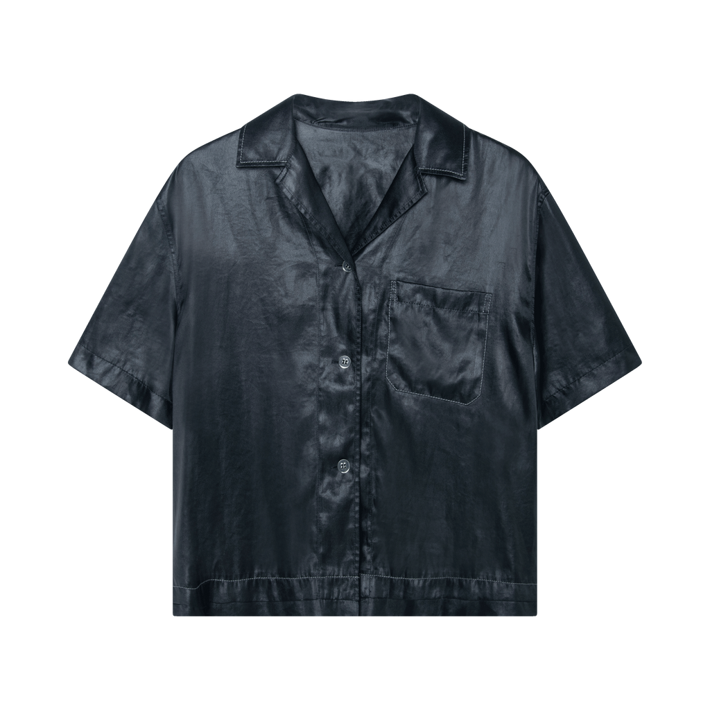 Acne Studios Black Boxy Button Up features silver front button closure, chest pocket, grey contrast stitching detailing, and cropped boxy fit.
