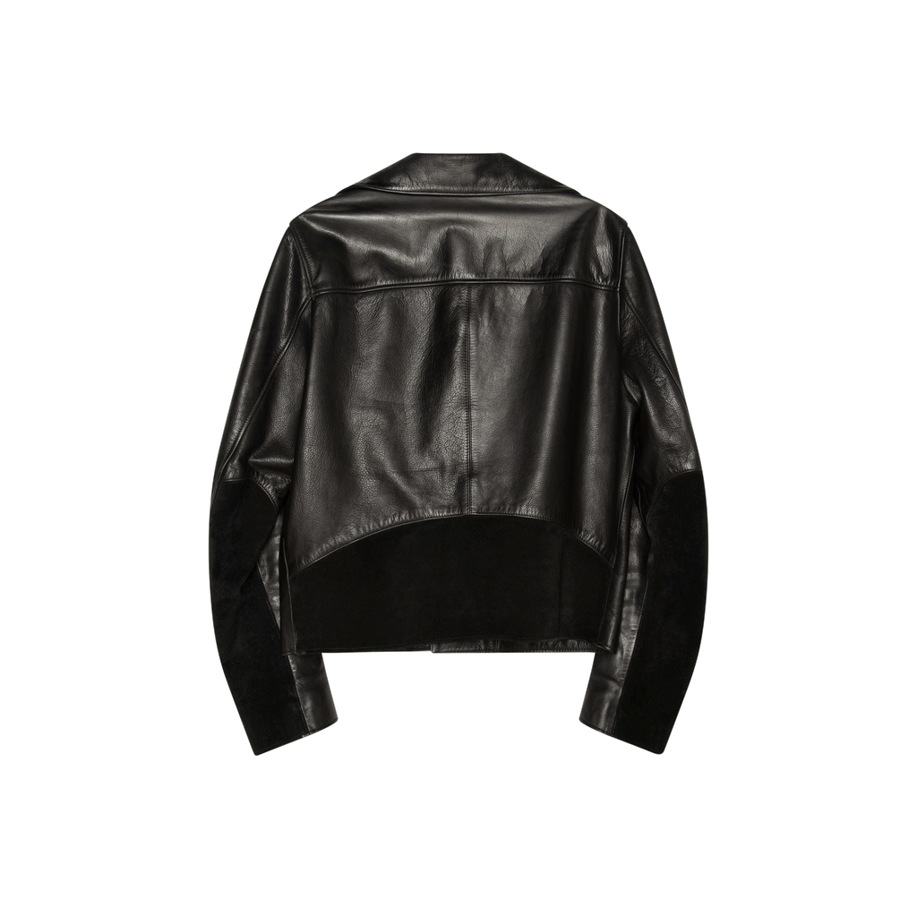 Acne Studios Gibson Leather Jacket features diagonal front zipper, zippered detailing on chest and sleeves, and suede trim on sleeves and back.