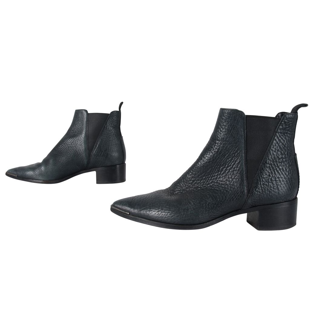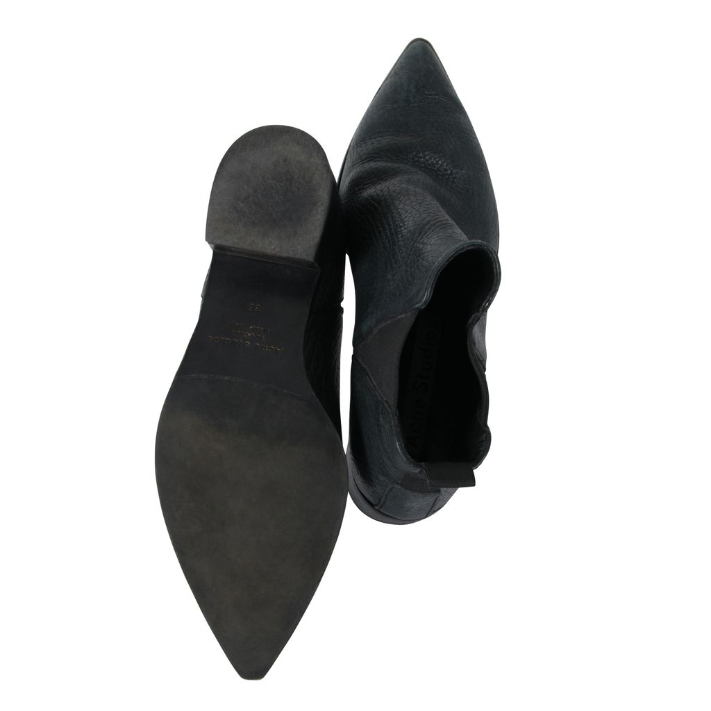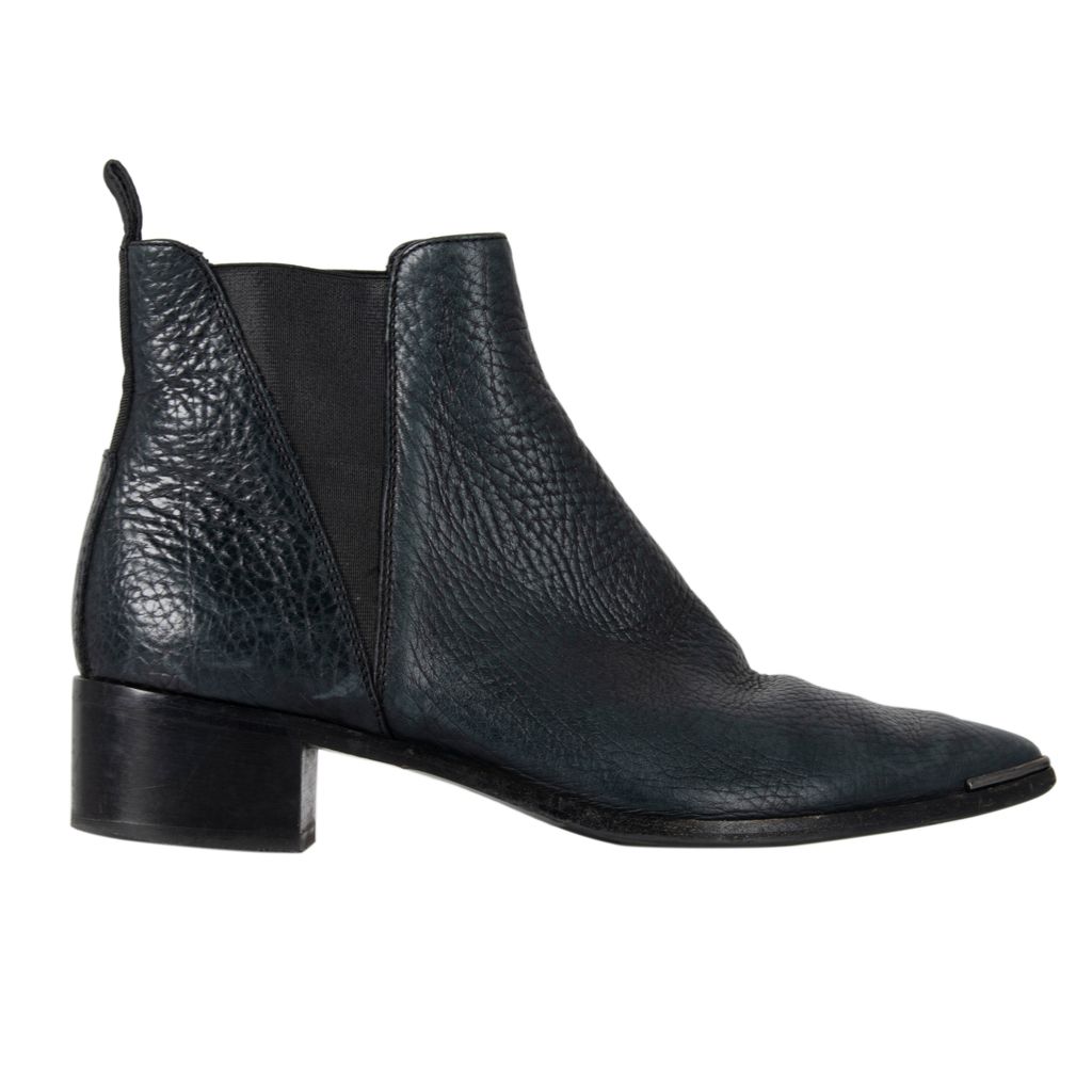 These Jensen leather boots from Acne Studios feature a pebbled leather outer, a block heel, elasticated insets fro easy wear and fit, and has a pointed-tie silhouette. Toe has inlayed metal detailing. Gently worn, all marks as pictured. Perfect for everyday or a night out.