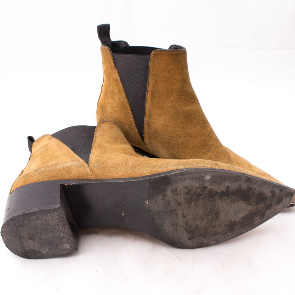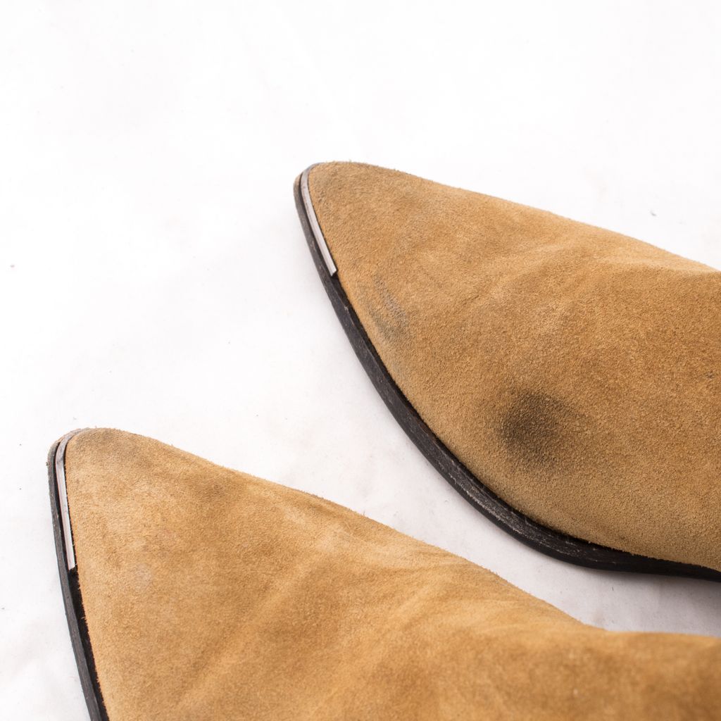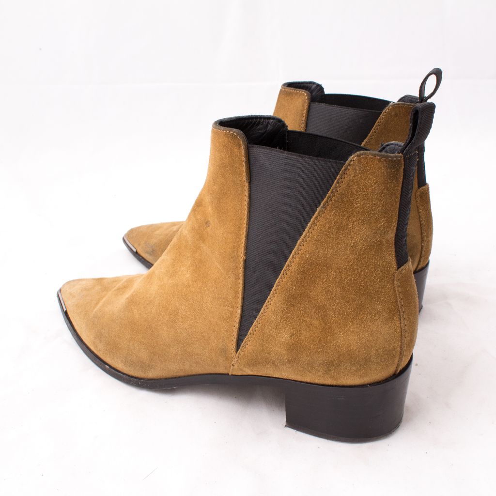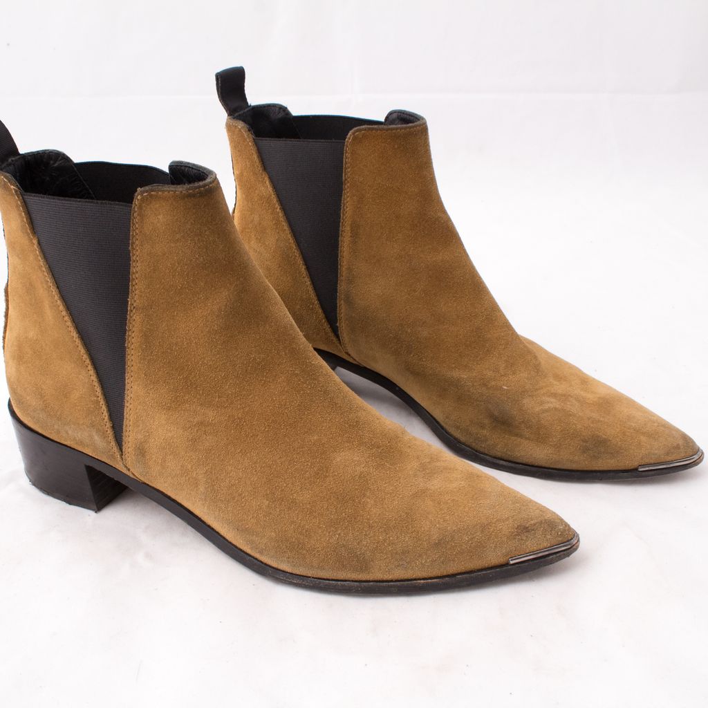 Acne Studios Suede Jensen boot. Suede upper with leather sole, gently worn, wear shown in photos. Elastic goring on sides, silver-tone metal accent at toe.