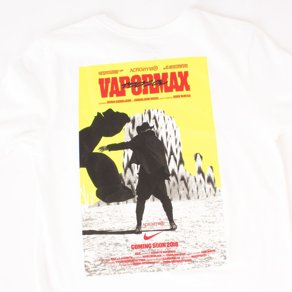 Done in collaboration with Acronym, this tee from Nike celebrates the release of their limited edition Vapormax sneakers. Features unique Vapormax movie poster graphic on back, Acronym Vapormax logo on chest, and crew neck shape.