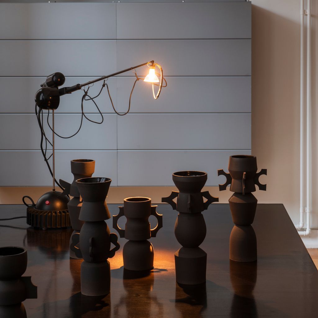 Fritz Adamski is a ceramist and object designer based in Düsseldorf. The series of vases he made for ‘An Angel’s Share’ consist of white stoneware coated with black stoneware and are glazed from the inside. The design language of the series is influenced by Bauhaus and Memphis and those groups’ shared interest in what might be called primary forms. Despite the precision with which the vases have been crafted, Adamski eschews preparatory sketches or constructions. His design process is intuitive, and he stresses the handmade quality of his objects.
