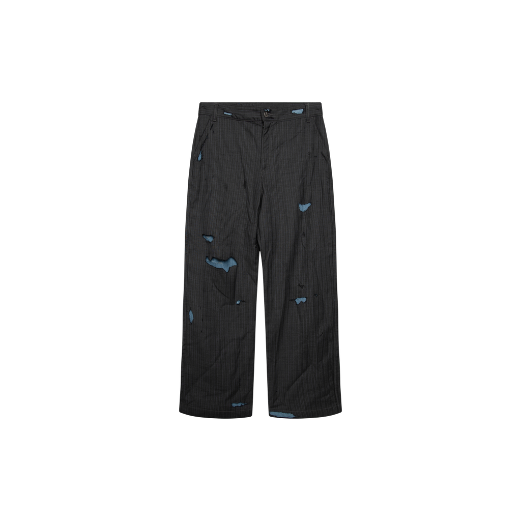 ADER error Layered Distressed-Effect Trousers features distressed effect, layered design, pinstripe pattern, straight leg, and front zip fly.