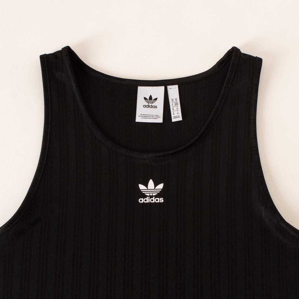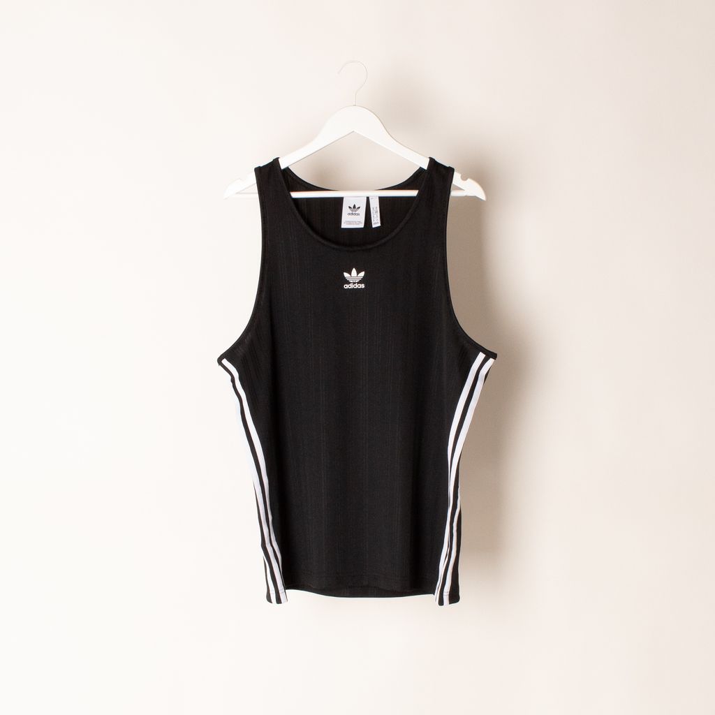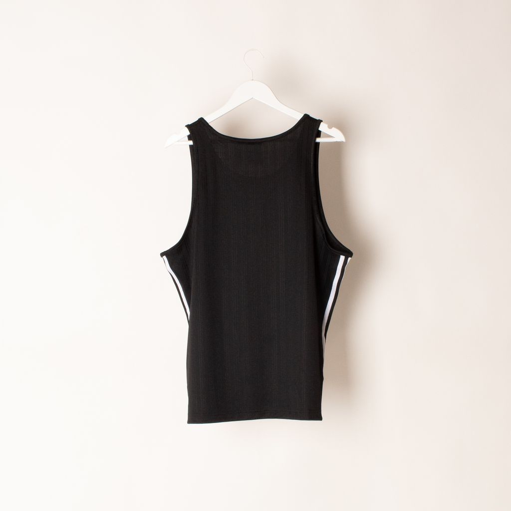 Inspired my men's heritage soccer jerseys, this tank combines old school vision with new school production. This tank was made with recycled polyester as a part of Adidas' commitment to sustainability. Features all over shadow stripe, adidas logo on front, triple stripe detailing on sides under arms.