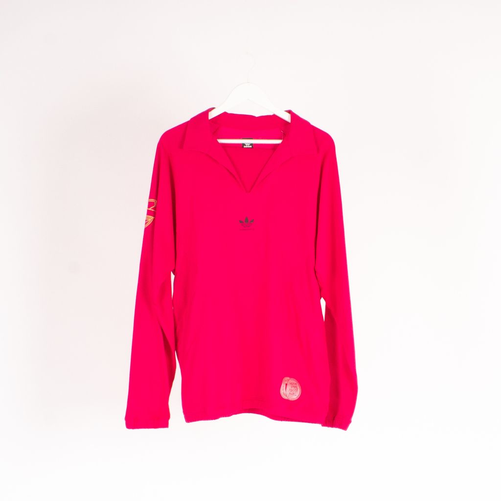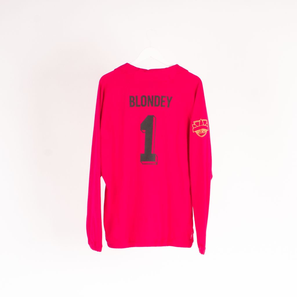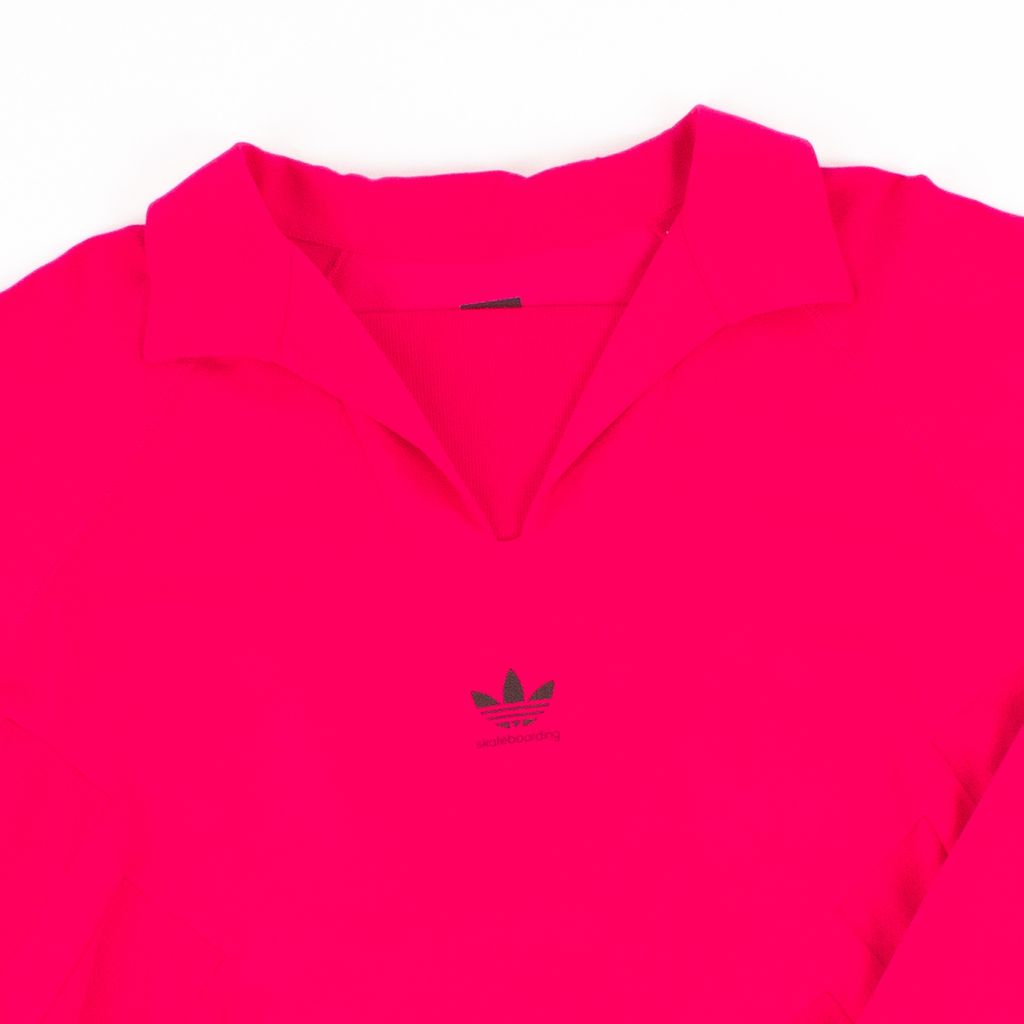 Modeled after archive jersey shapes, this particular Adidas piece displays art and design from skateboarding legend Mark "The Gonz" Gonzales for fellow skater Blondey McCoy. Features Climalite wick away fabrication, V-neck shape with wide collar, vintage sportswear fit, Adidas skateboarding and trefoil logo on chest, elastic bands at waist and wrists, and Blondey's name and number on back.
