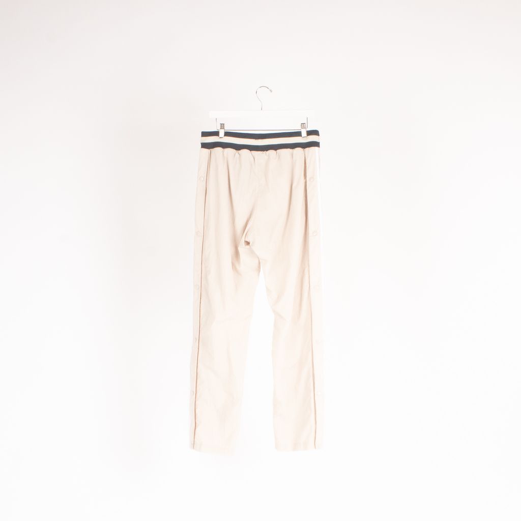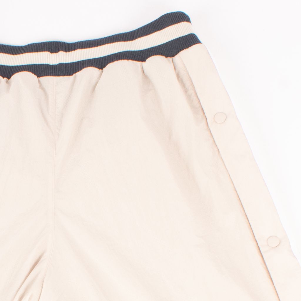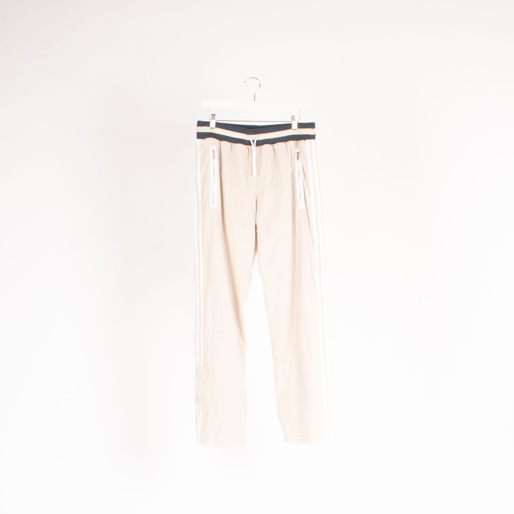 Inspired by old school hip hop videos and basketball uniforms, these pants from the Adidas collection designed by Bristol Studio are where function meets fashion. Features duotone elastic waist with tie, contrast colored side pockets with zipper closure, triple stripe detailing down sides with Adidas graphic near ankles, and tonal snap closure down sides.