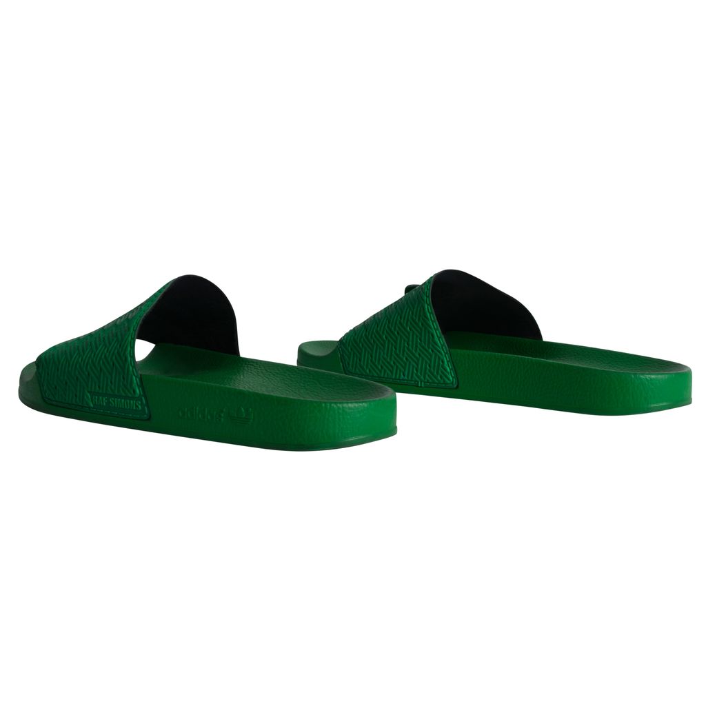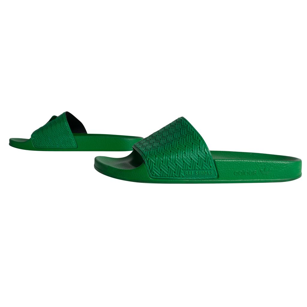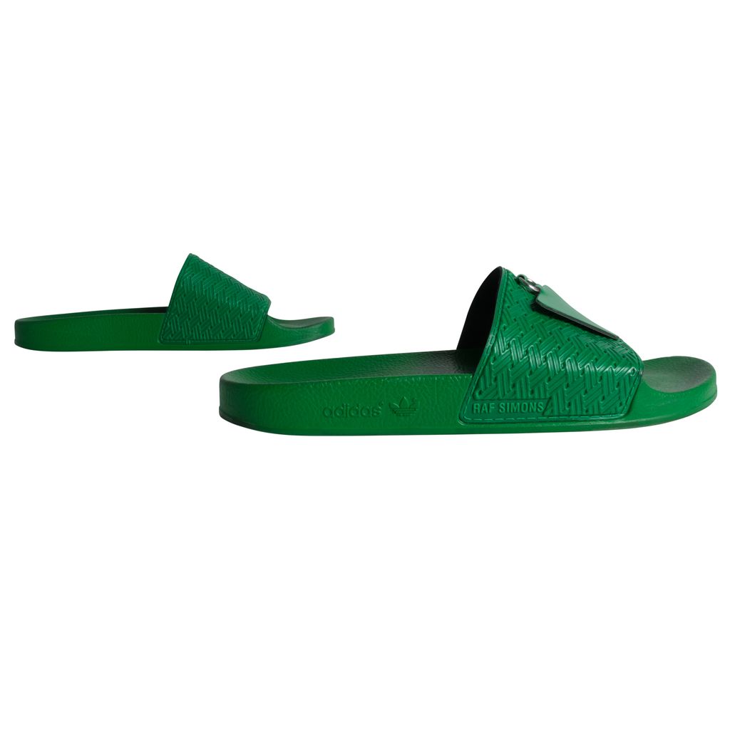 Opt for sleek and fuss-free with Adidas By Raf Simons' green athletic-inspired Adilette slides. Finished in faux-leather, this rubber pair is complete with a textured strap and silver-toned pendant. Gently worn, in fair condition. Marks and Scuffs as pictured.