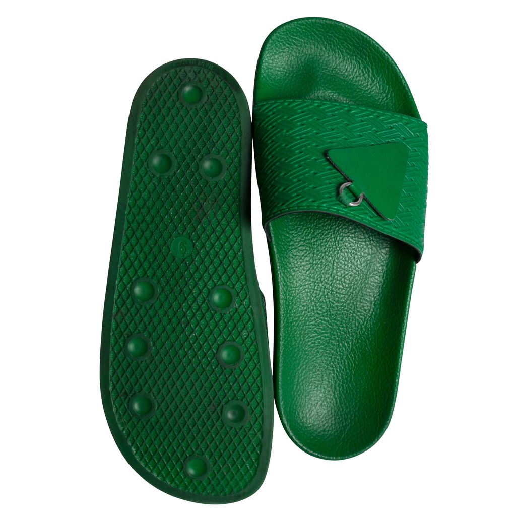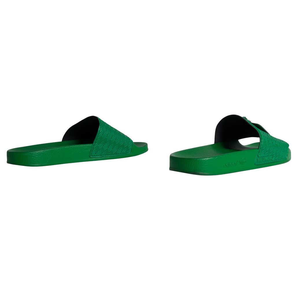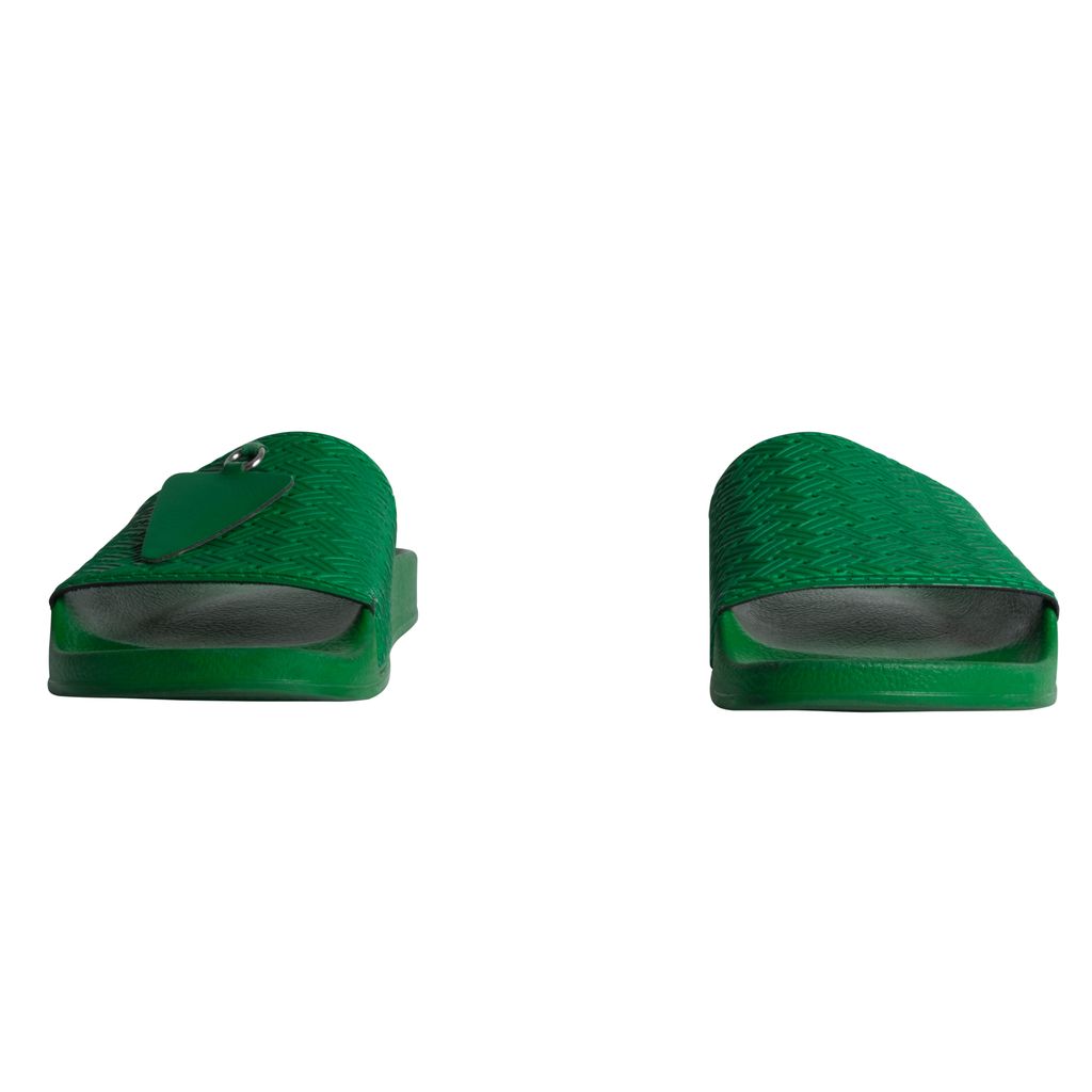 Opt for sleek and fuss-free with Adidas By Raf Simons' green athletic-inspired Adilette slides. Finished in faux-leather, this rubber pair is complete with a textured strap and silver-toned pendant. Gently worn, in fair condition. Marks and Scuffs as pictured.