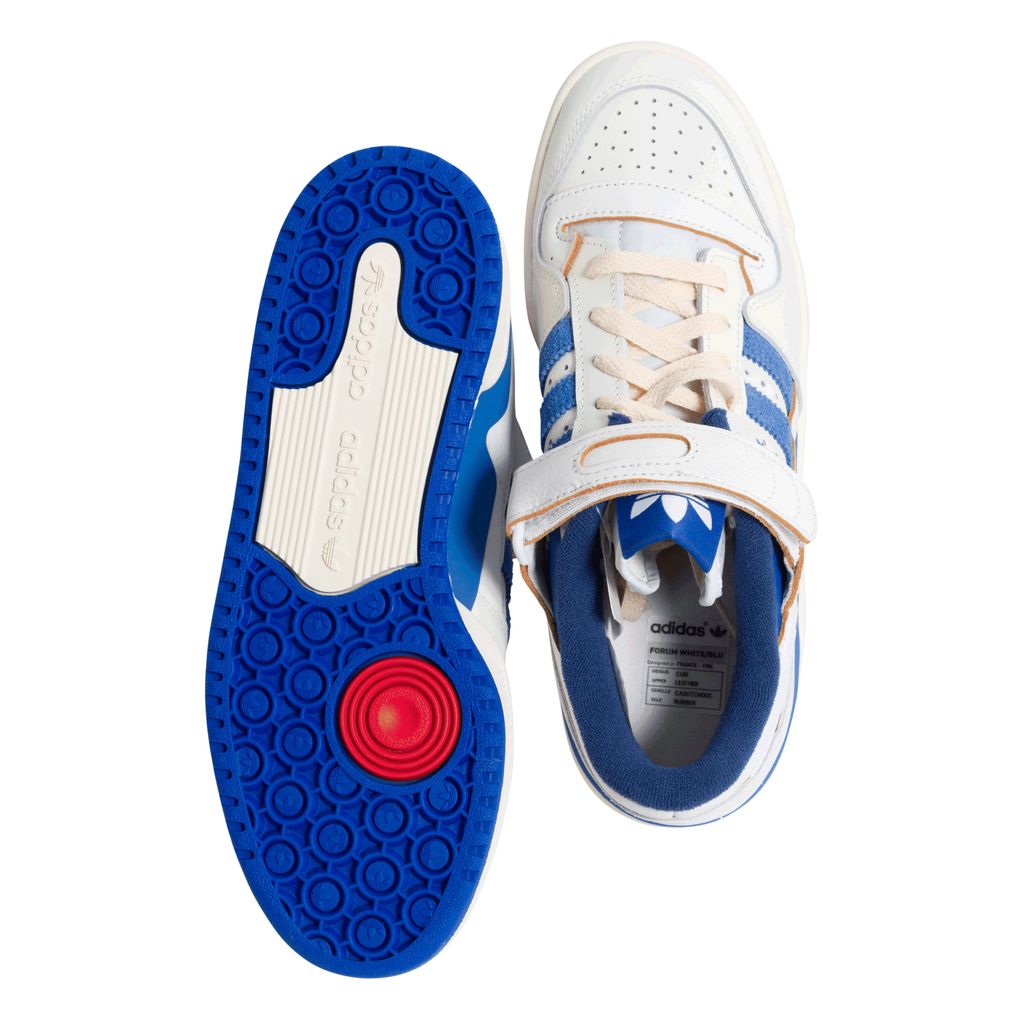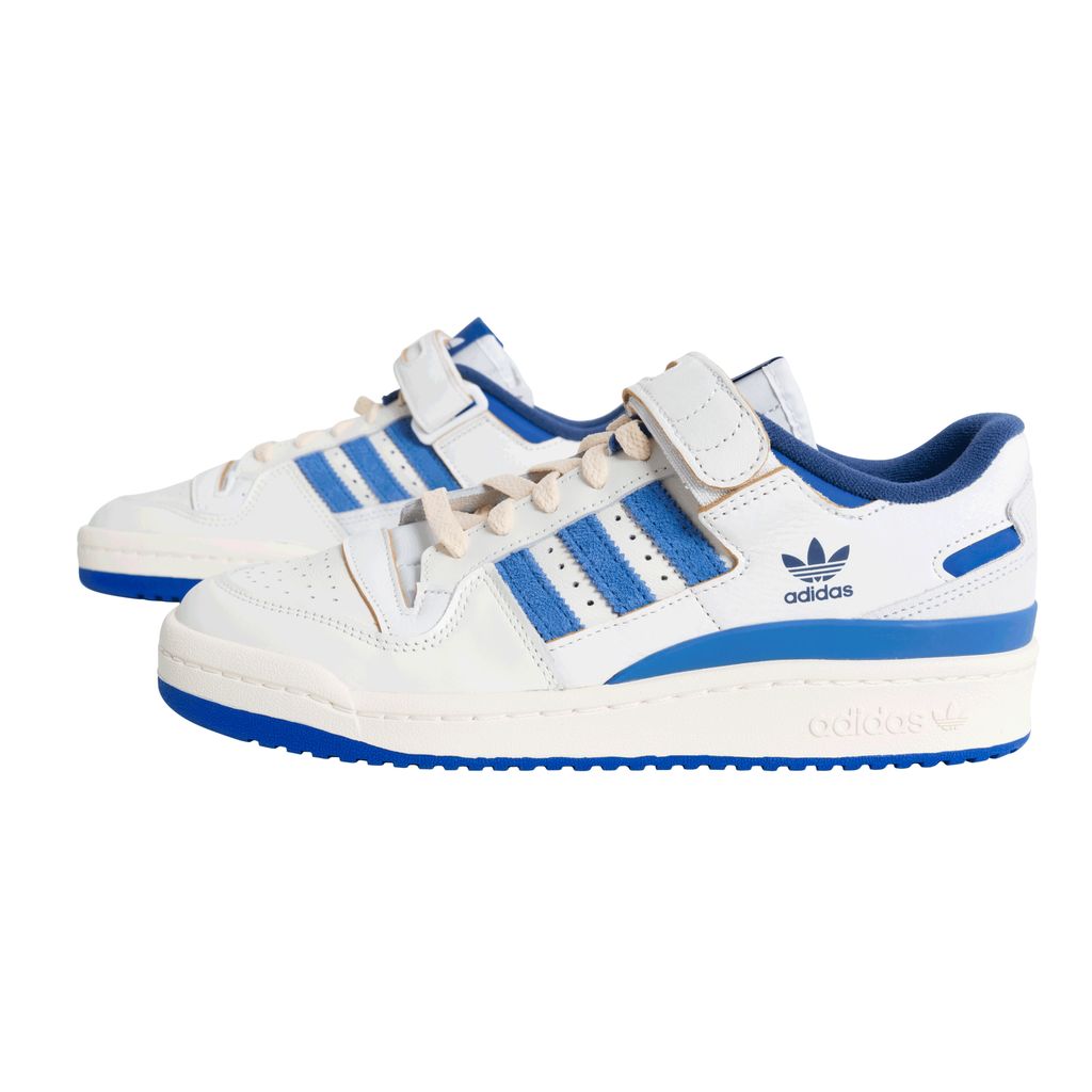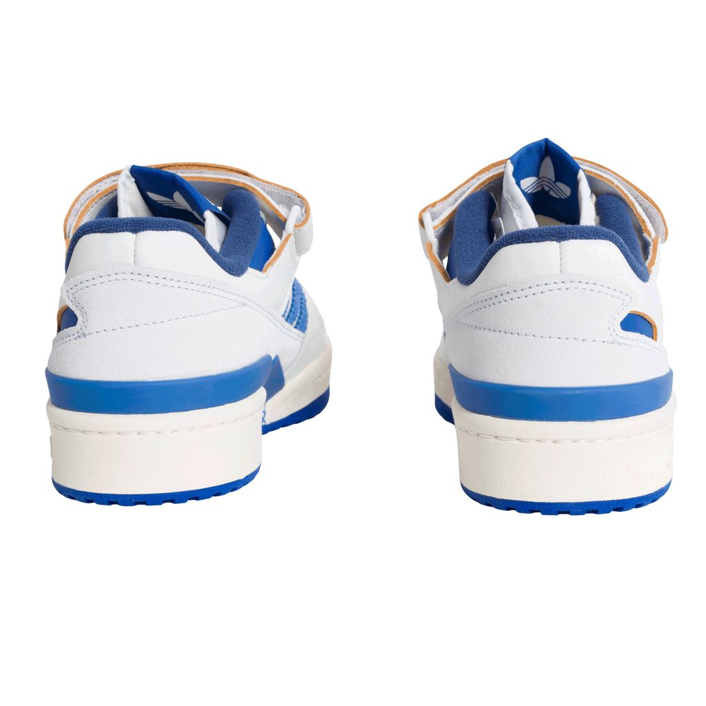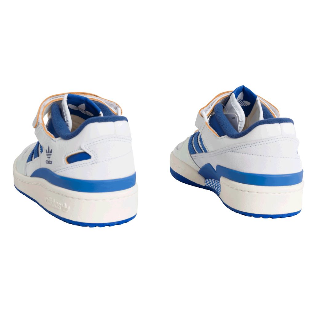 White sneakers with rubber and leather upper and a rubber sole. These sneakers also feature blue and orange trim, yellow laces, and a strip of velcro at the tongue for extra support.
