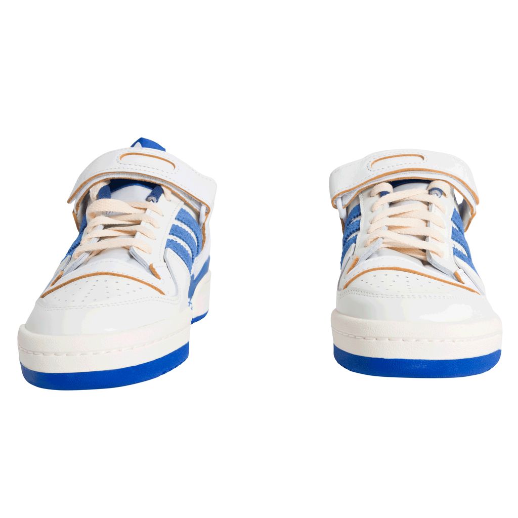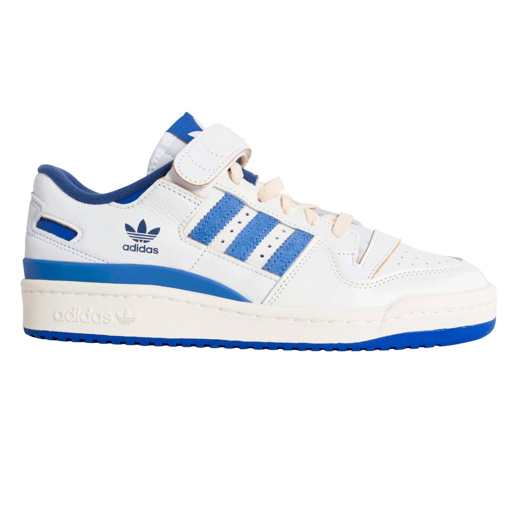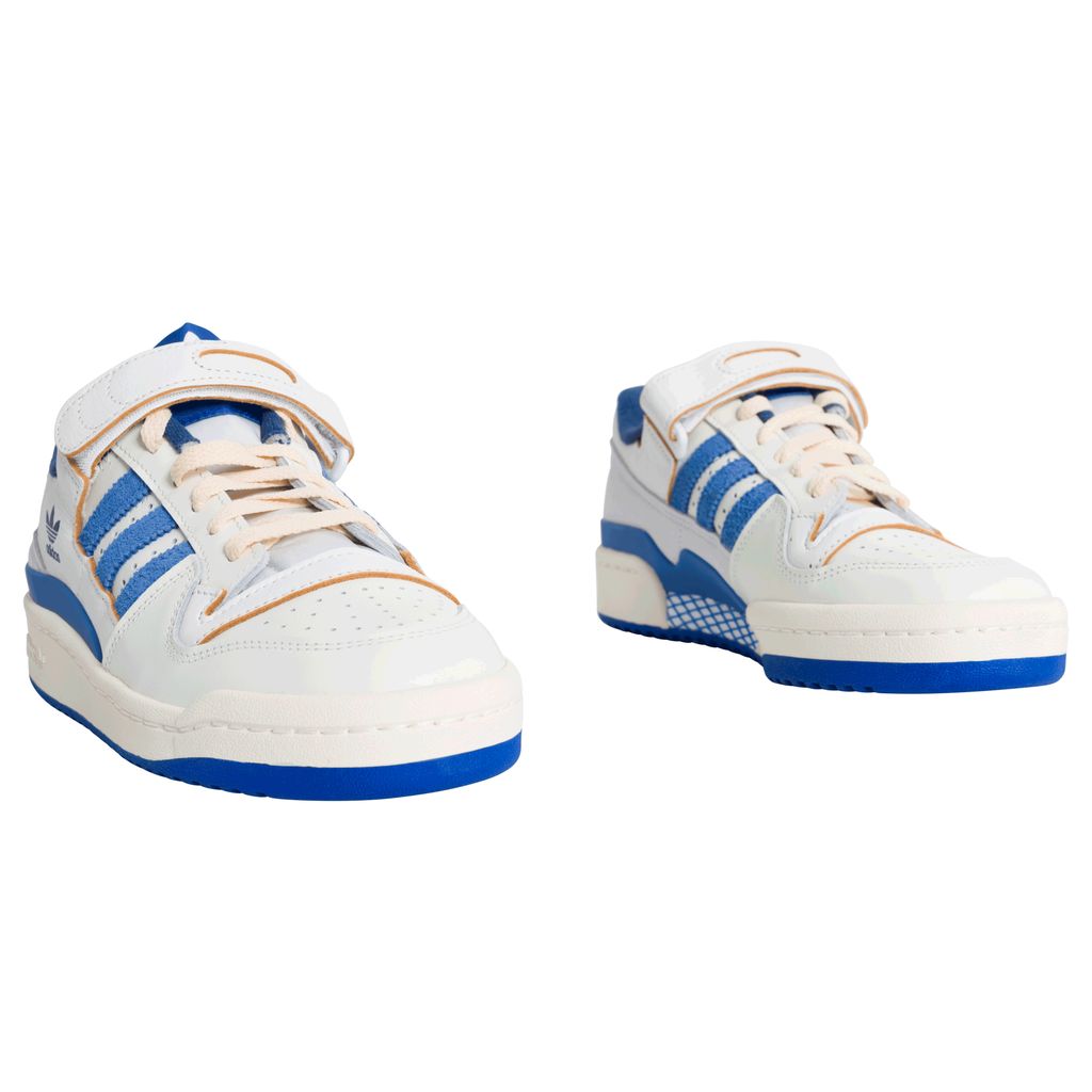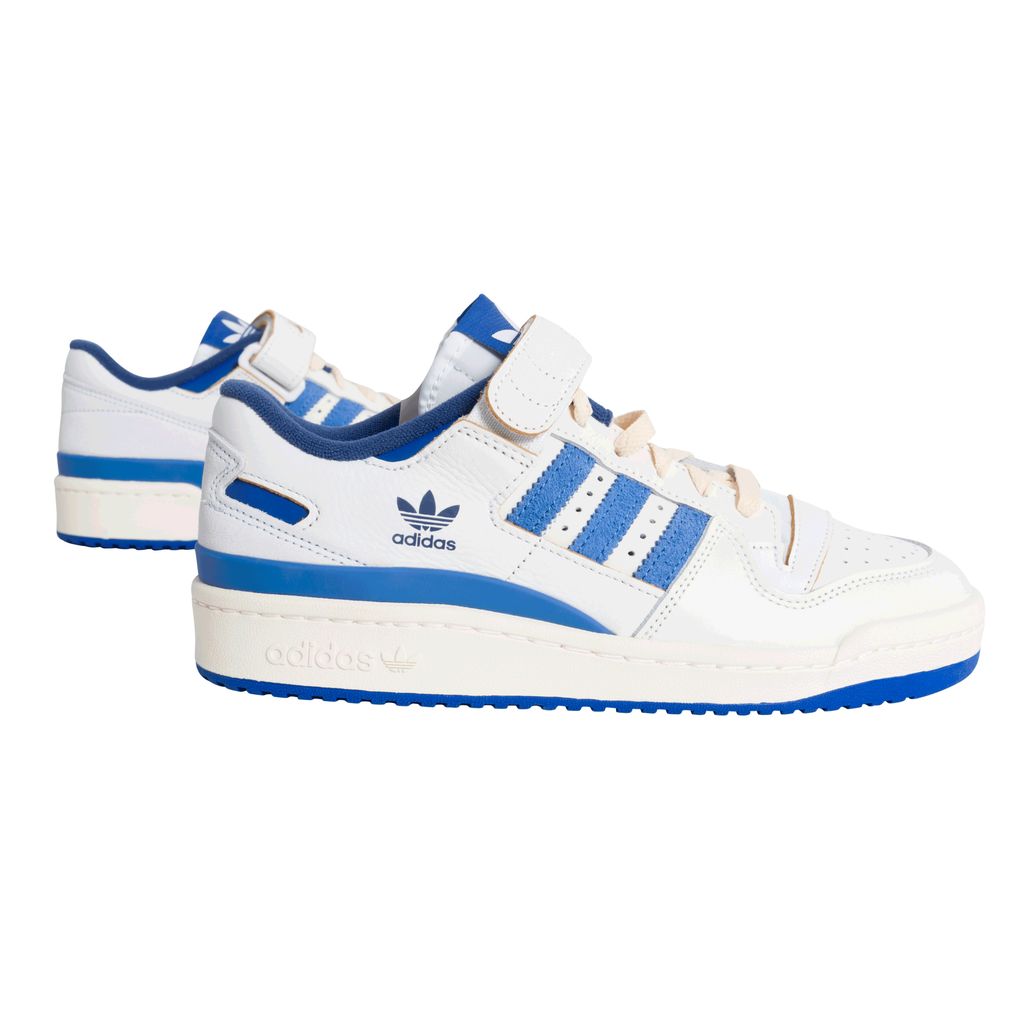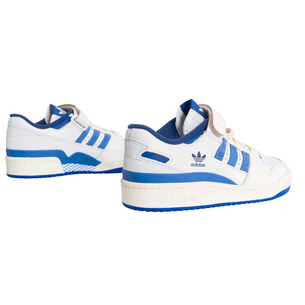White sneakers with rubber and leather upper and a rubber sole. These sneakers also feature blue and orange trim, yellow laces, and a strip of velcro at the tongue for extra support.