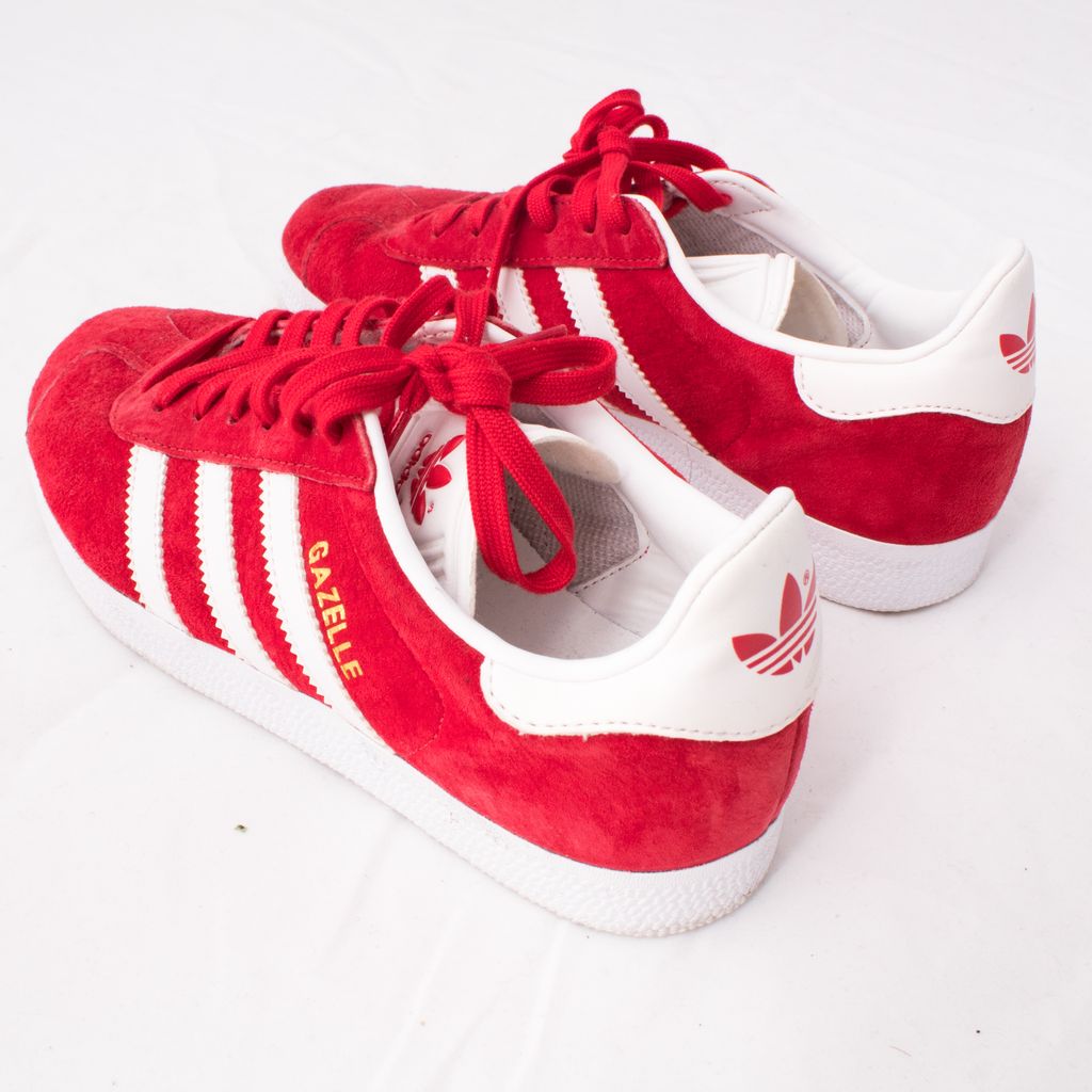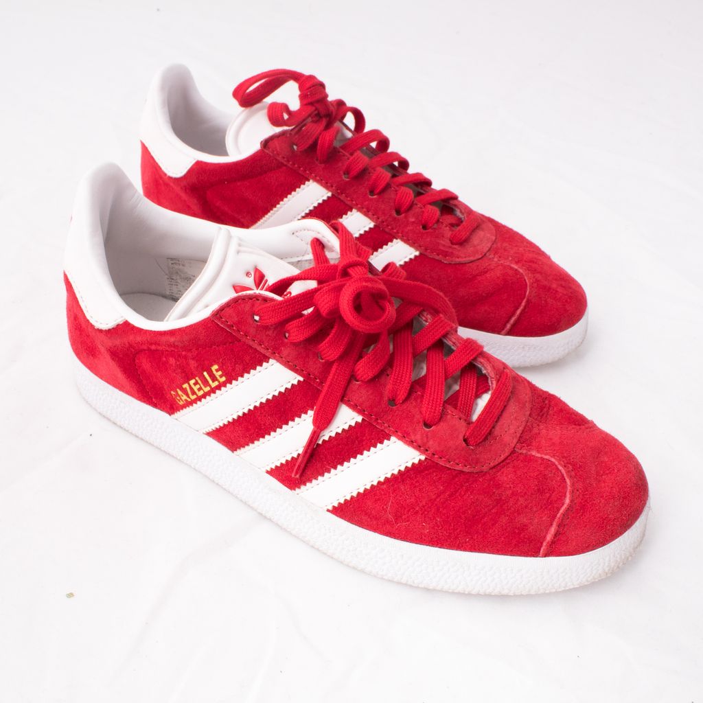 Red Adidas Gazelle sneaker. Classic silhouette with white tongue, gold "Gazelle" labeling, and red laces. Gently worn and in great condition.