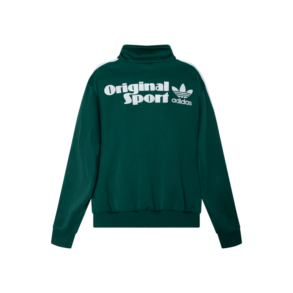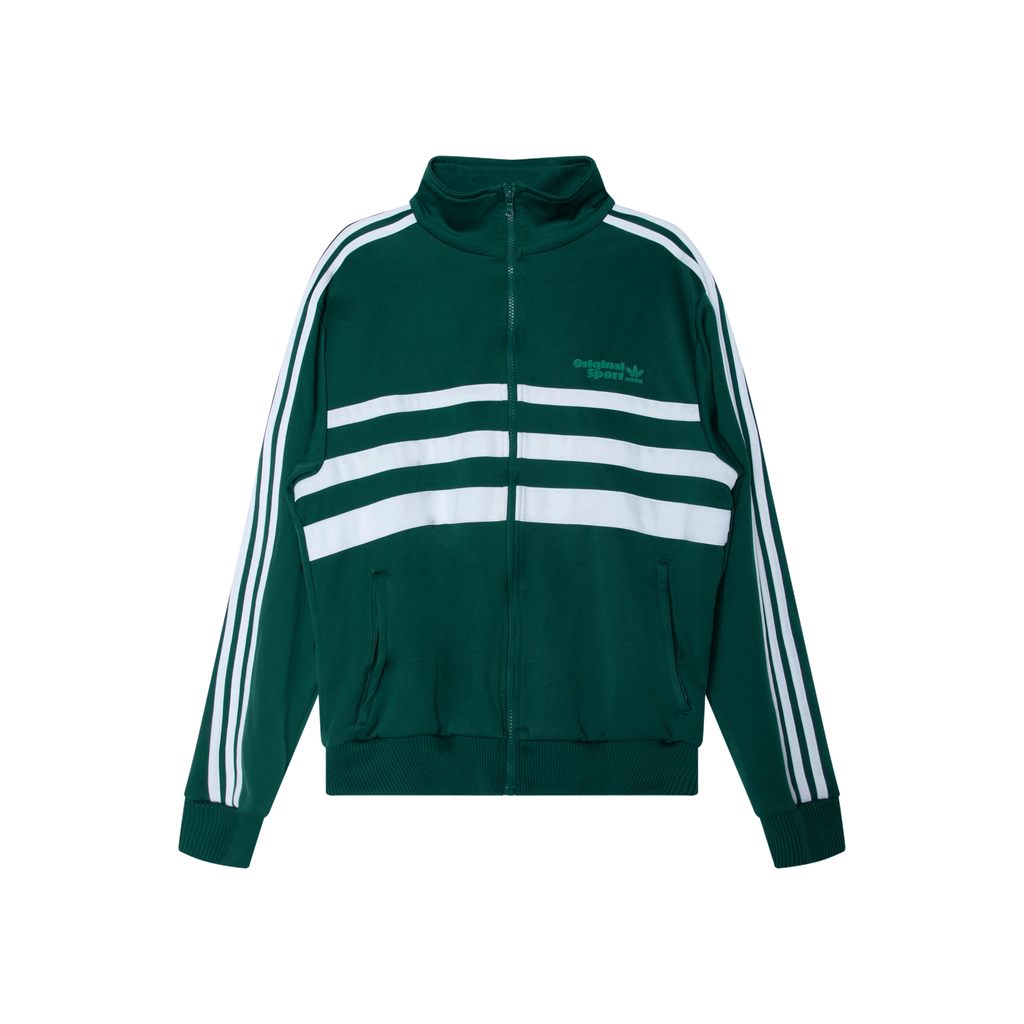 Adidas Green Original Sport Track Jacket features front zip, 3 stripe design on sleeves and front, logo on back, and 2 side zip pockets.