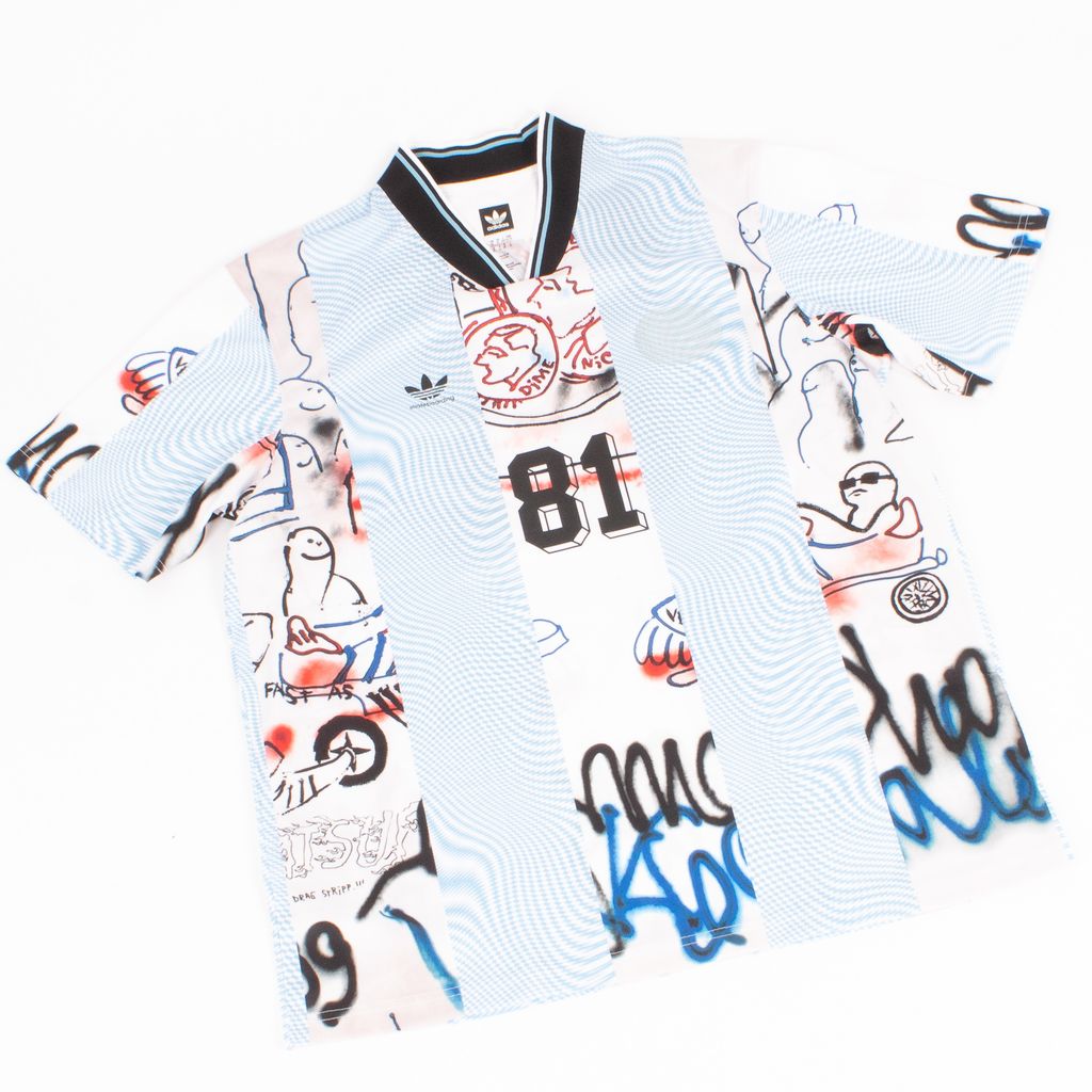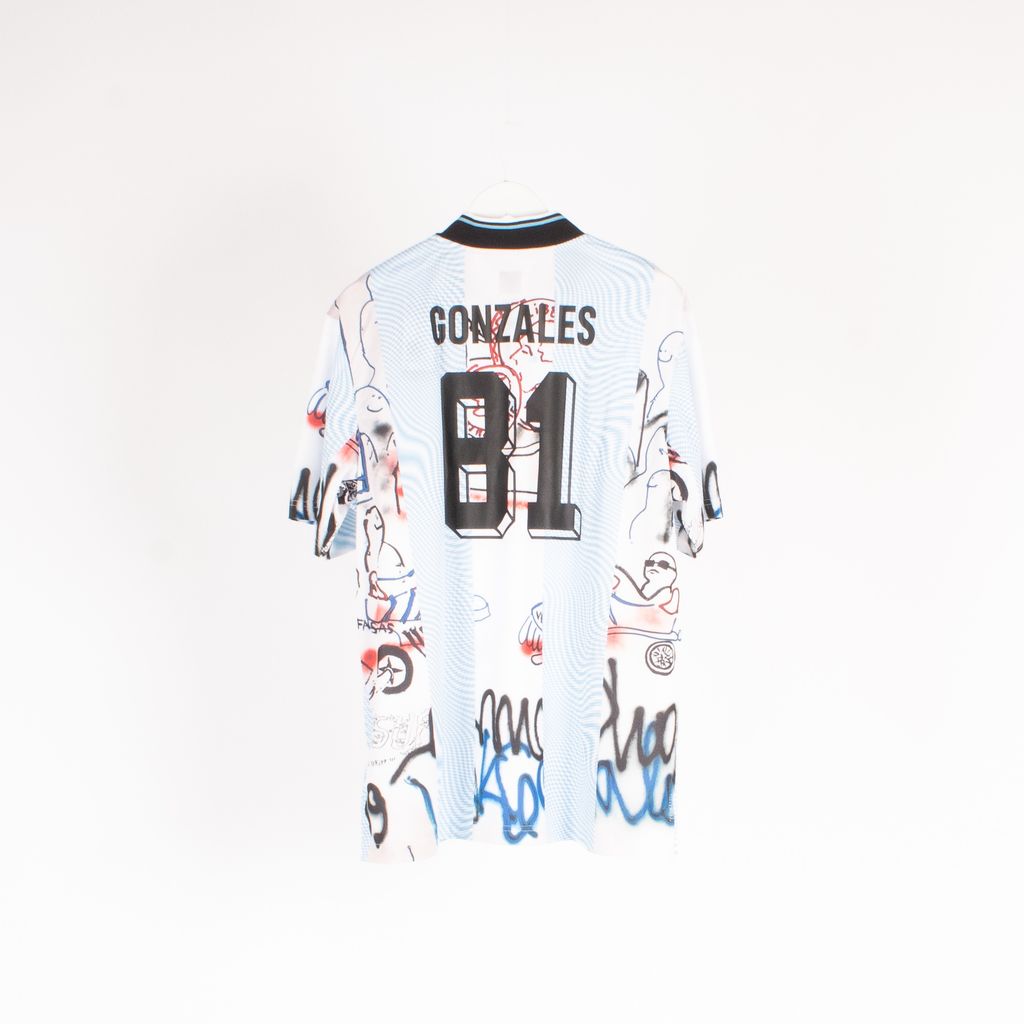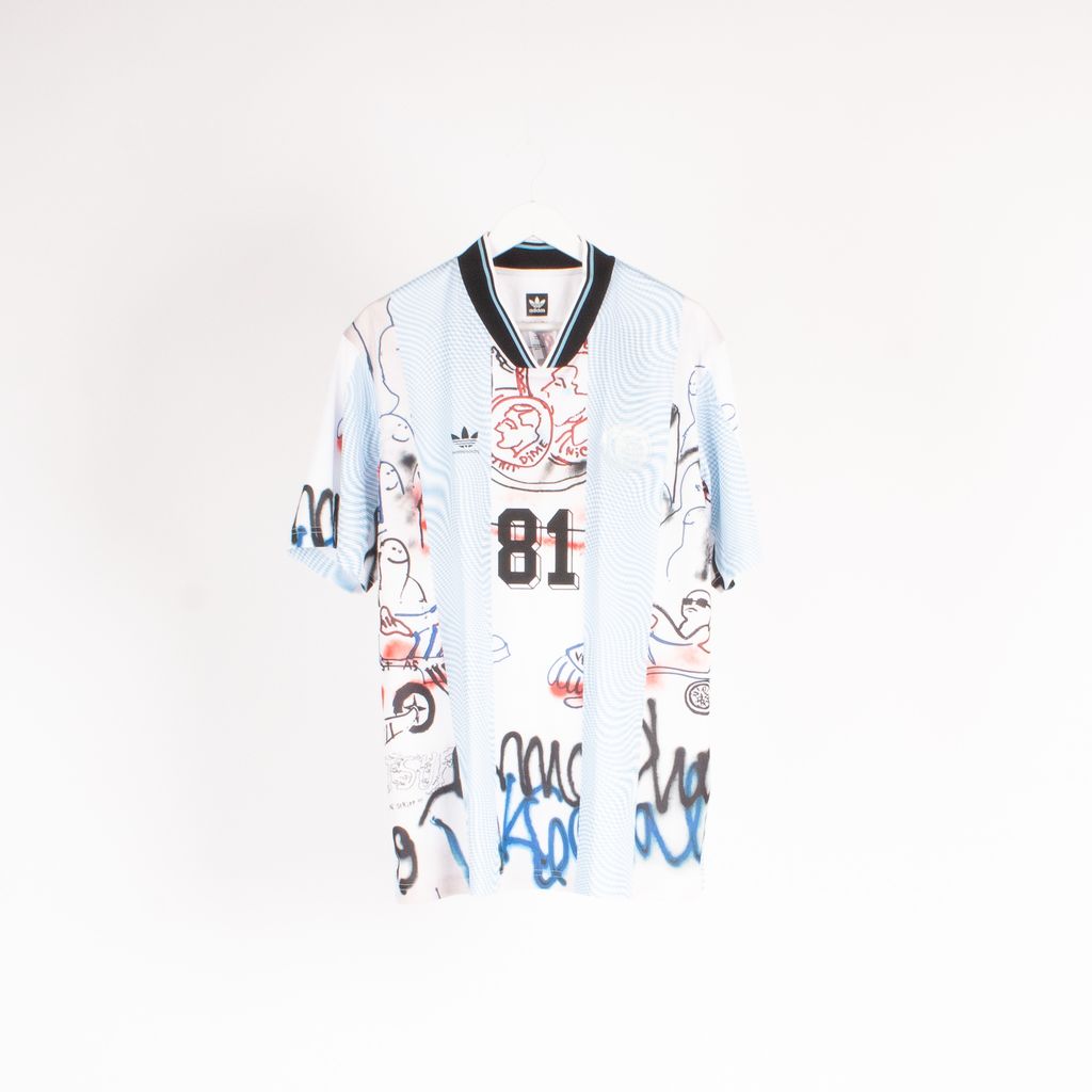 Modeled after archive jersey shapes, this particular Adidas piece displays art and design from skateboarding legend Mark "The Gonz" Gonzales. Features Climalite wick away fabrication, sublimated print artwork, V-neck shape, Gonzales name and number, and Adidas skateboarding logo and trefoil on chest.