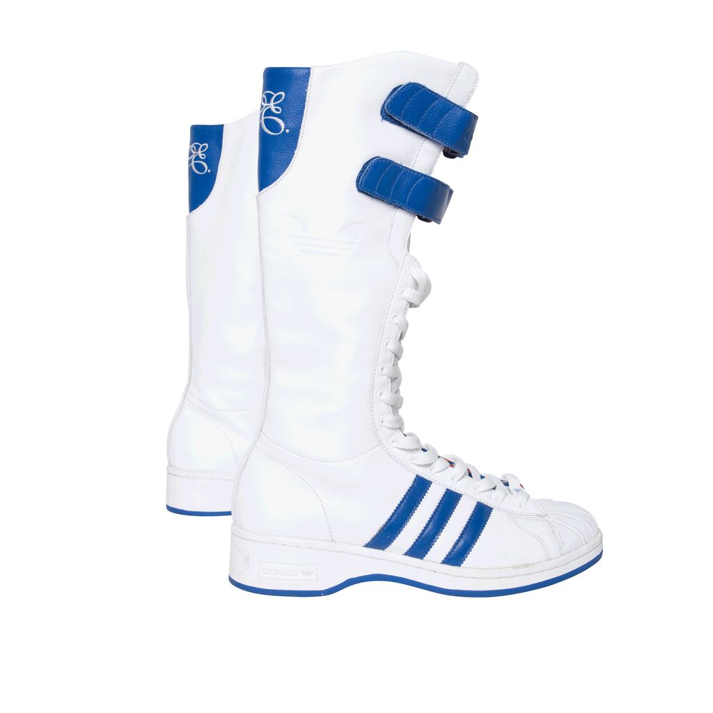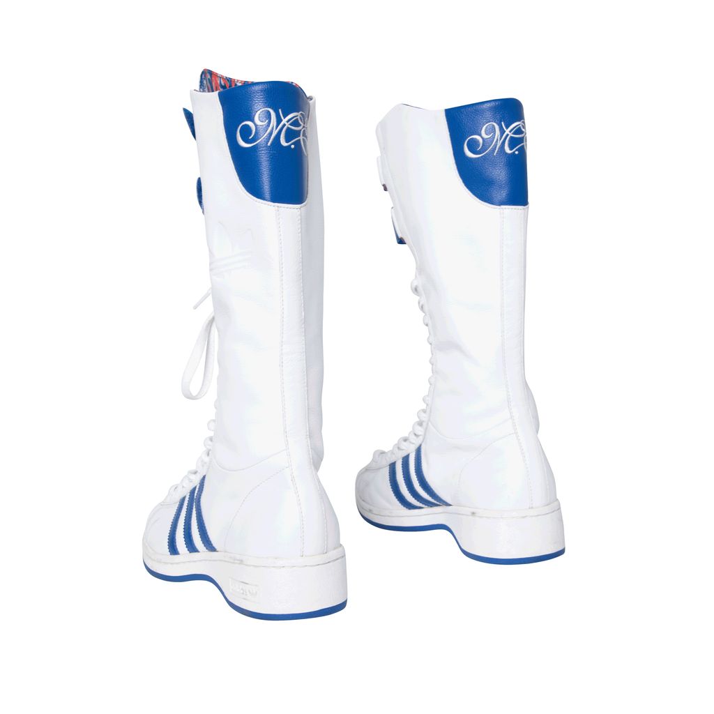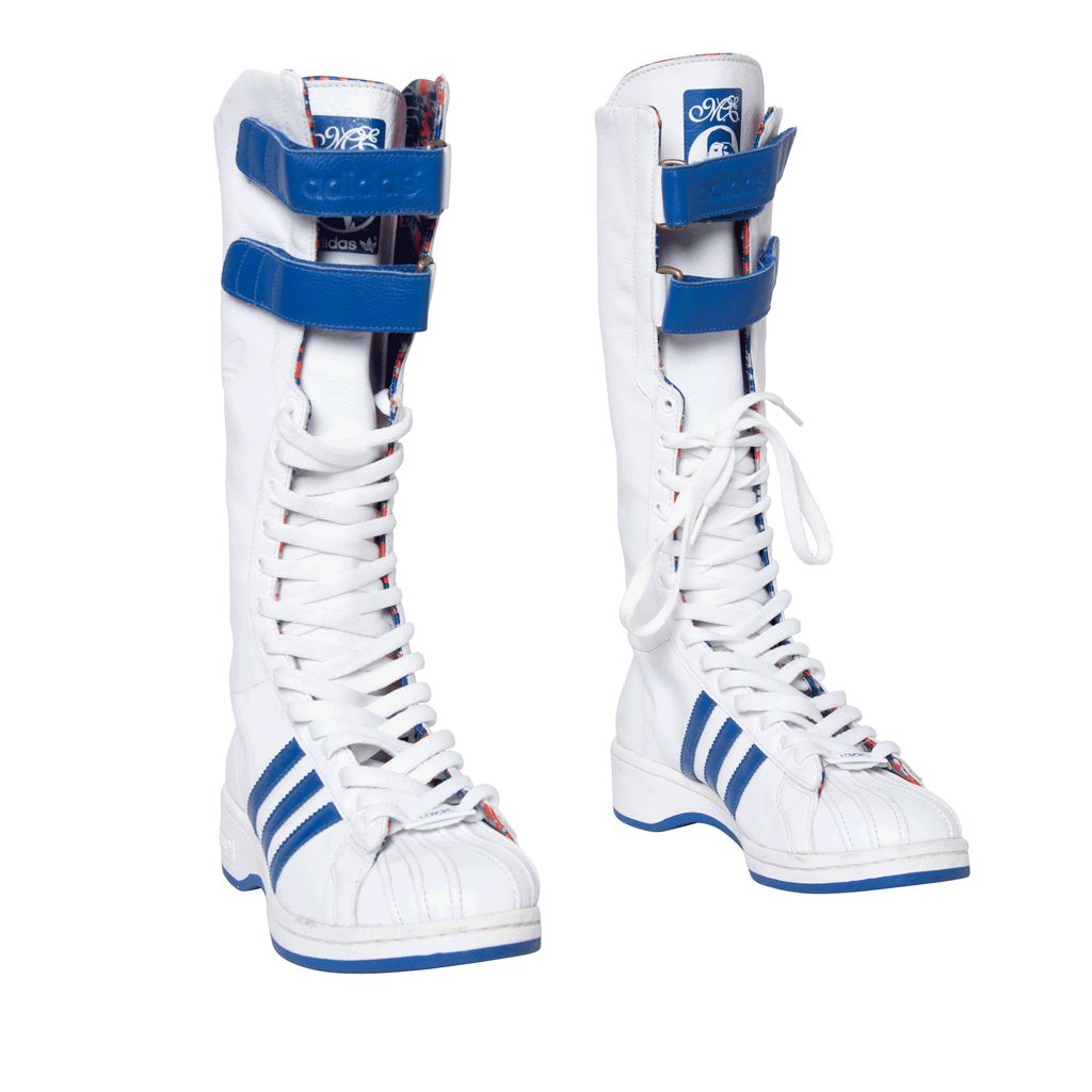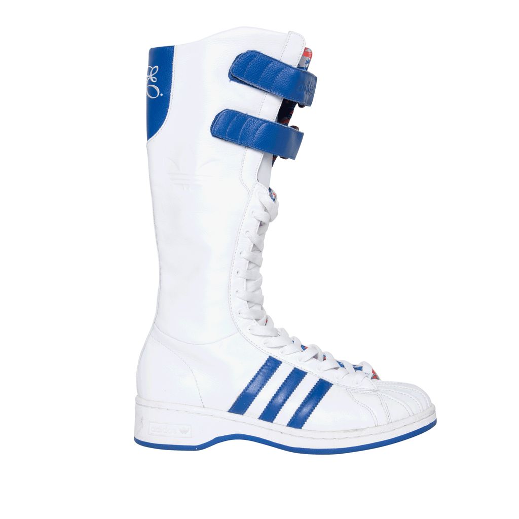 Adidas Missy Elliot Remix 3 Stripes sneakers feature a leather exterior with rubber sole, lace and velcro enclosures, and Missy Elliot's embroidered initials on the back.