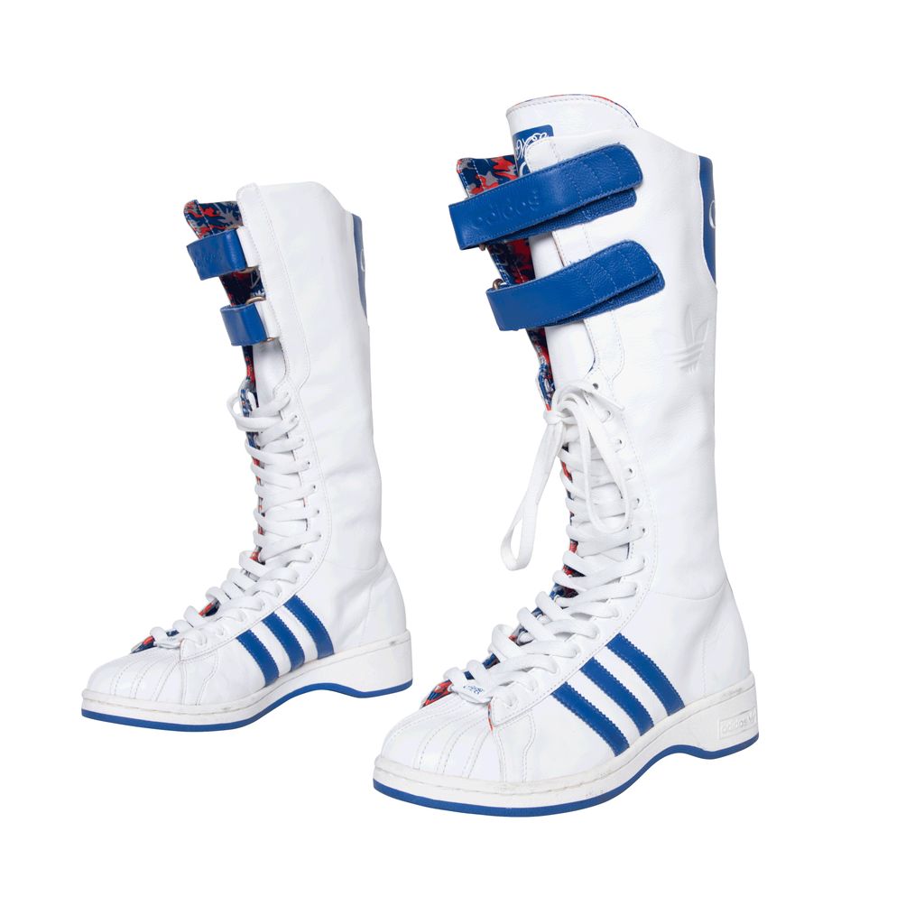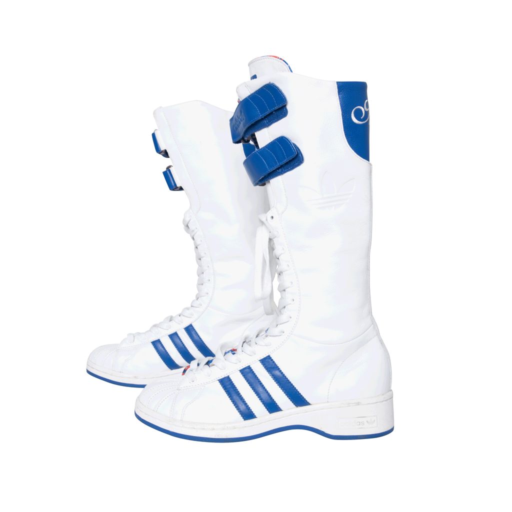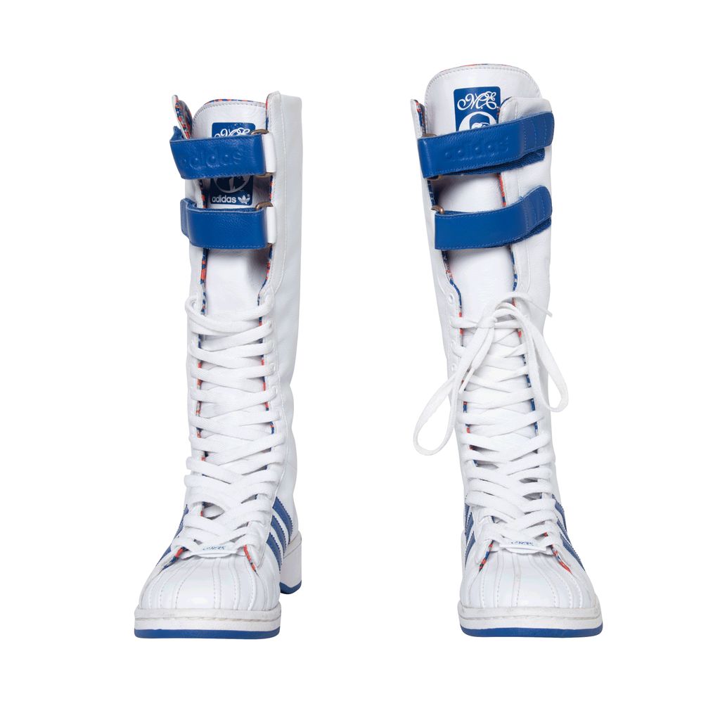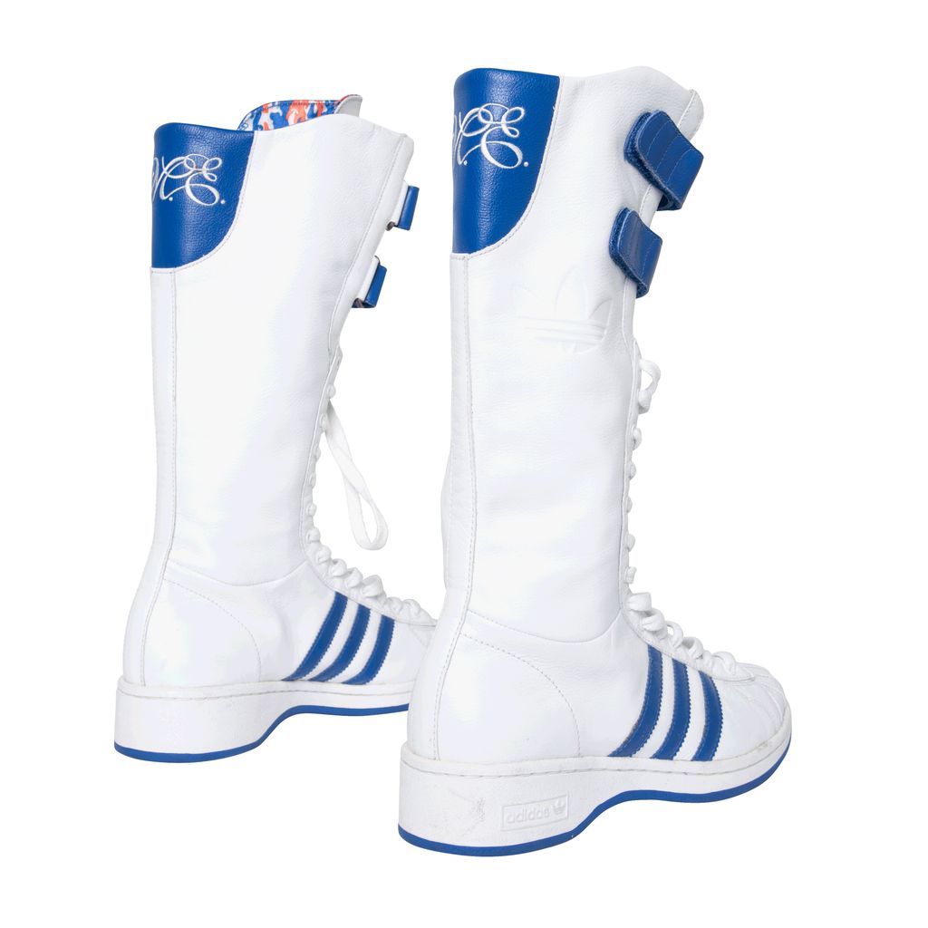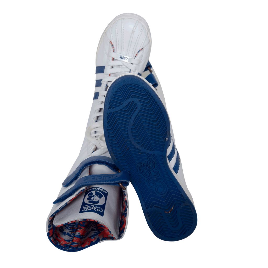 Adidas Missy Elliot Remix 3 Stripes sneakers feature a leather exterior with rubber sole, lace and velcro enclosures, and Missy Elliot's embroidered initials on the back.