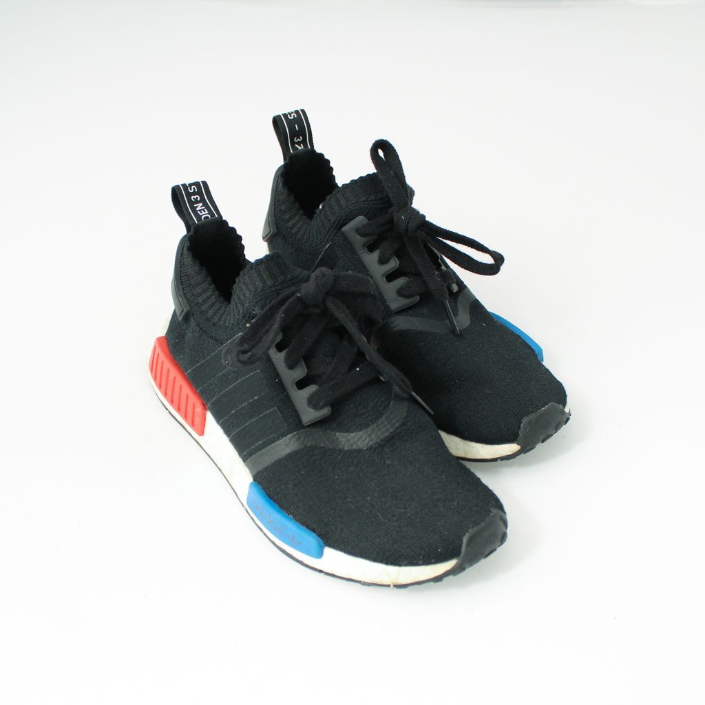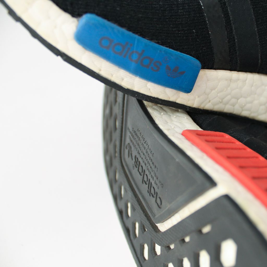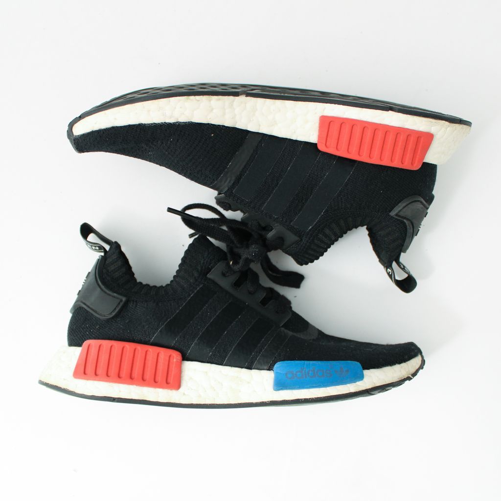 Solid black Primeknit upper accompanied by the signature red and blue NMD bumpers.