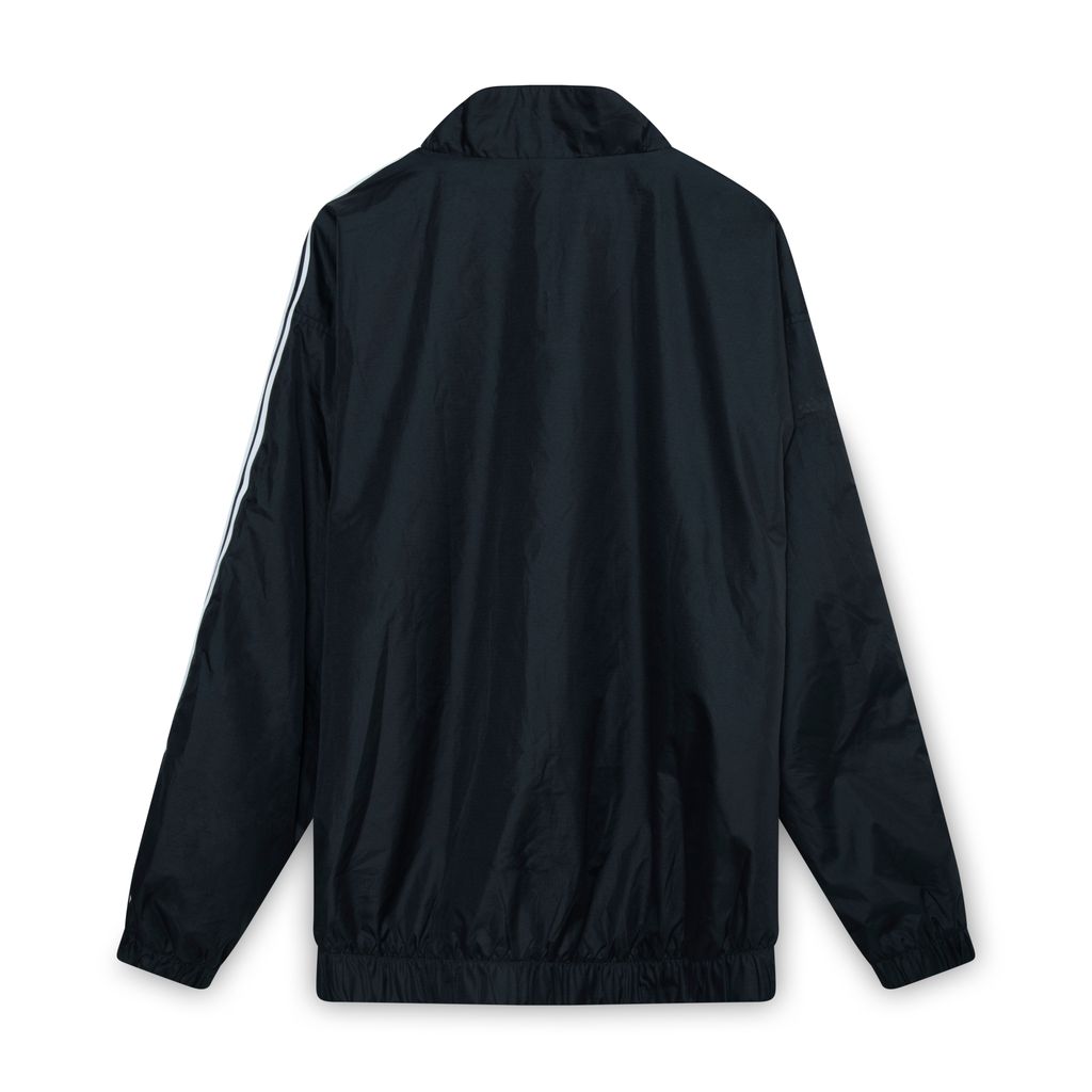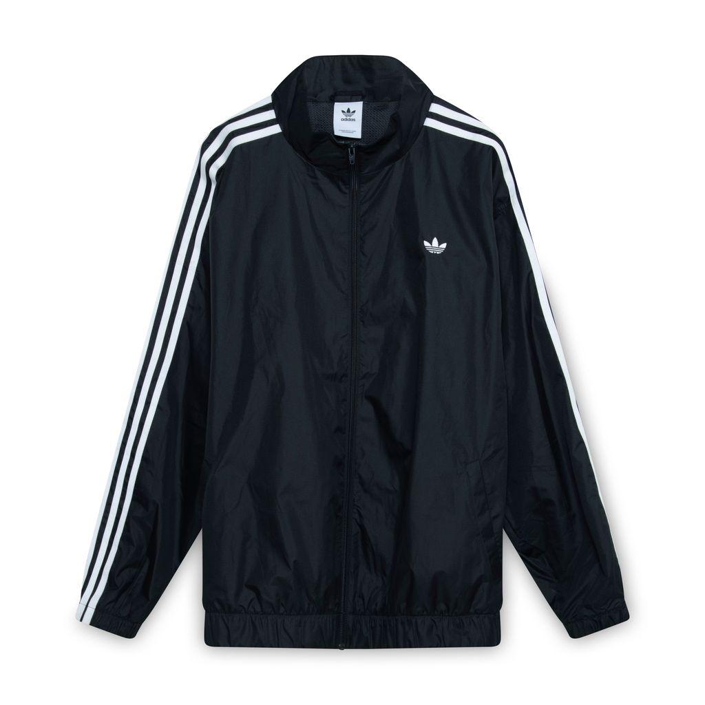 Adidas nylon track jacket features signature three stripes at sides, two front pocket, mock neck, and center zipper closure at front.