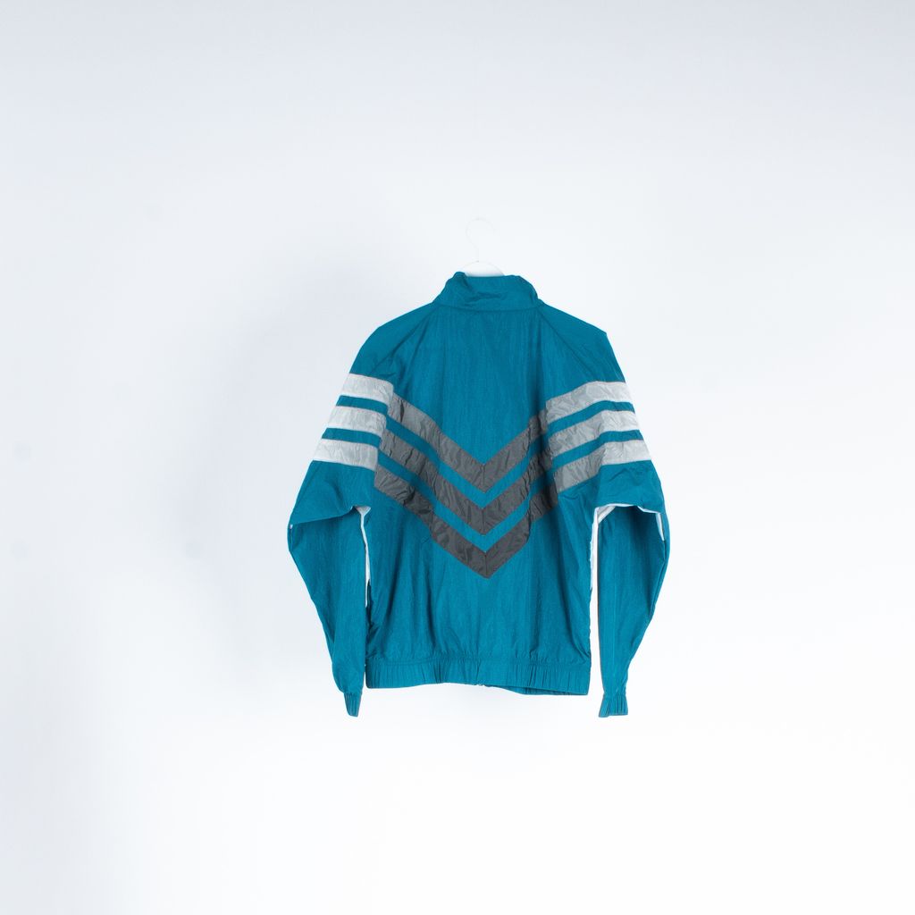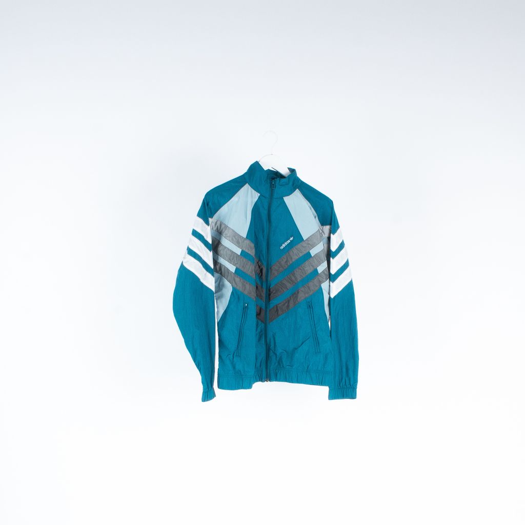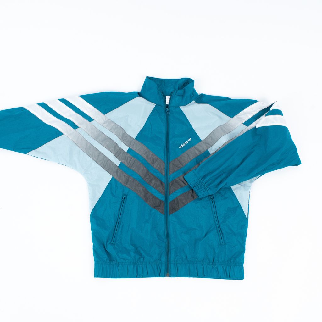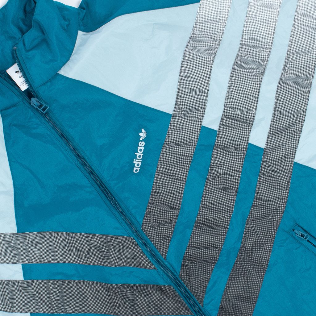 Channel your inner Sporty Spice in this tonal windbreaker from Adidas. Feature full zip front closure, high neck, multi stripe detailing, slanted front zip closure pockets, and elastic bands at waist and wrists.