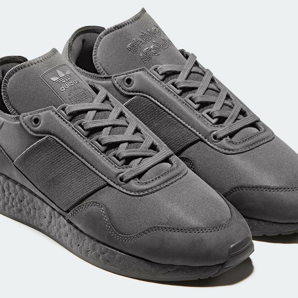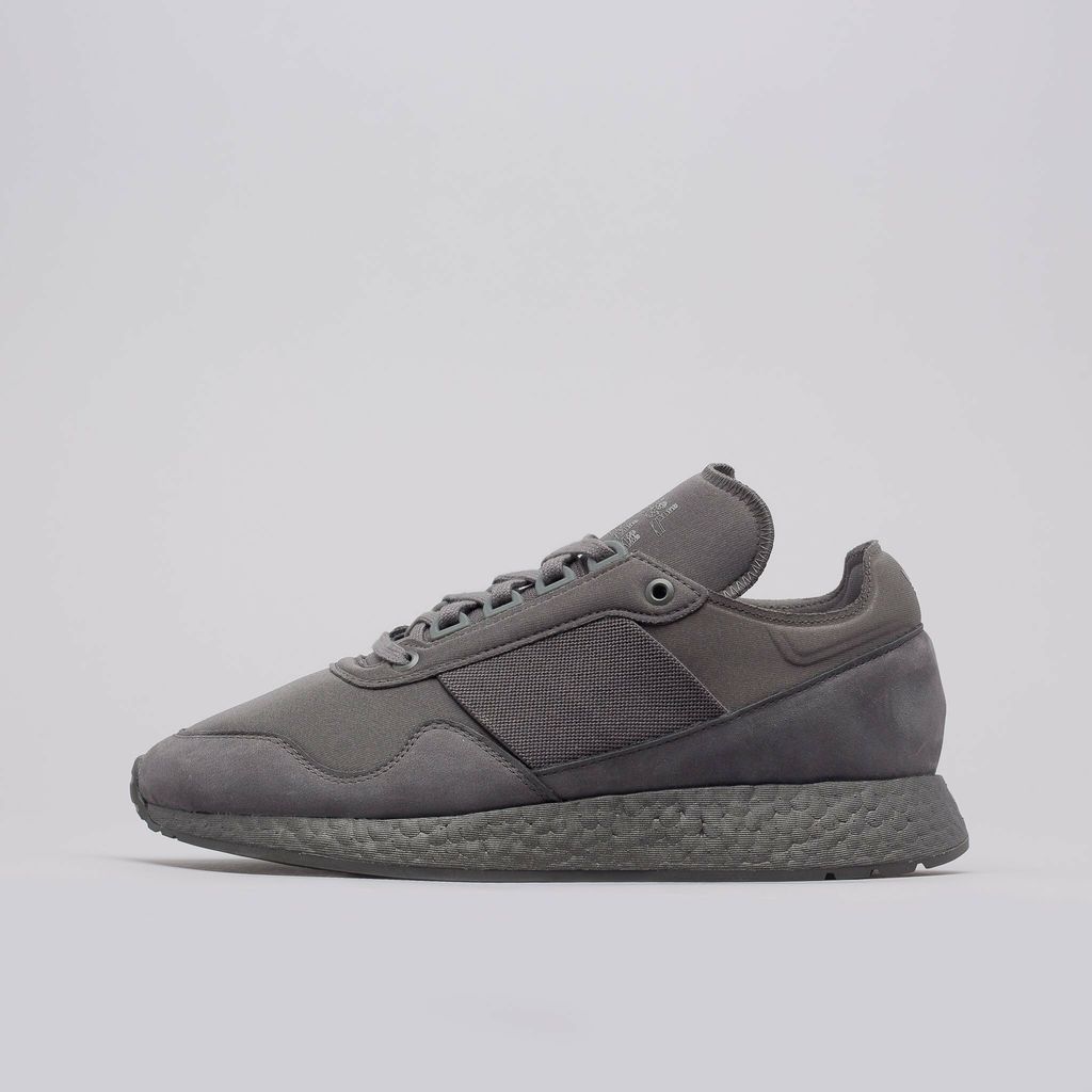 Grey Adidas x Daniel Arsham collaboration sneaker. Multi-talented artist Daniel Arsham brings a unique aesthetic to a shoe detailed with neoprene insets, mixed finishes, and pockmarked sole. Leather and fabric upper and lining, rubber sole, lace up style, and classic Adidas Boost foam sole. Brand new in sealed original box.