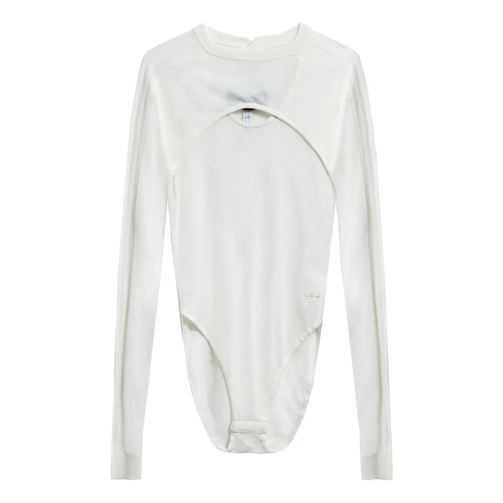 From their collaboration with contemporary designer Danielle Cathari, this Adidas bodysuit is a game changing layering piece. Features sheer body fabrication, curved hem chest, button back neck closure, and faint three stripe design down arms.