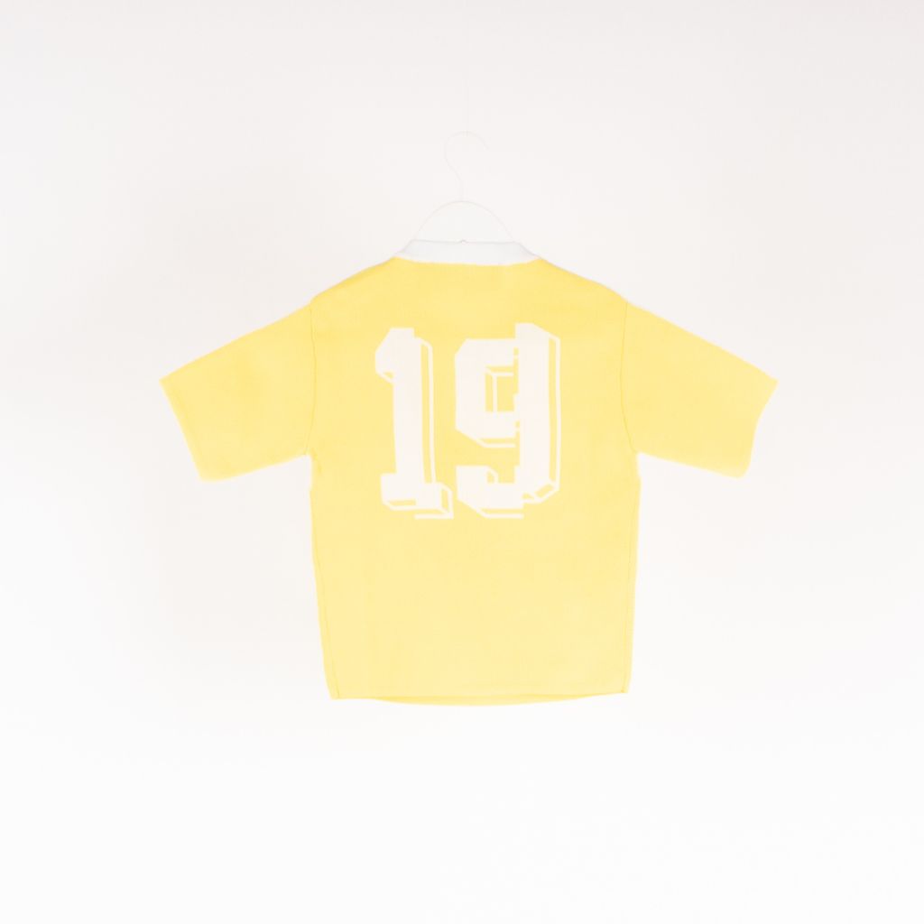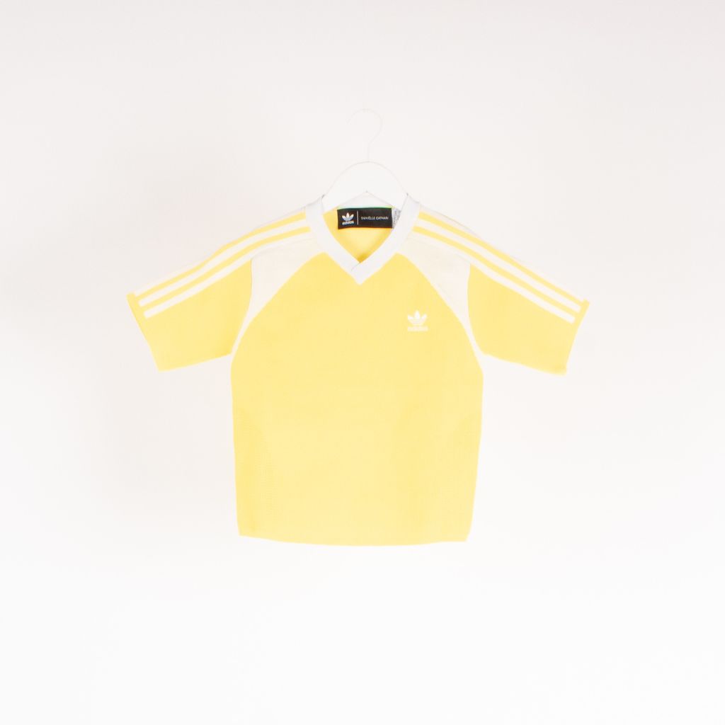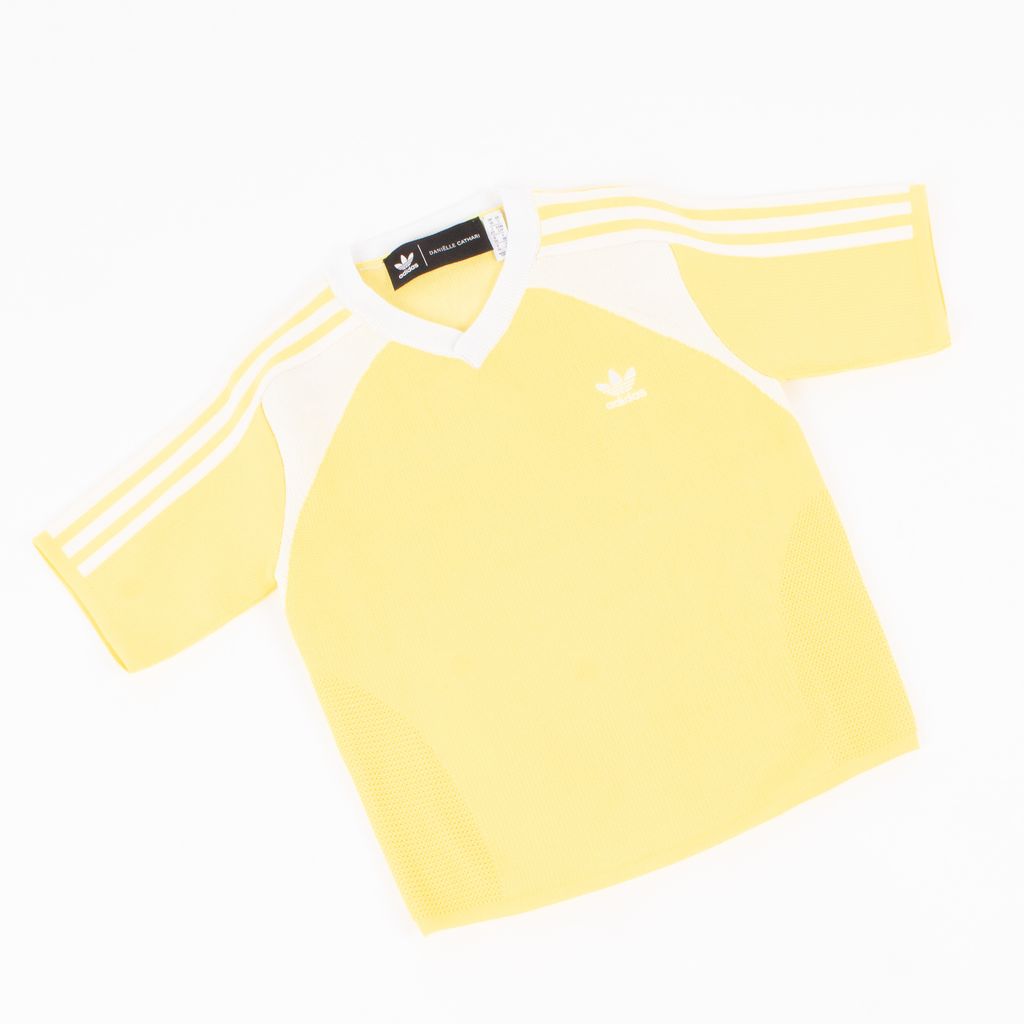 On the court or on the street stay looking chic in this knit top from Adidas' collaboration with designer Danielle Cathari. Shop the matching shorts from the same seller! Features knit body construction, duotone color scheme, V neck shape, stripes on shoulders, Adidas logo and trefoil on chest, and number 19 on back.