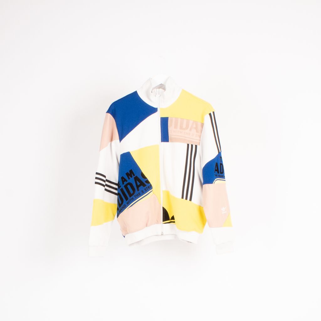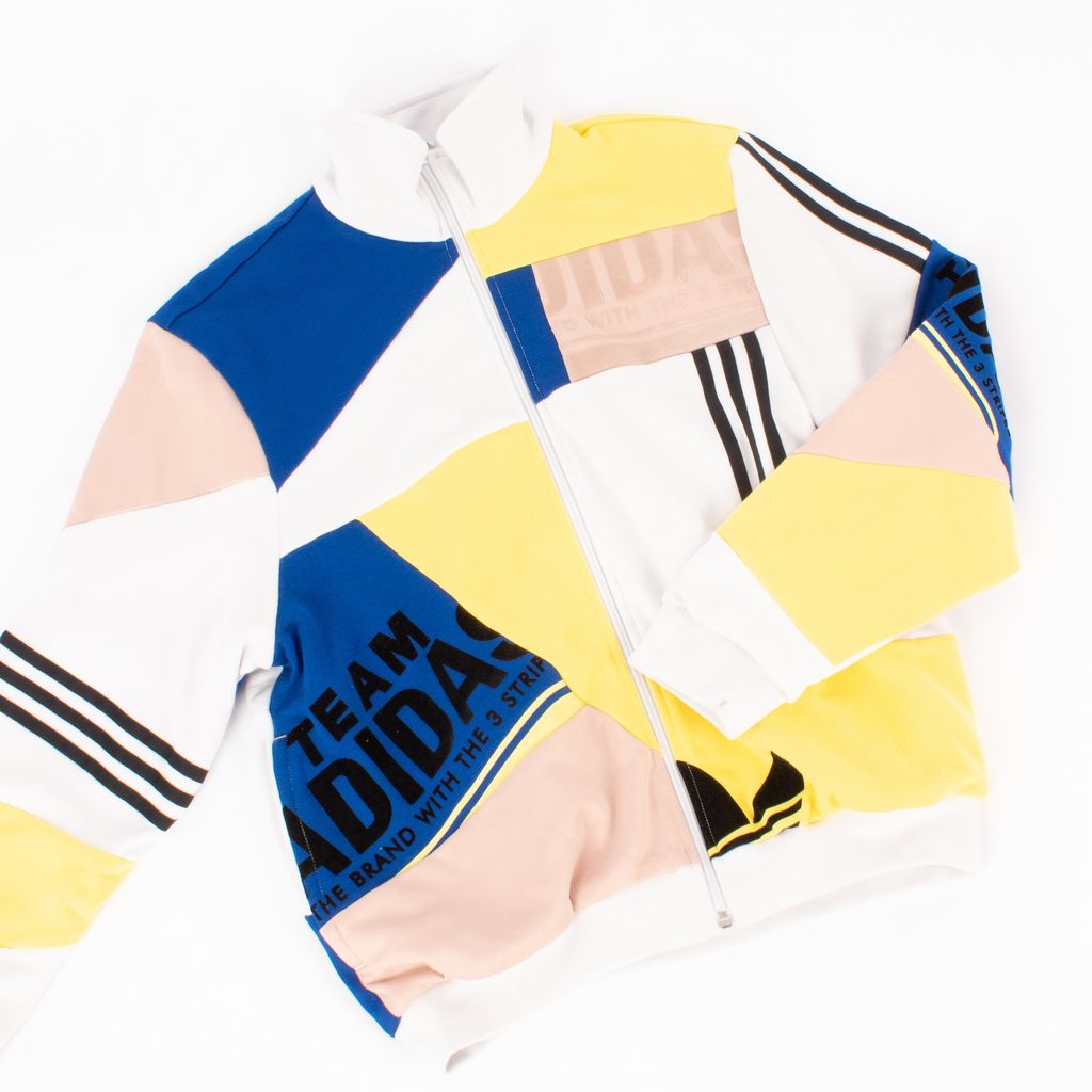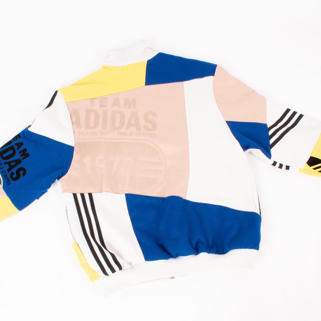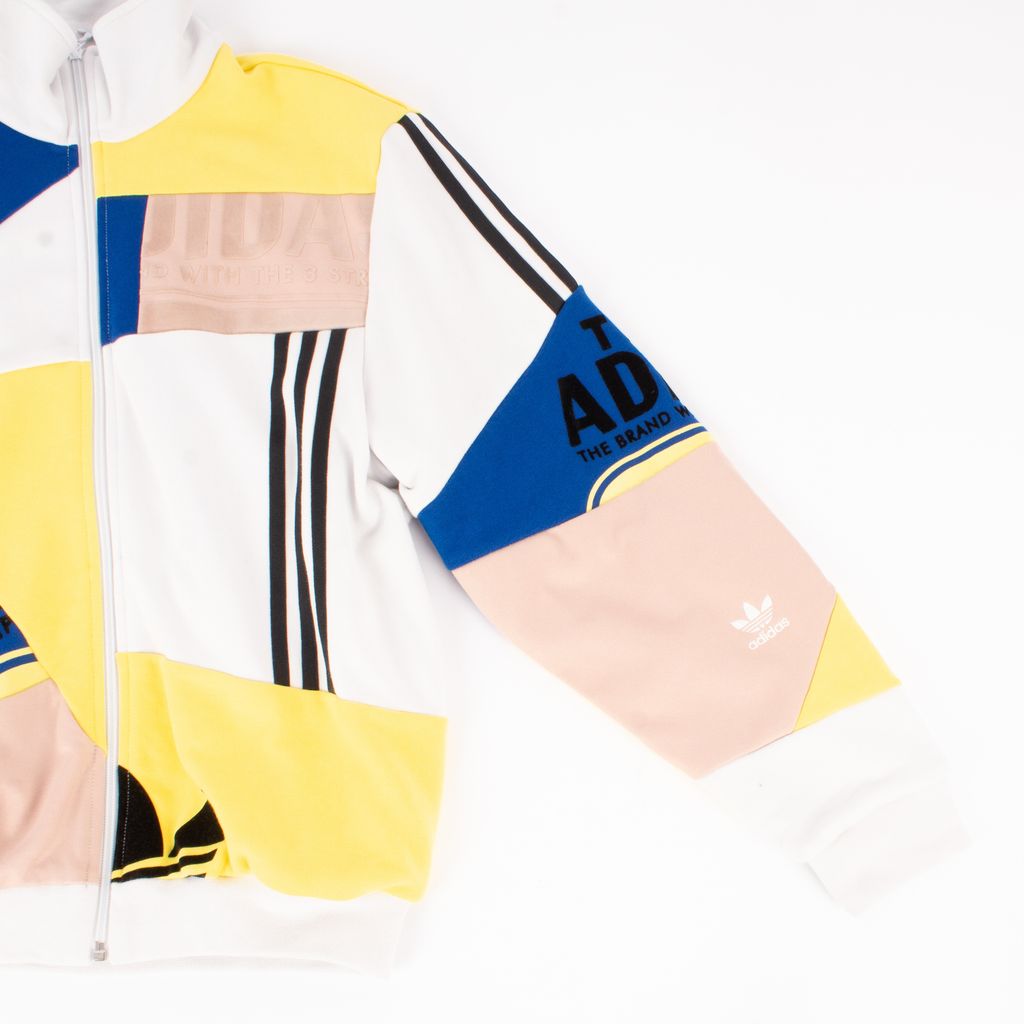 Part of their collaboration with designer Danielle Cathari, this track jacket from Adidas breathes new life into an old classic. Features patchwork design, multi color scheme, high neck, zip front closure, and rib knit bands at neck, waist and wrists.