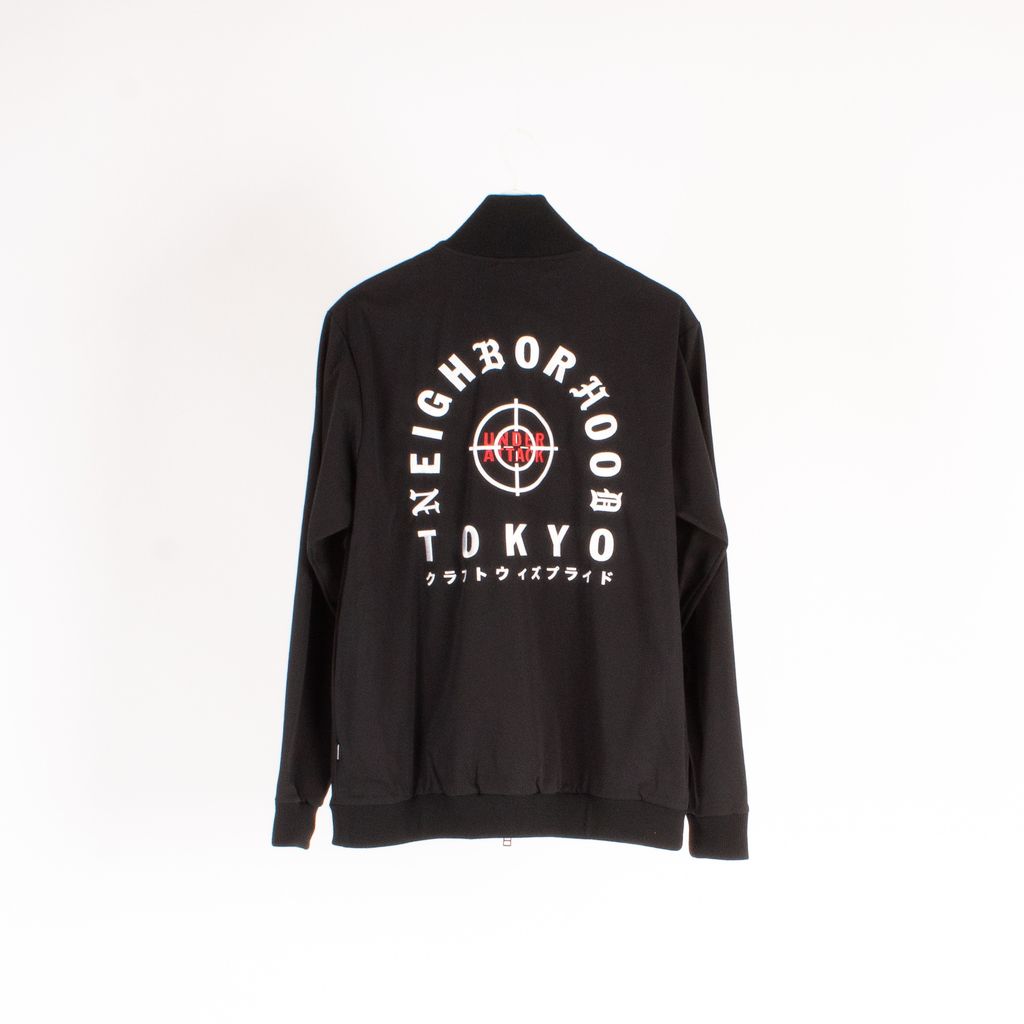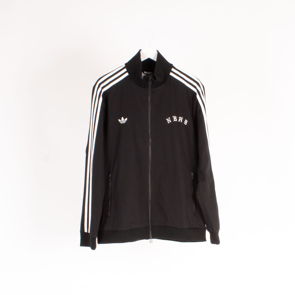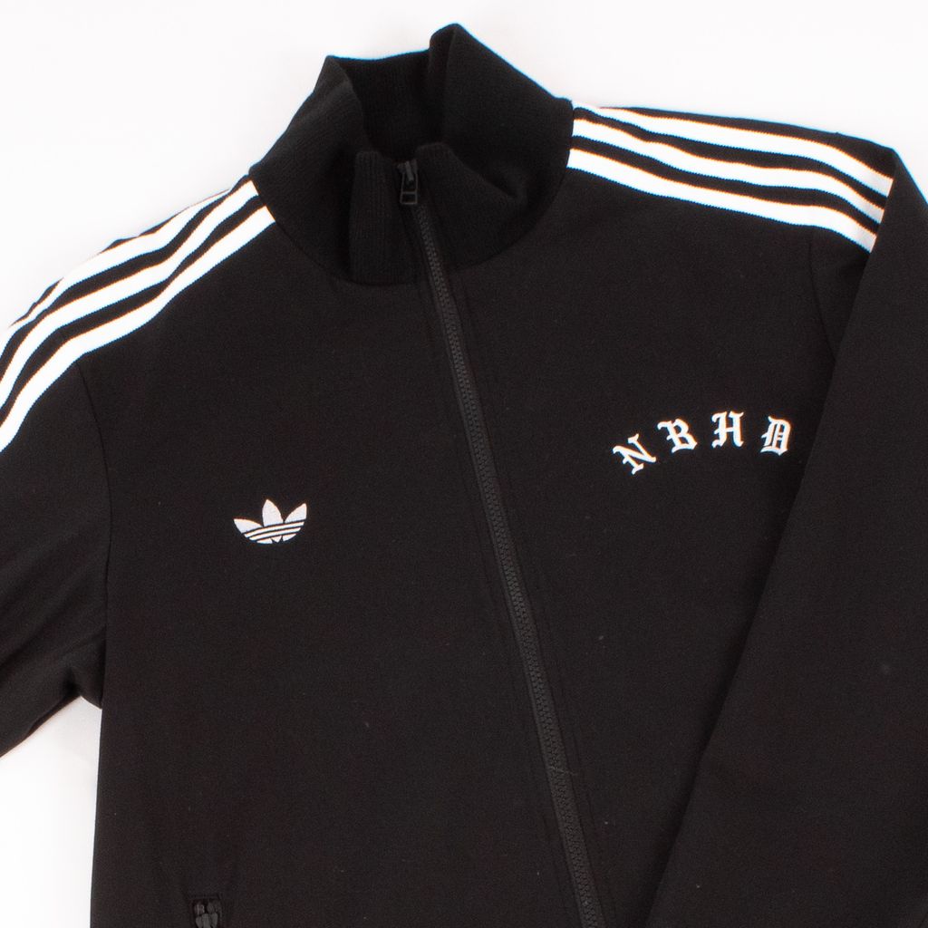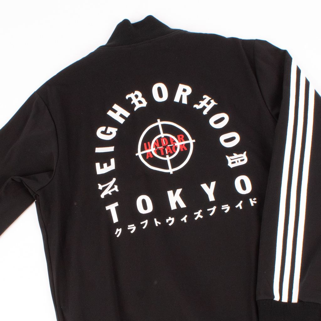 From a collaboration with Japanese brand NEIGHBORHOOD, this Adidas track jacket combine a sleek tailored cut with edgy graphics. Features artwork and text designed by Cali Thornhill DeWitt, monochromatic dual zipper front closure, triple stripe detailing down arms, embroidered graphics on chest and back, high neck, and monochromatic zipper closure side front pockets.