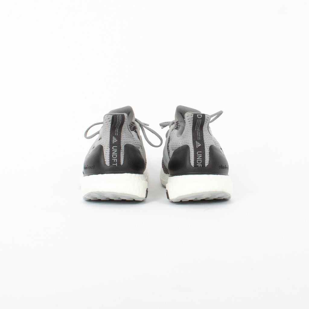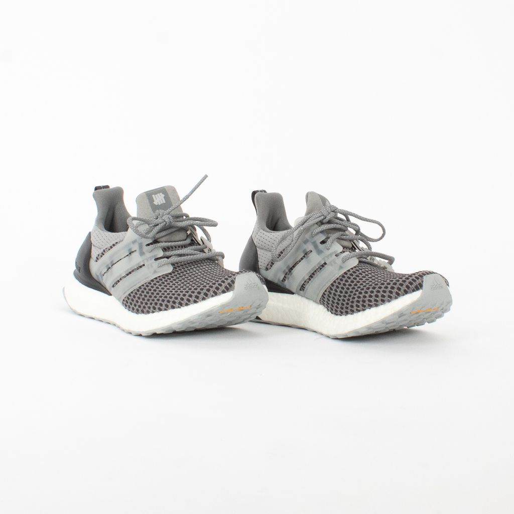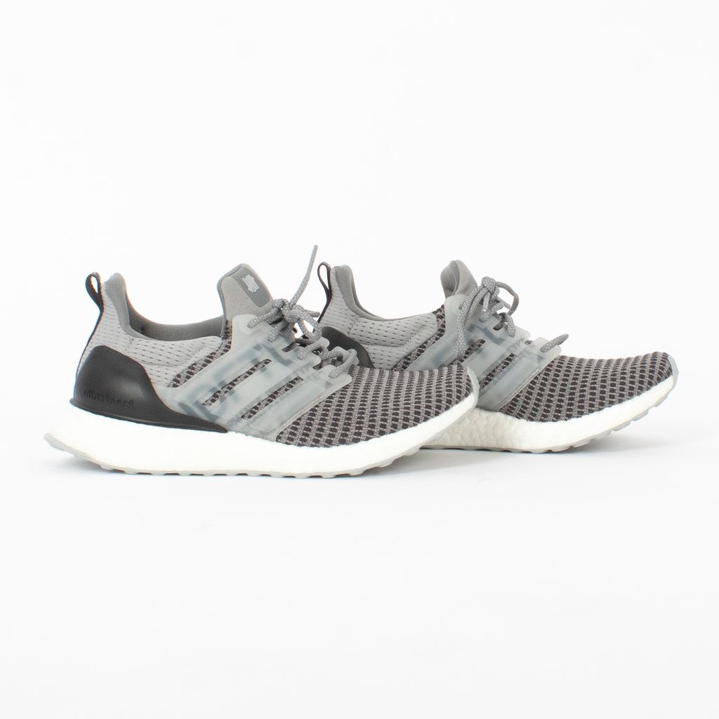 Coming from a recent collaboration between Undefeated and Adidas, these lightweight sneakers pack a heavy design punch. Features Ultra Boost cushioned and contrast colored sole, semi-sheer lace up overlay with UNDFTD text, all over mesh body construction, tonal grey coloring on interior neck, Undefeated logo on tongue, tonal laces, and Undefeated x Adidas trim/pull tab at heel.