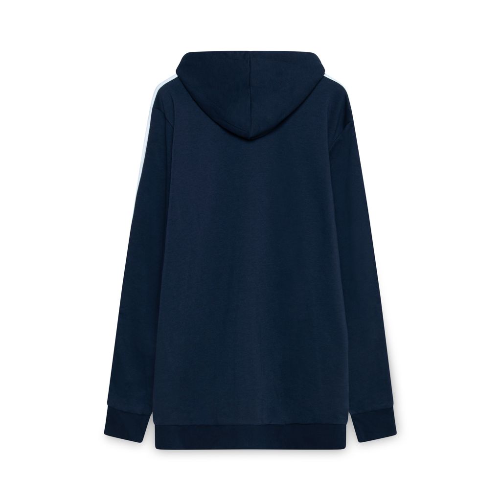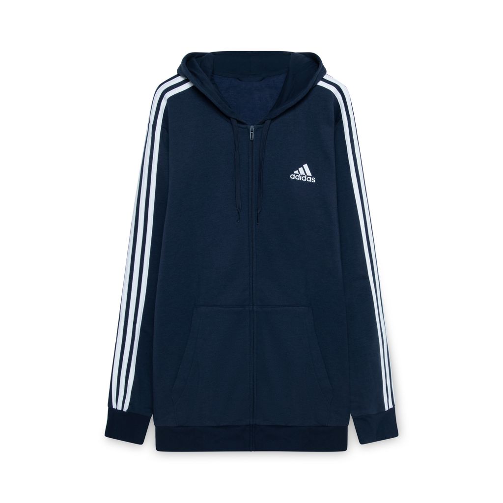 Adidas zip up hoodie features signature three stripes on sides, two from pockets, ribbing at cuffs and hem, and single front zipper closure.
