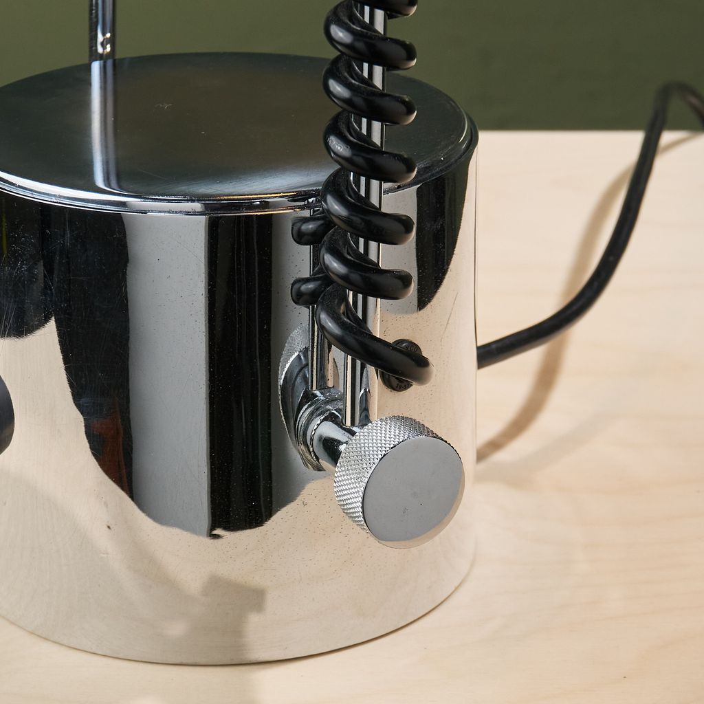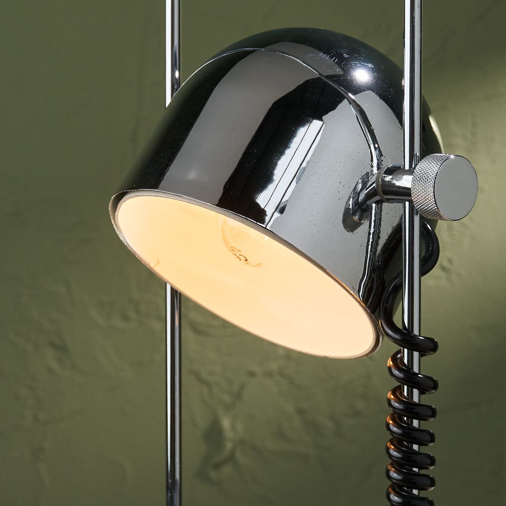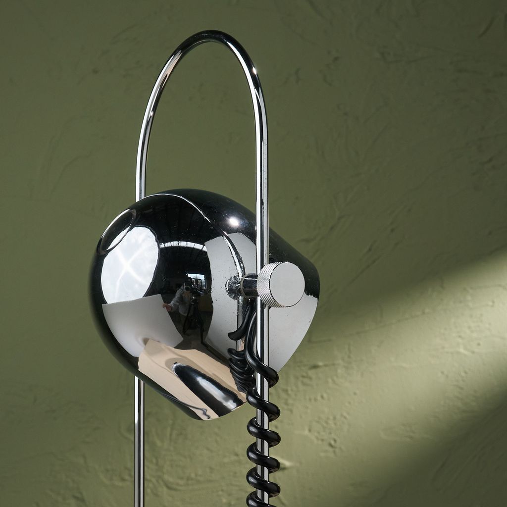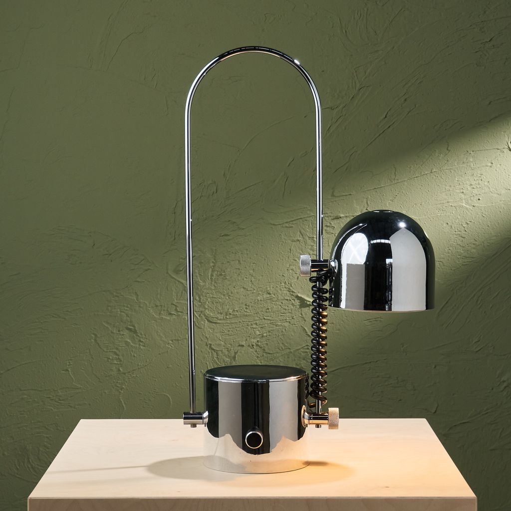 The BA-5473 table lamp was designed by Josep Maria Magem and produced by Madom in Spain during the 1970s. Usually found in a colored version, this one is a rare unusual version in chrome plated steel, it consists of an extremely heavy and solid base, an adjustable U-Shaped vertical stem, and a movable shade. The stem can be raised, lowered, or angled to create multiple light positions, and the shade can be repositioned along the stem to modify height and direction. During the 1970s, Spanish industrial design expanded alongside broader European developments in lighting and furniture production, with manufacturers such as Madom Design focusing on metal fabrication and serial production. Josep Maria Magem worked within this context, contributing designs that reflect the material and technical approaches present in Spain at the time.