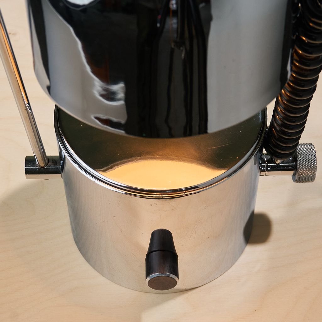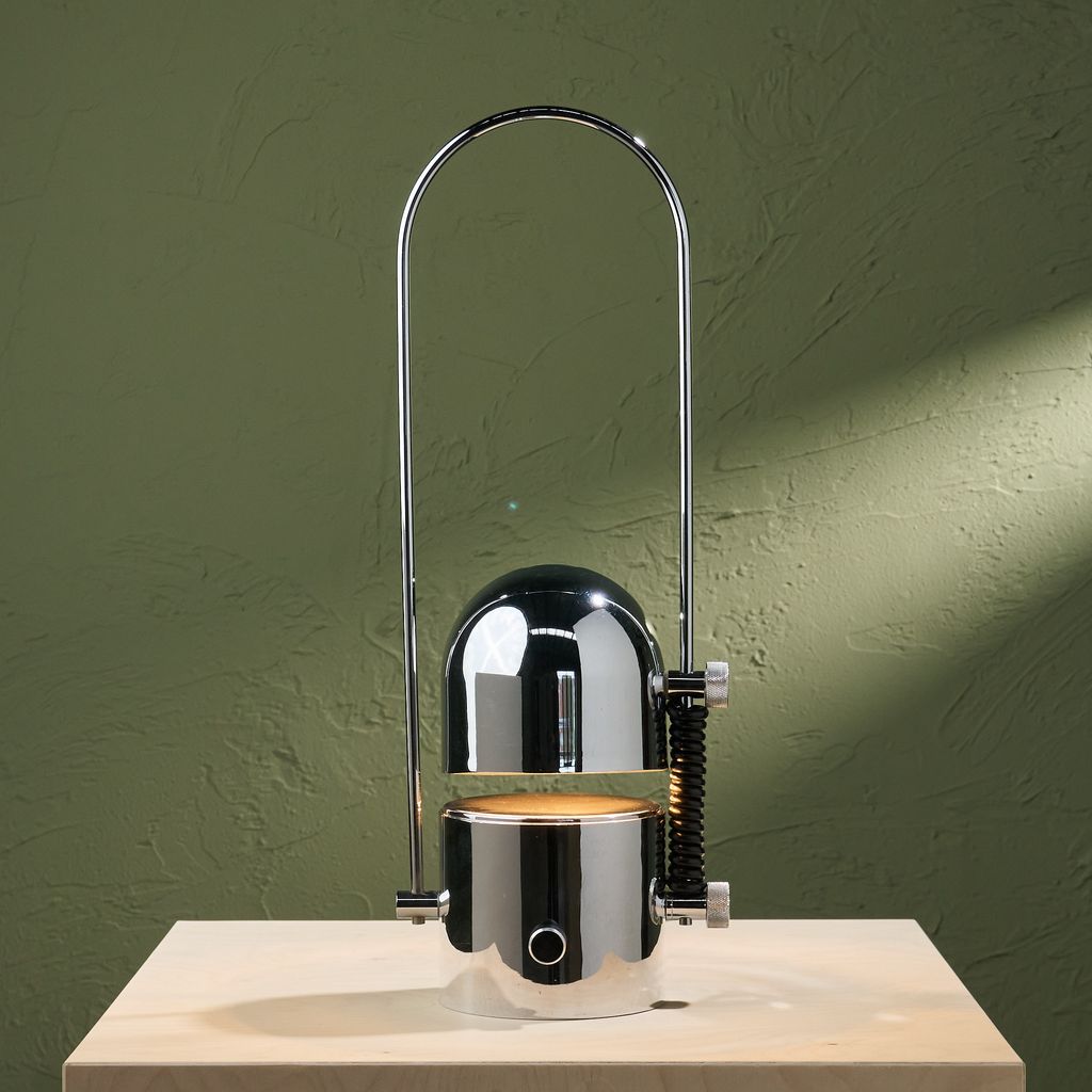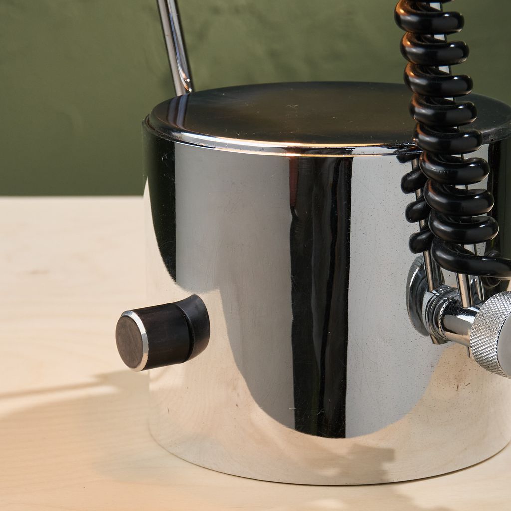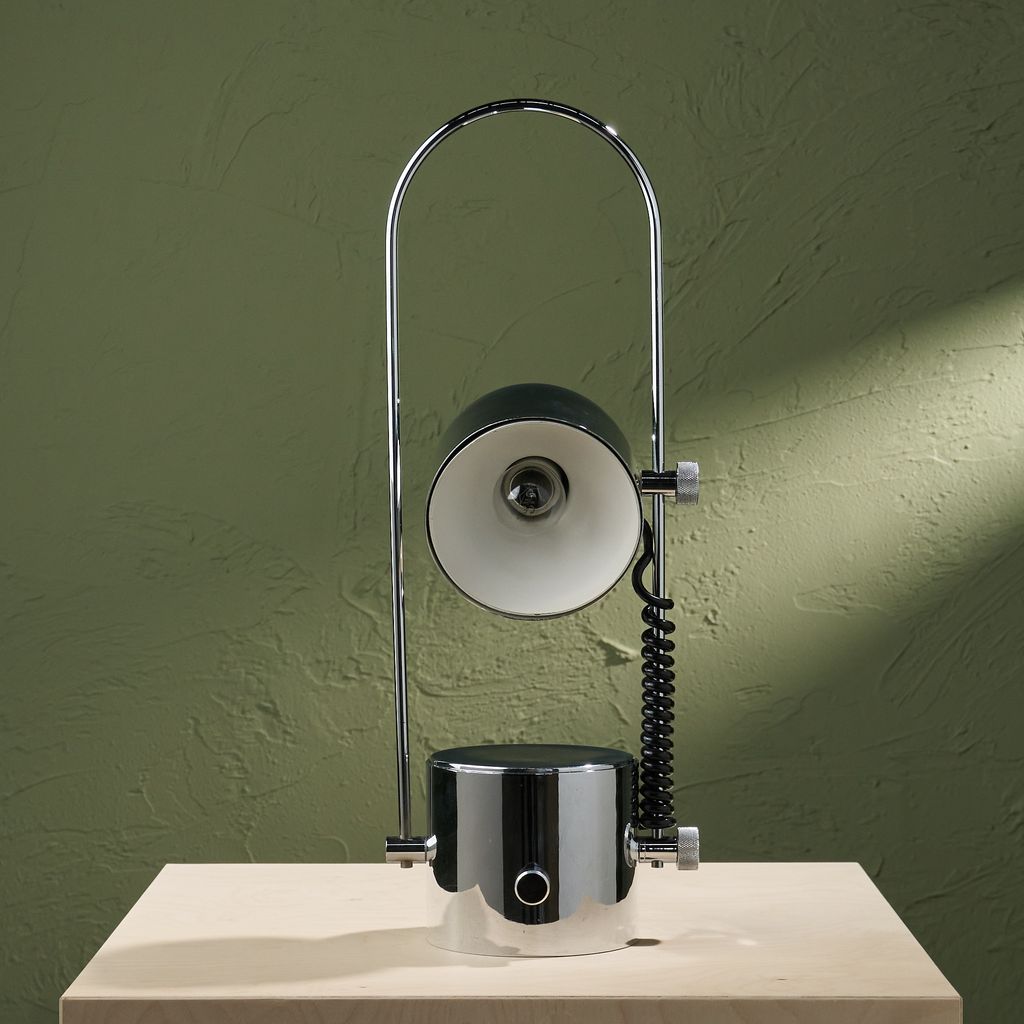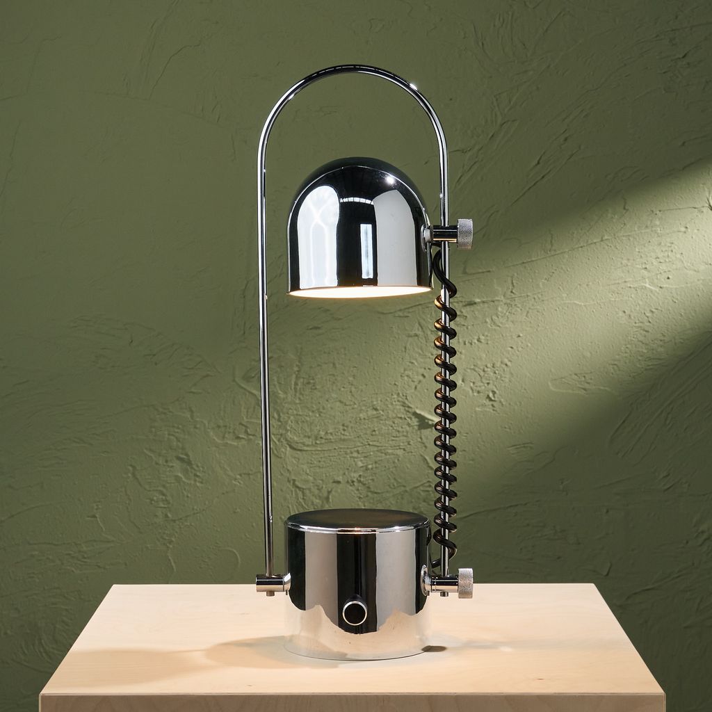 The BA-5473 table lamp was designed by Josep Maria Magem and produced by Madom in Spain during the 1970s. Usually found in a colored version, this one is a rare unusual version in chrome plated steel, it consists of an extremely heavy and solid base, an adjustable U-Shaped vertical stem, and a movable shade. The stem can be raised, lowered, or angled to create multiple light positions, and the shade can be repositioned along the stem to modify height and direction. During the 1970s, Spanish industrial design expanded alongside broader European developments in lighting and furniture production, with manufacturers such as Madom Design focusing on metal fabrication and serial production. Josep Maria Magem worked within this context, contributing designs that reflect the material and technical approaches present in Spain at the time.