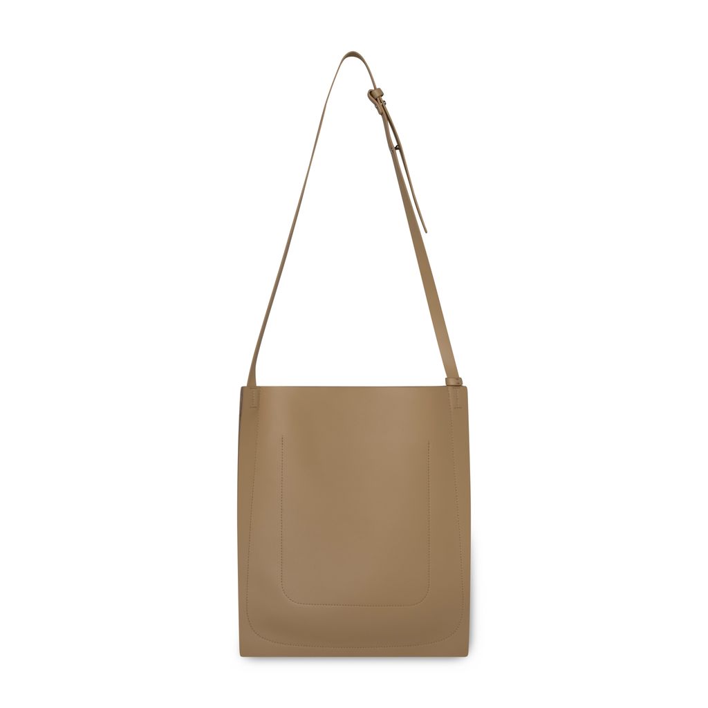 Adolfo Dominguez flat leather tote bag features, silver foiled spell out at bottom front, single adjustable flat strap, suede lining with single internal pocket.
