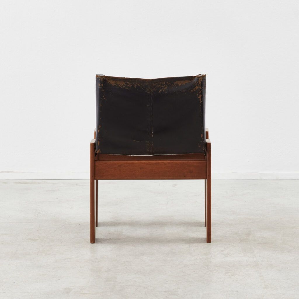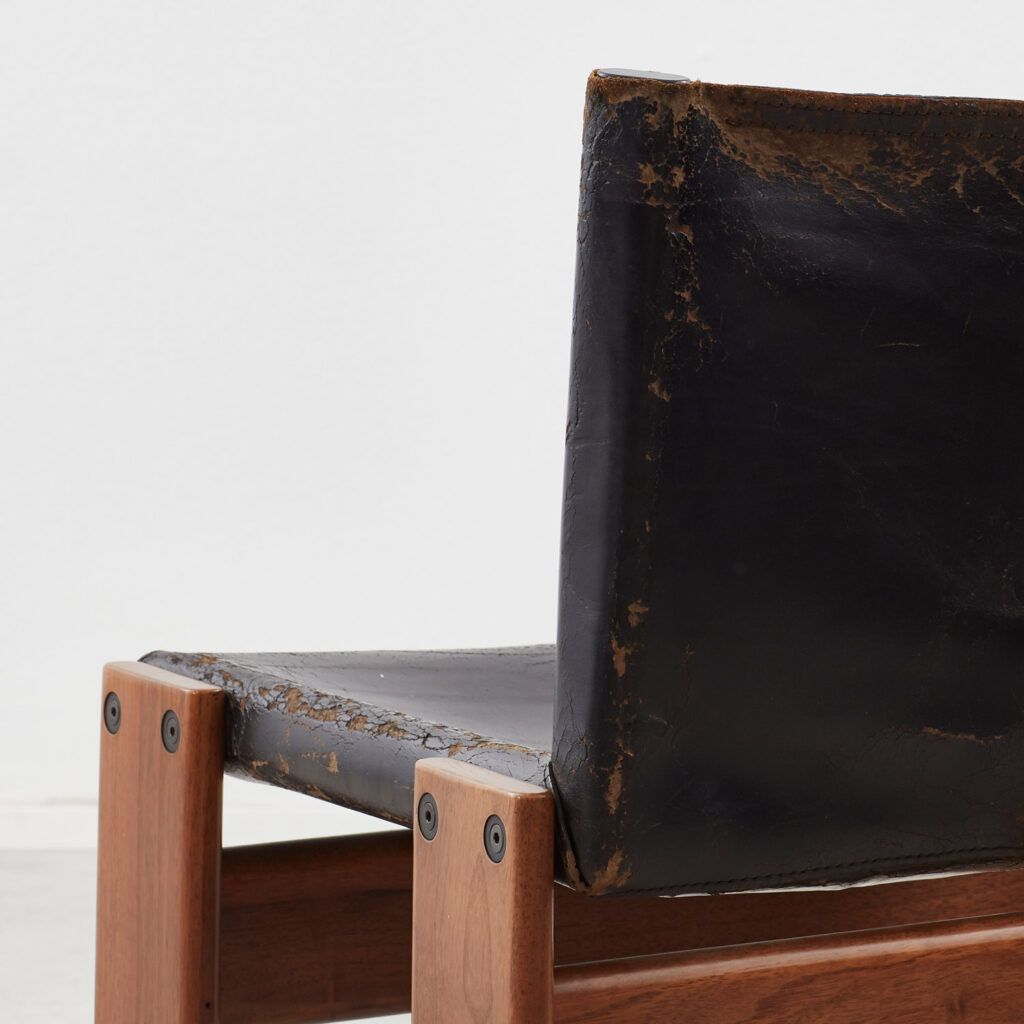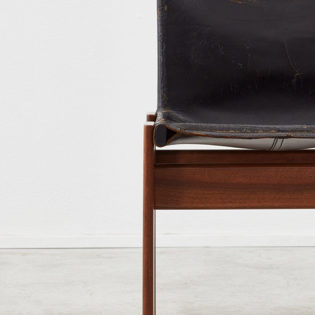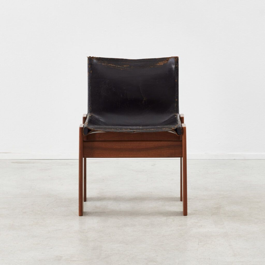 The Monk chair is one of many distinctive and highly regarded designs from the pair. Its humble form is comprised of two key materials, solid walnut legs with a black leather seat and backrest. Refined, functional and comfortable.
