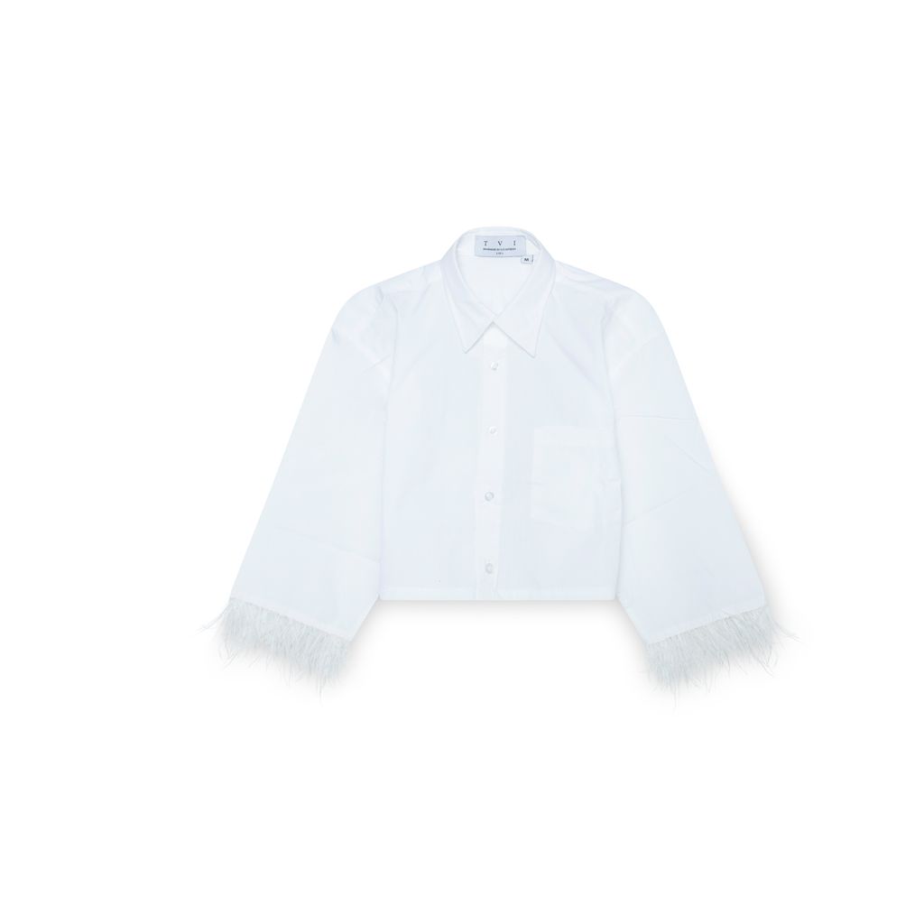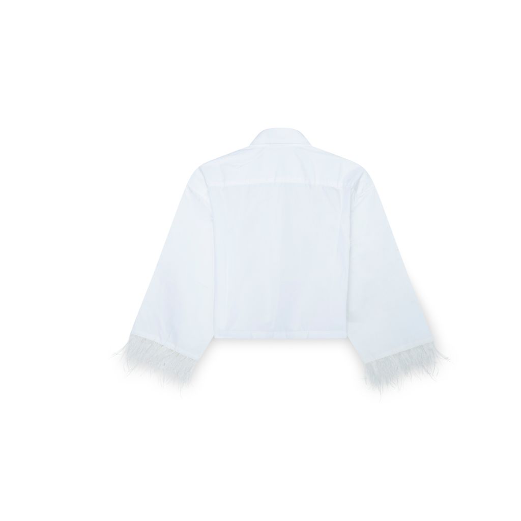 Features feathered trimming and button-up closure