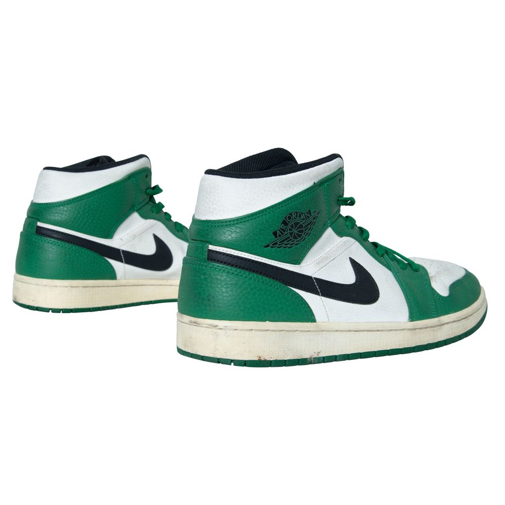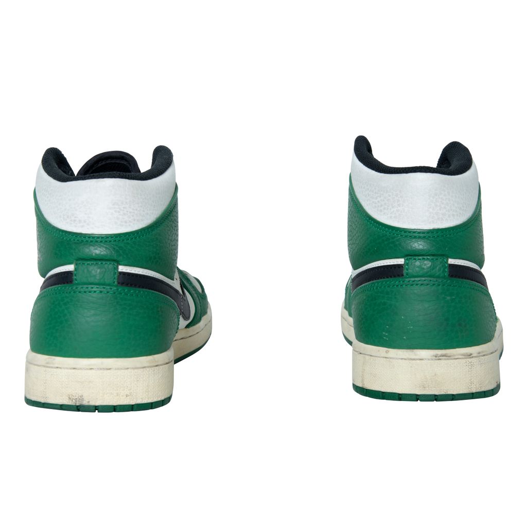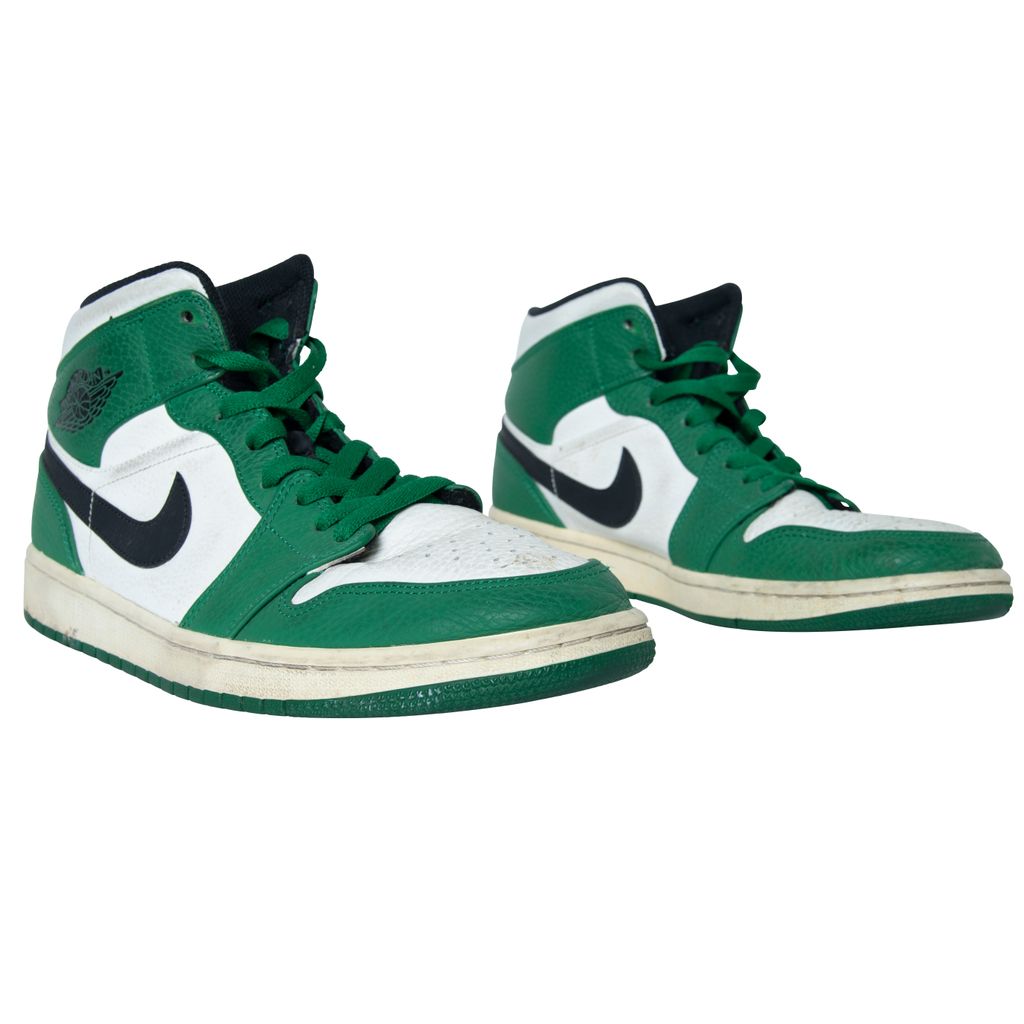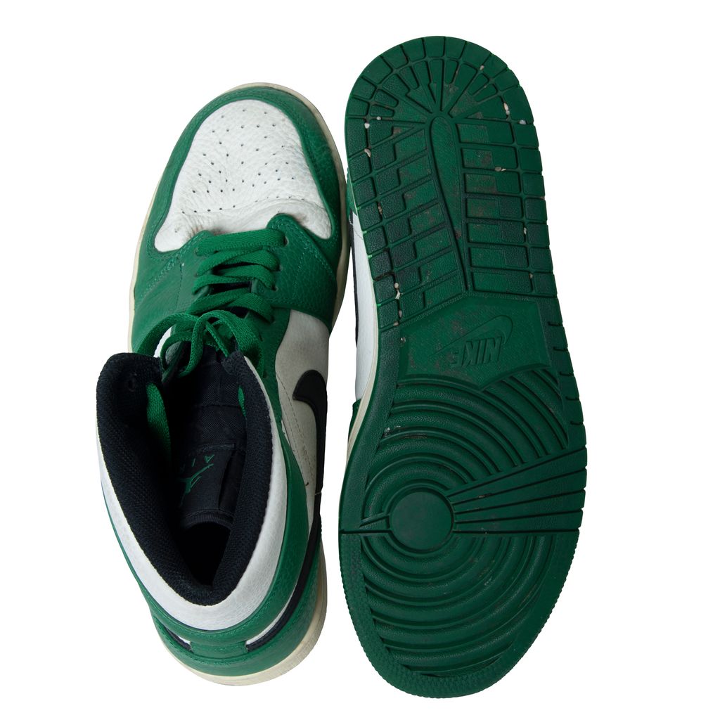 Air Jordan 1 High OG features black moderately worn, Nike swoosh, Air Jordan logo, and green laces.