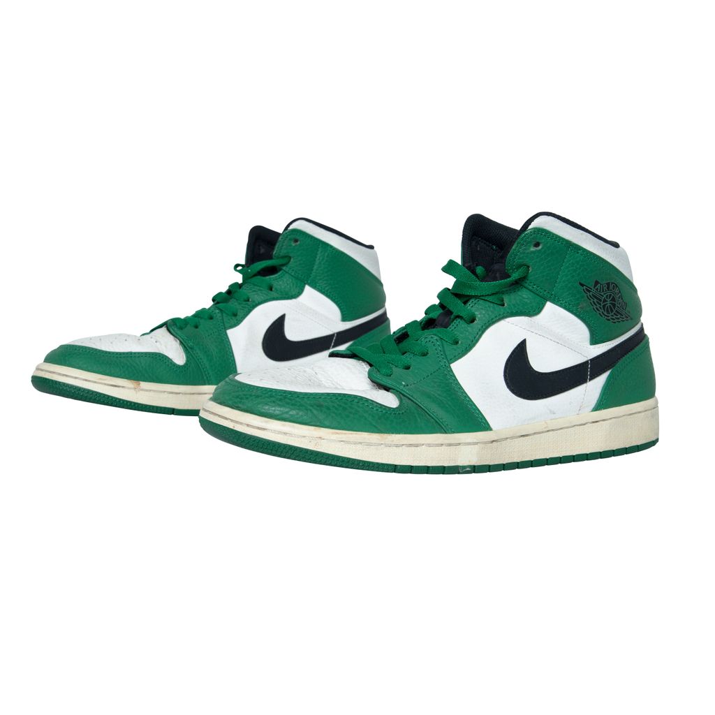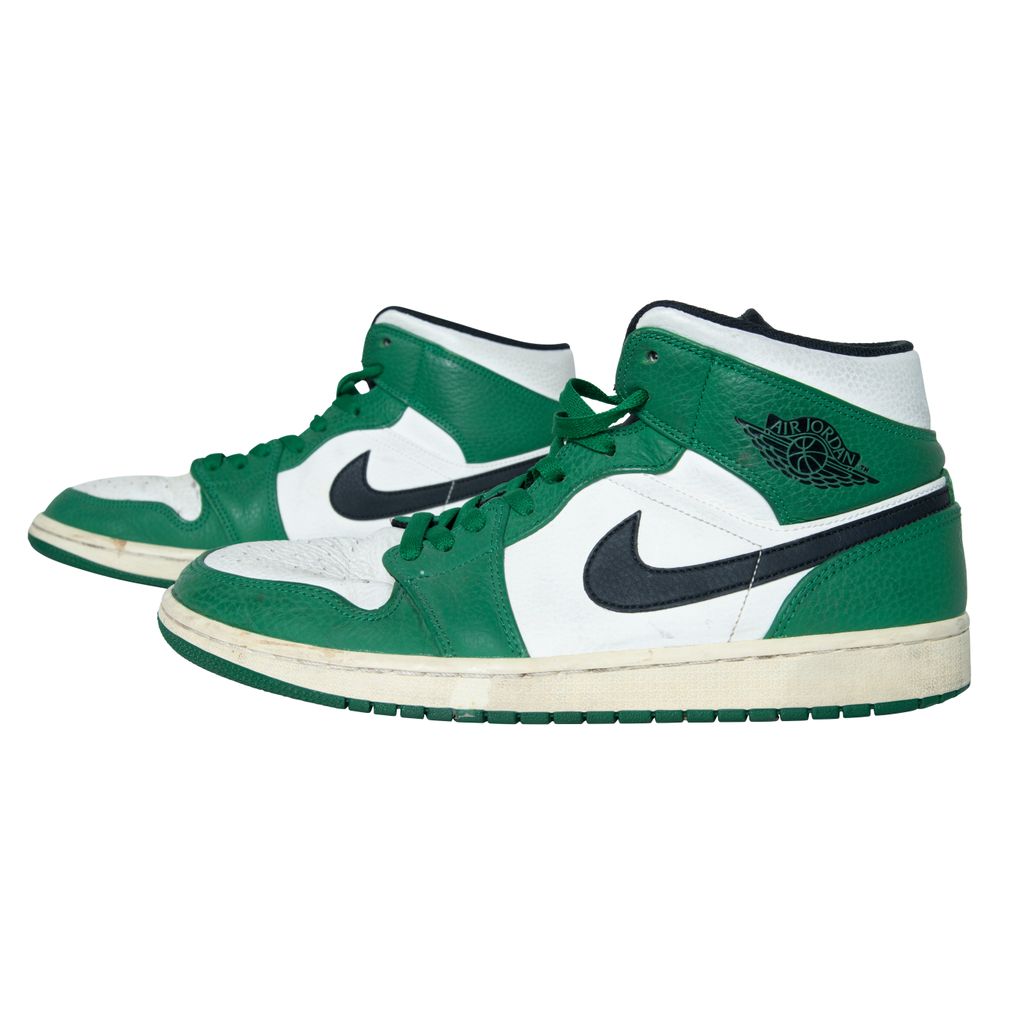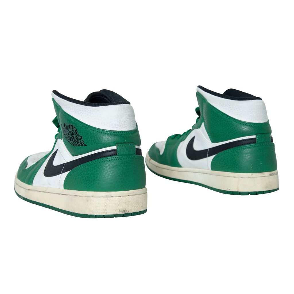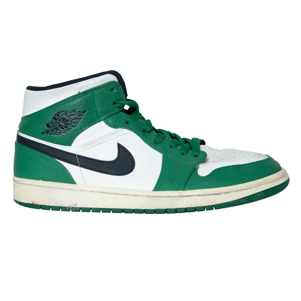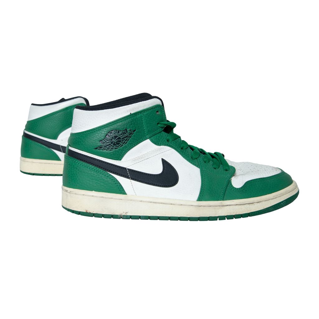 Air Jordan 1 High OG features black moderately worn, Nike swoosh, Air Jordan logo, and green laces.
