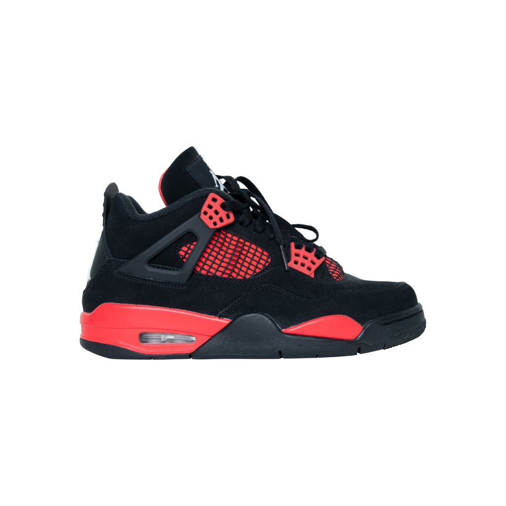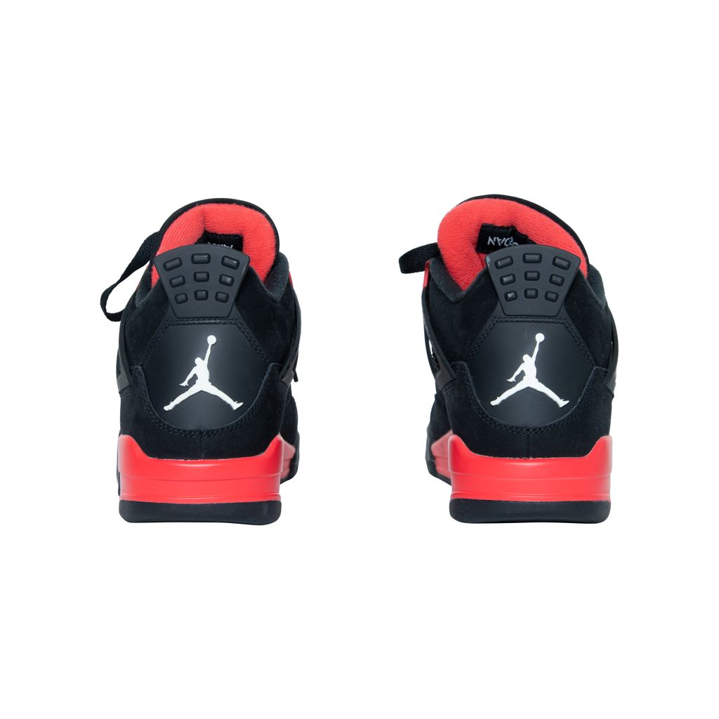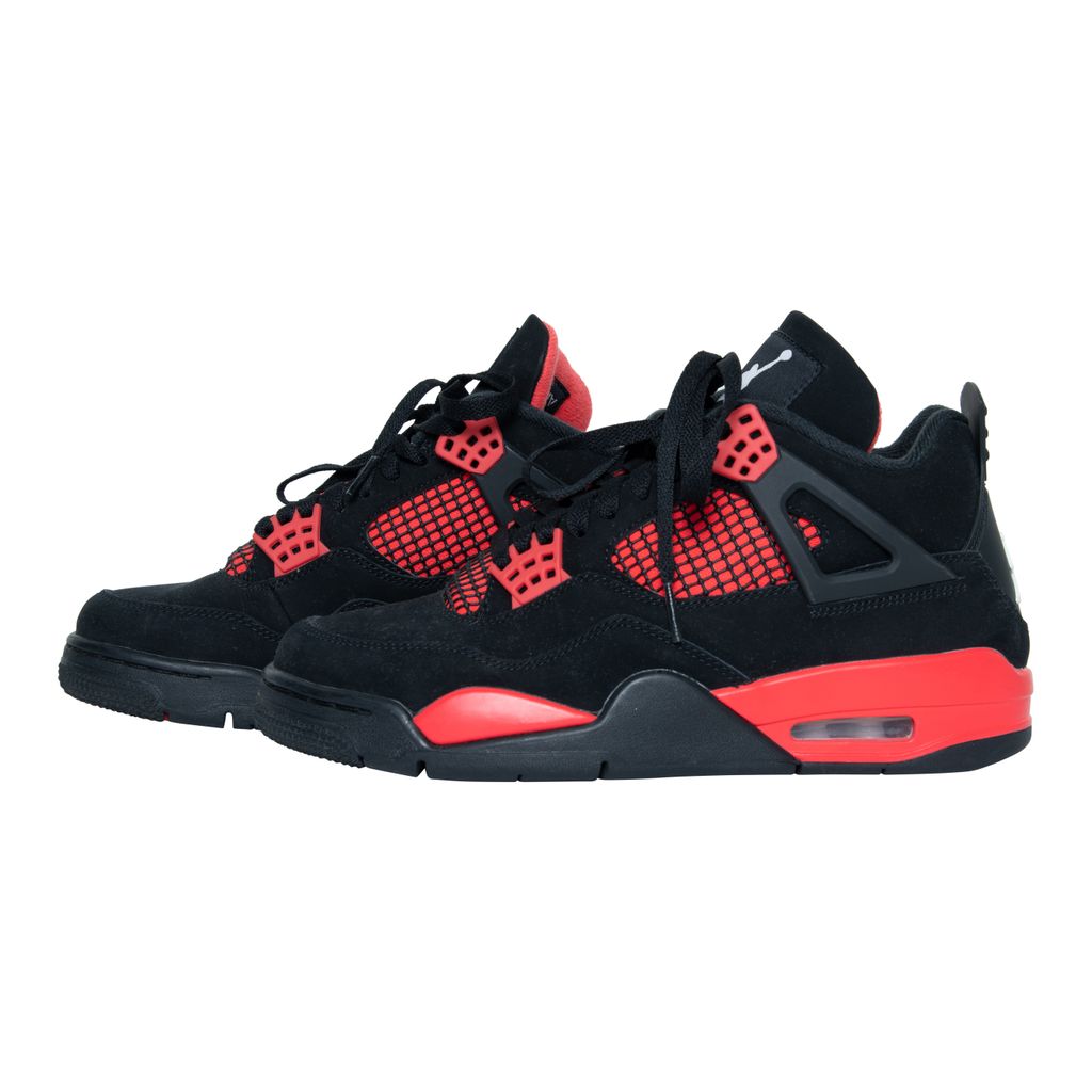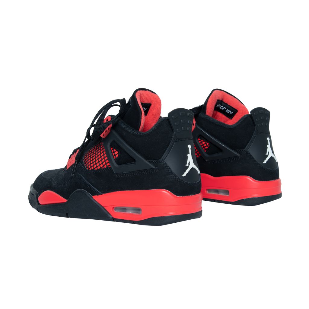 Air Jordan 4 Retro 'Red Thunder' features lace up at front, suede throughout, and Jordan logo at back and tongues.
