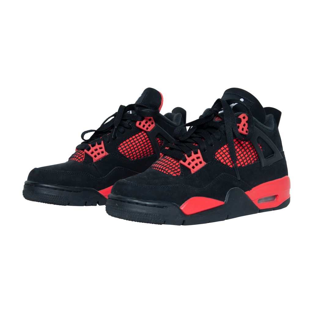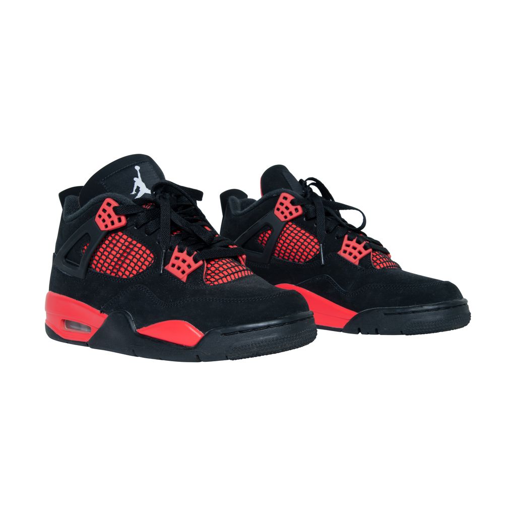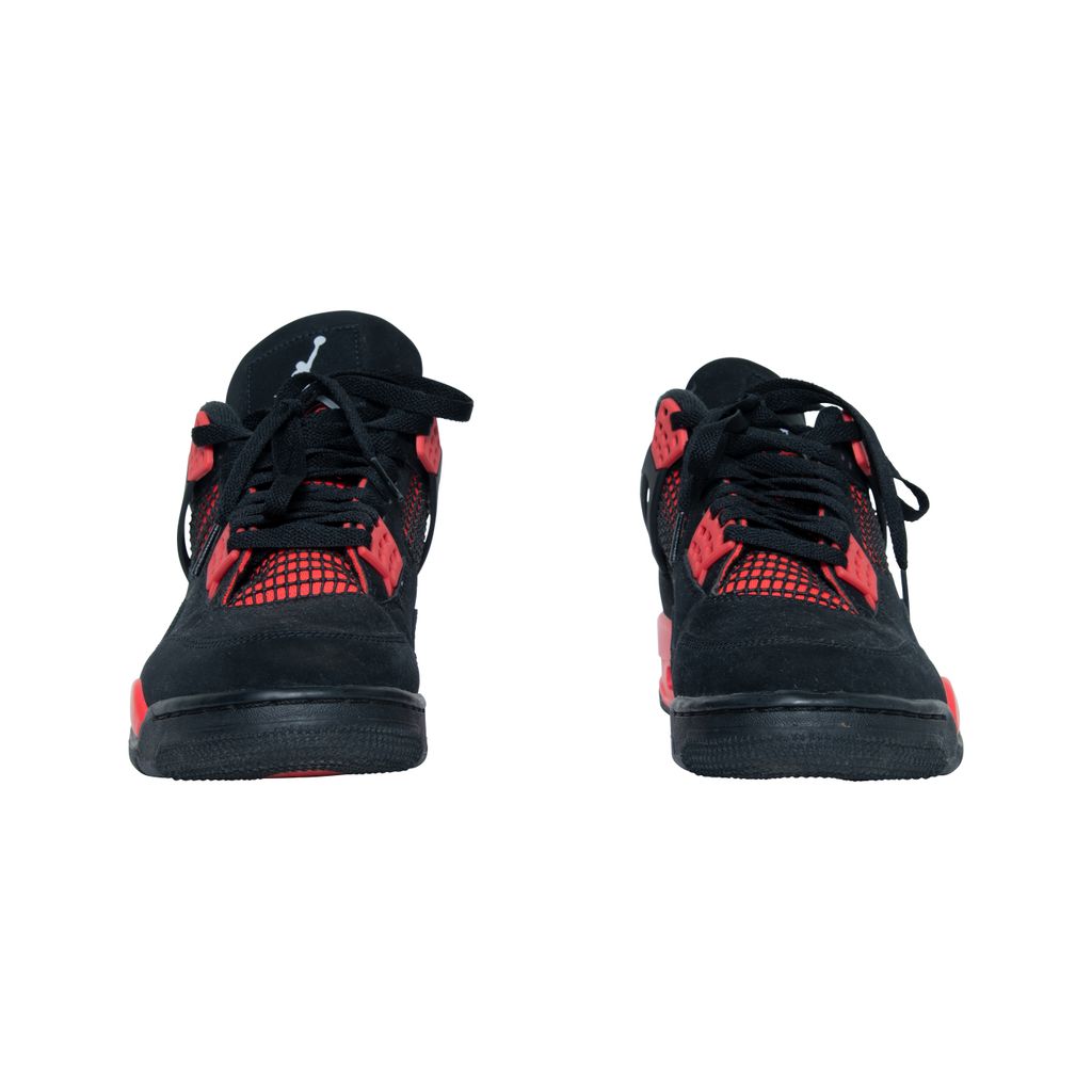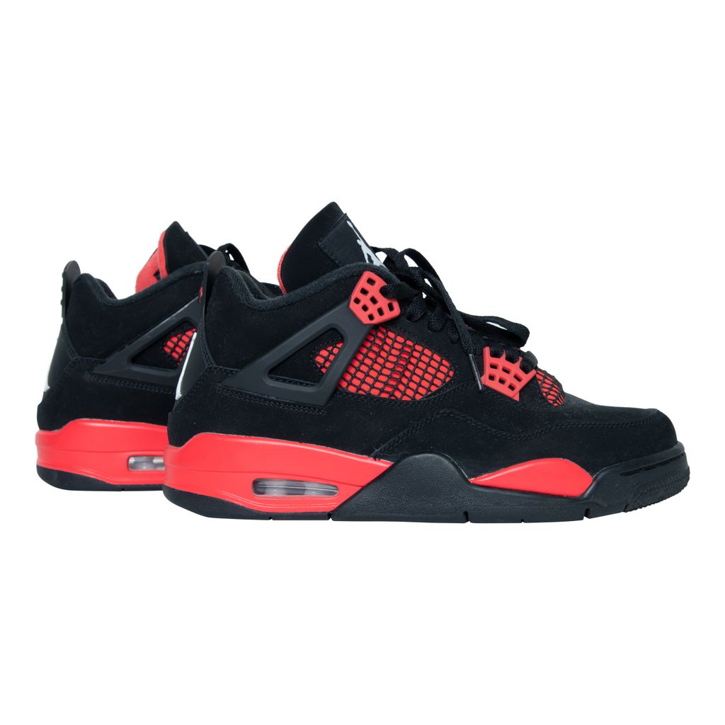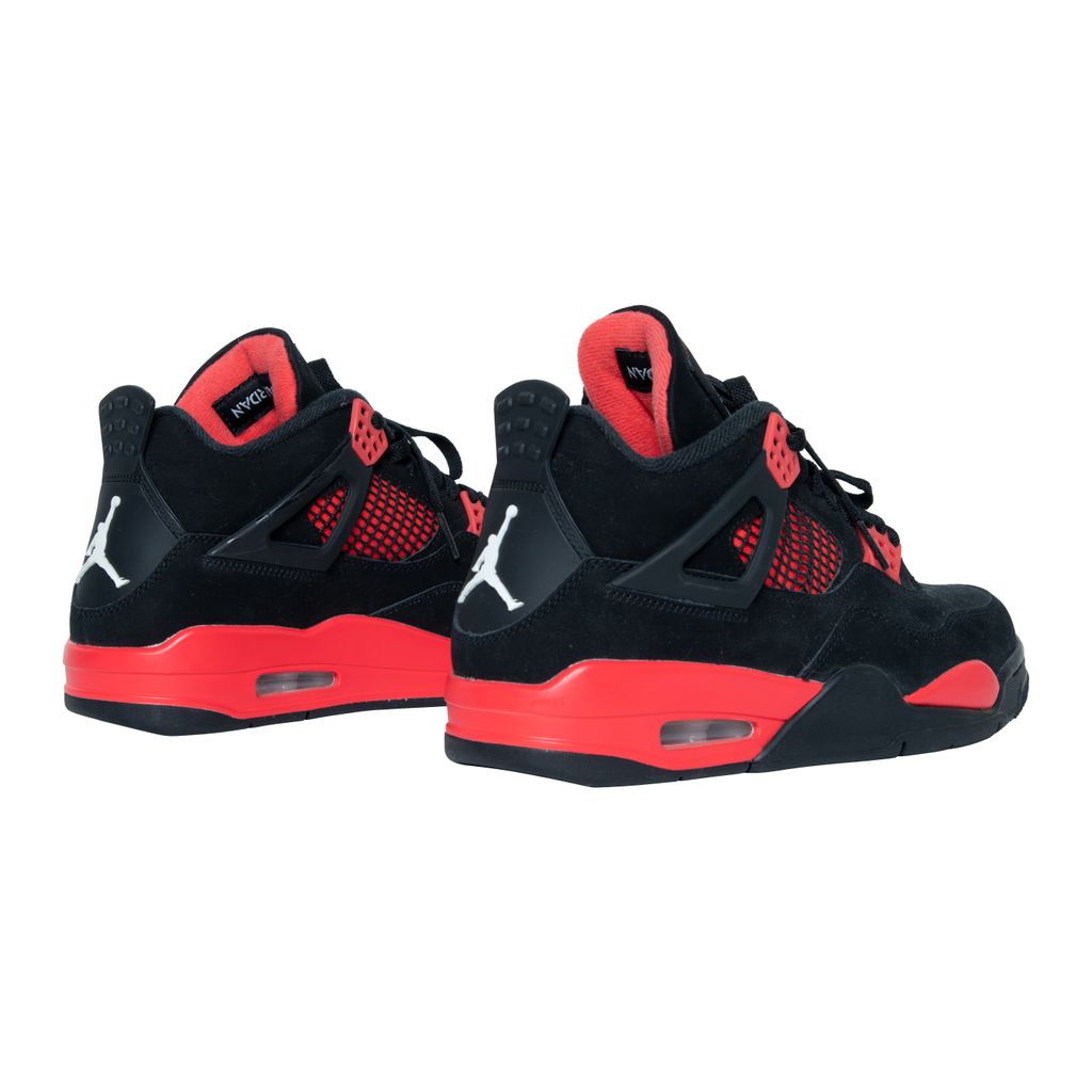 Air Jordan 4 Retro 'Red Thunder' features lace up at front, suede throughout, and Jordan logo at back and tongues.
