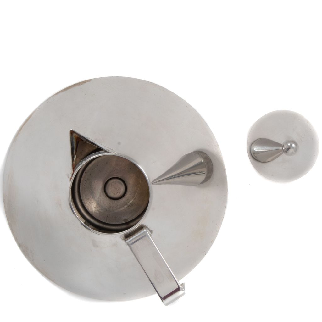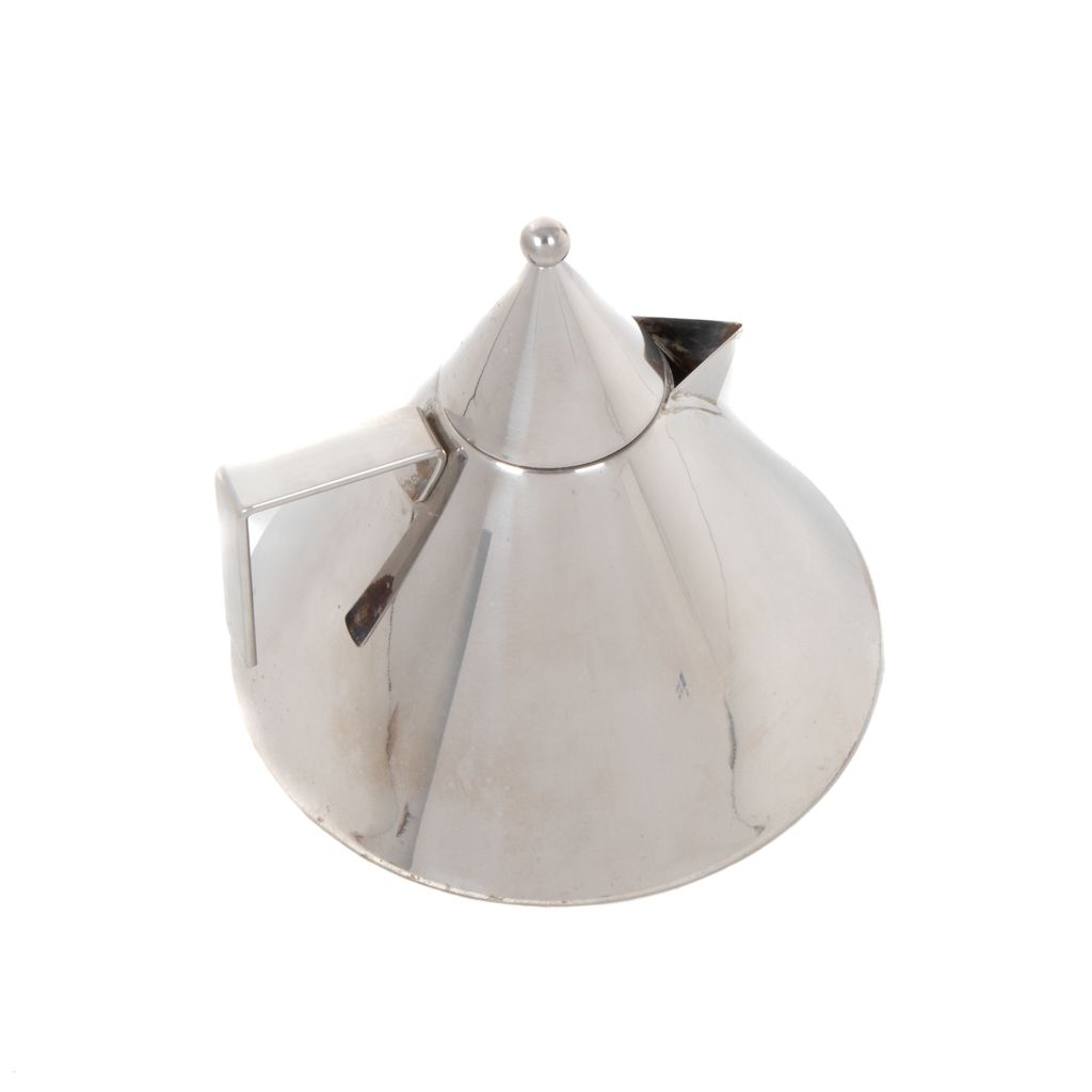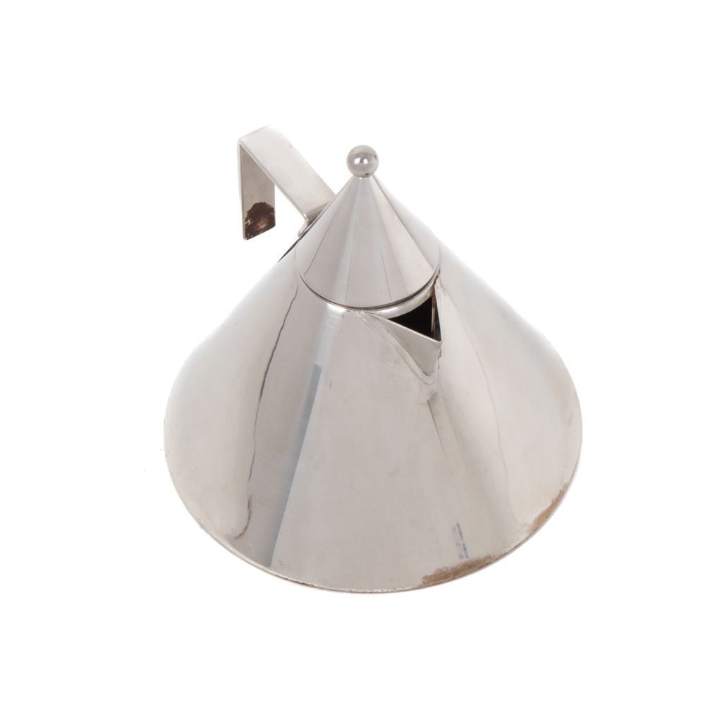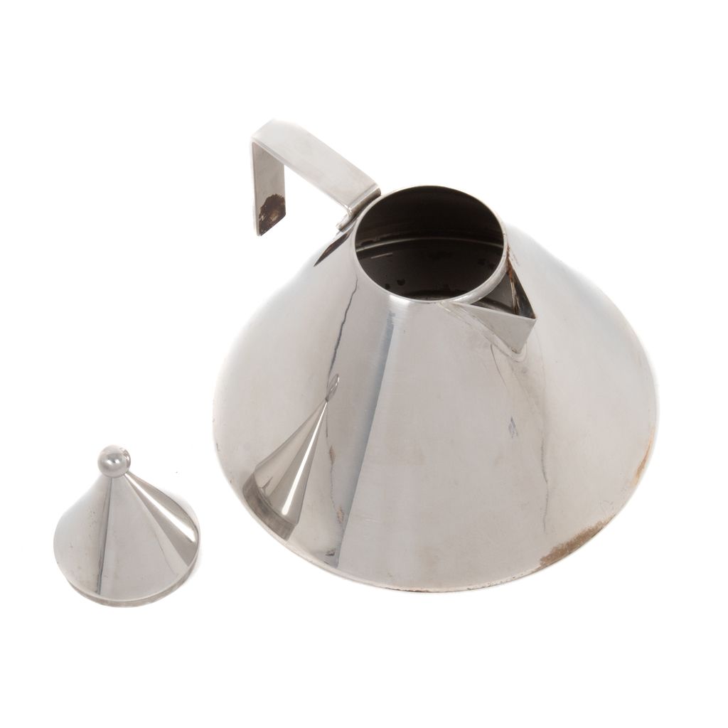 Continuing this legacy in the design and creation of the Il Conico water kettle, the piece itself is composed of a simple geometric shape, the cone with other small understated embellishments, such as the spherical knob on top. Although these are primary shapes, the piece is extremely distinguished and elegant. It is made from 18/10 mirror-polished stainless steel with a magnetic heat diffusing bottom for induction cooking.