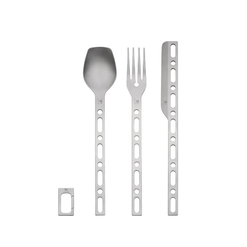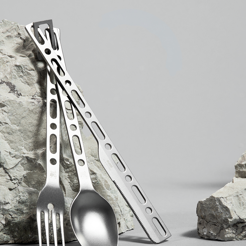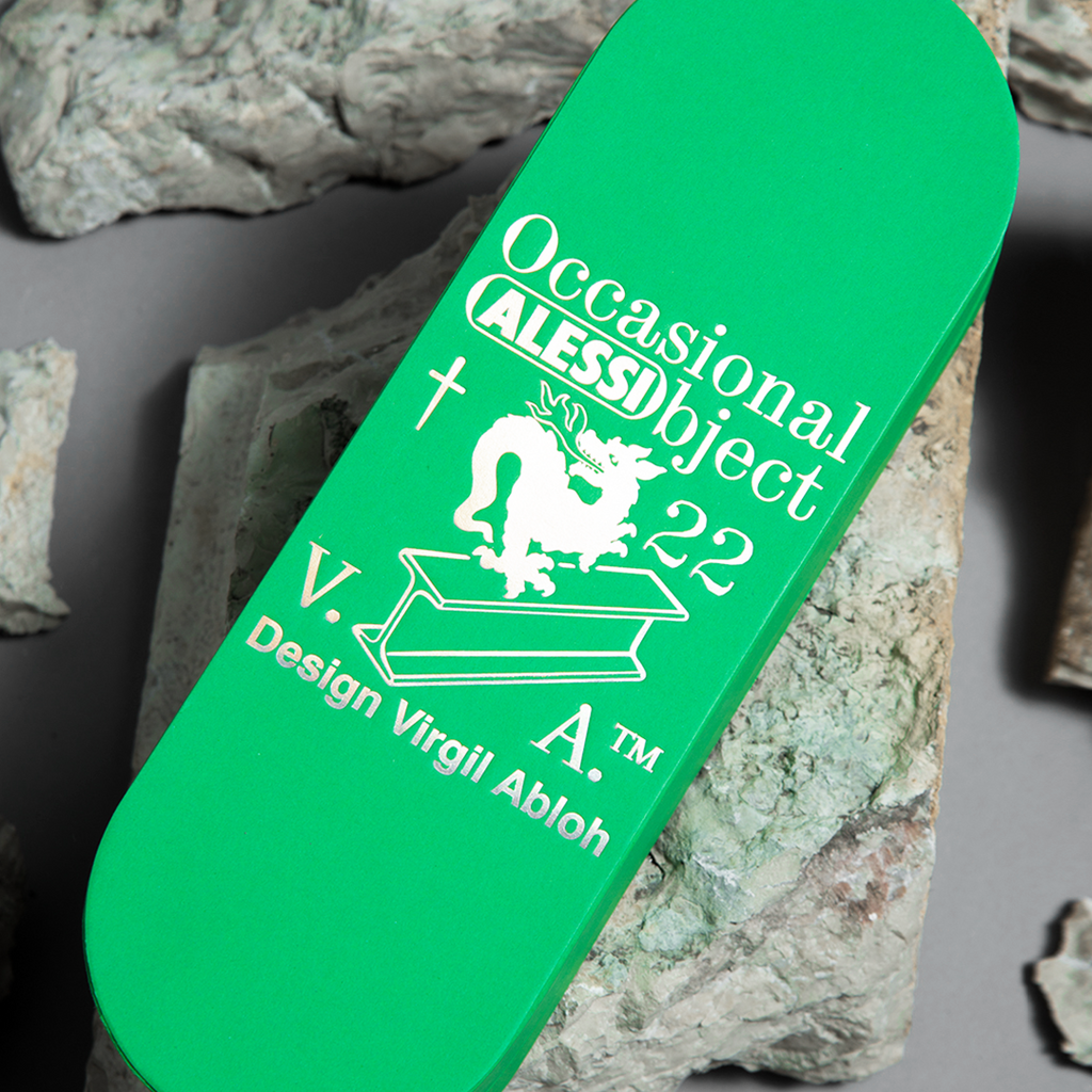 The classic 'mise en place' of cultery is deconstructed by the artist genius of Virgil Abloh, who projects it outside its traditional context of use. Occasional Object is a set composed of a knife, fork, spoon, and carabiner which, by fixing all three elements together, transforms cutlery into a personal accessory.