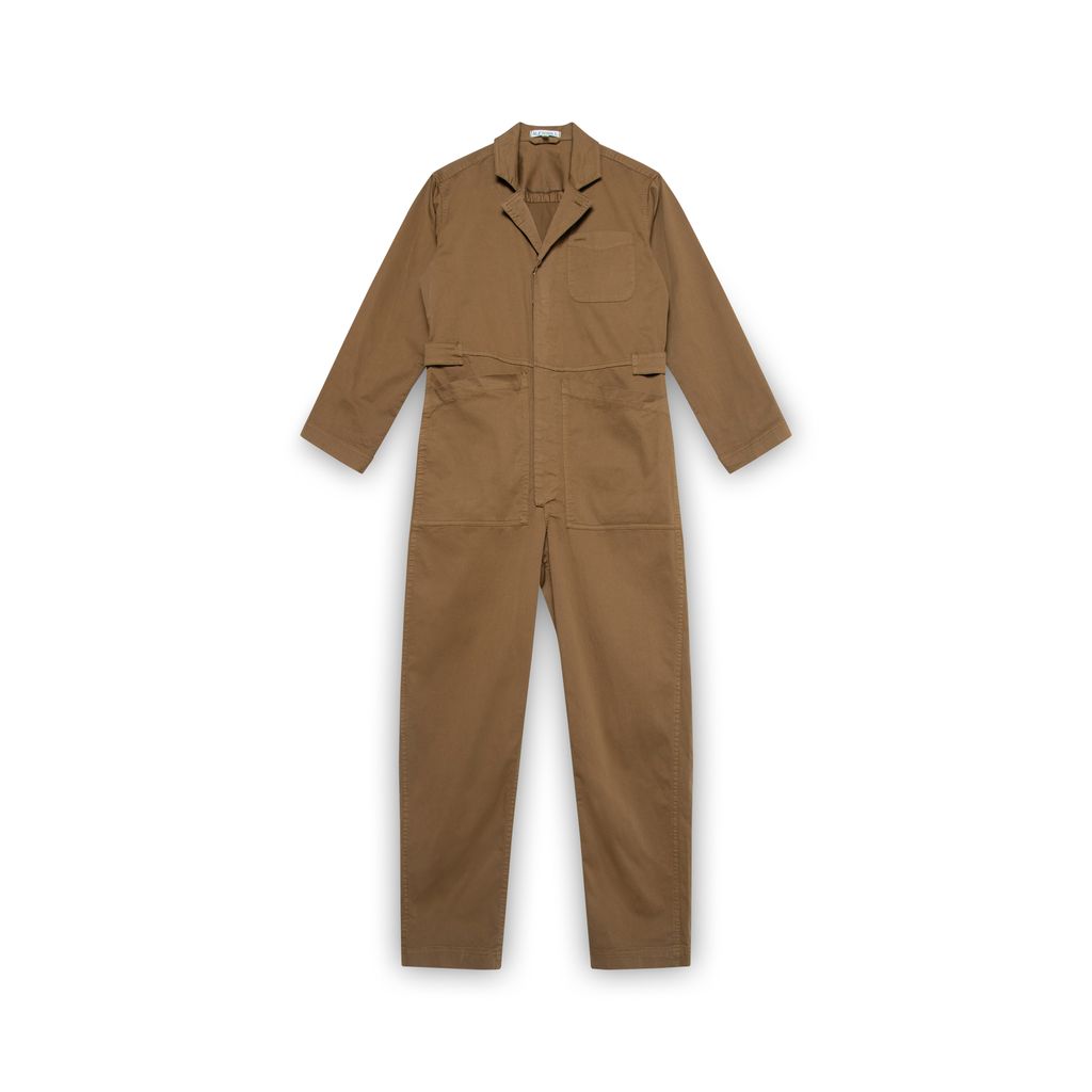 Alex Mill Standard Jumpsuit in Cotton Twill features slightly cropped leg, adjustable tabs at waist, 4 pocket design, and button front closure.